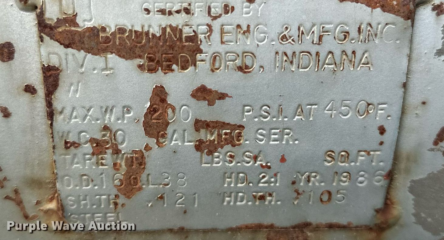 1986 Brunner air compressor. Engine. Kohler, Cylinders: 1, Fuel type: Gas. Features Air compressor Pump model: R15, PSI: 200, Tank capacity: 30 gallons. Notes Unknown operating condition. 113632 S 4203 Rd. Checotah, OK 74426