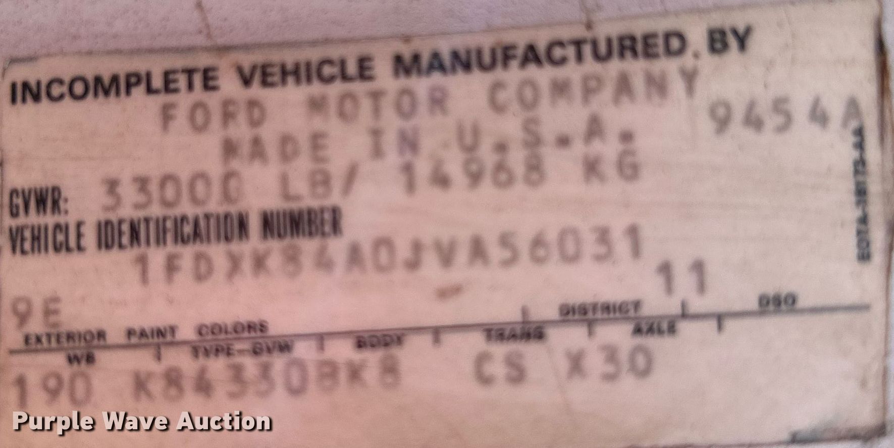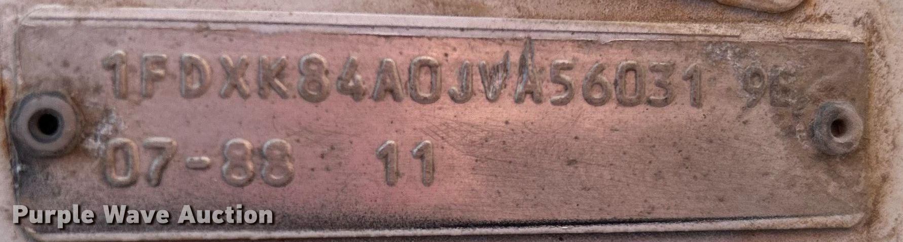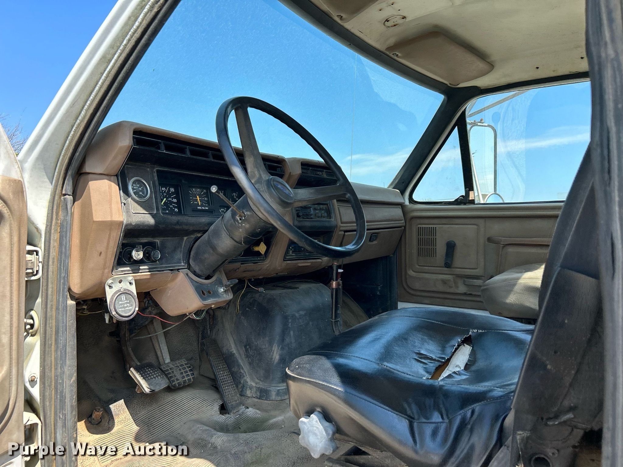 1988 Ford F700 tank truck. Miles: 30,321 on odometer, Hours: 3,640 on meter, VIN: 1FDXK84A0JVA56031, Unit #: 16. Engine Displacement: 7.8L, Cylinders: 6, Fuel type: Diesel. Transmission Manual. Chassis Axles: Single, Suspension: Spring, Brakes: Air, GVWR: 33,000 lbs. Interior Heat. Features Bed / tank Serial: 90-469, Capacity: 1,200 gallons, 12' L x 96" W, Top fill, Sight tube, Rear outlet: 2 1/4". Tires Size: 295/75R2.5. Notes Windshield chipped or cracked, Dash Damaged, Sight tube cracked. Oklahoma title. Title distribution may be delayed up to 14 days from verification of funds. Senax Inc.. 65 County Road 2173. Hominy, OK 74035