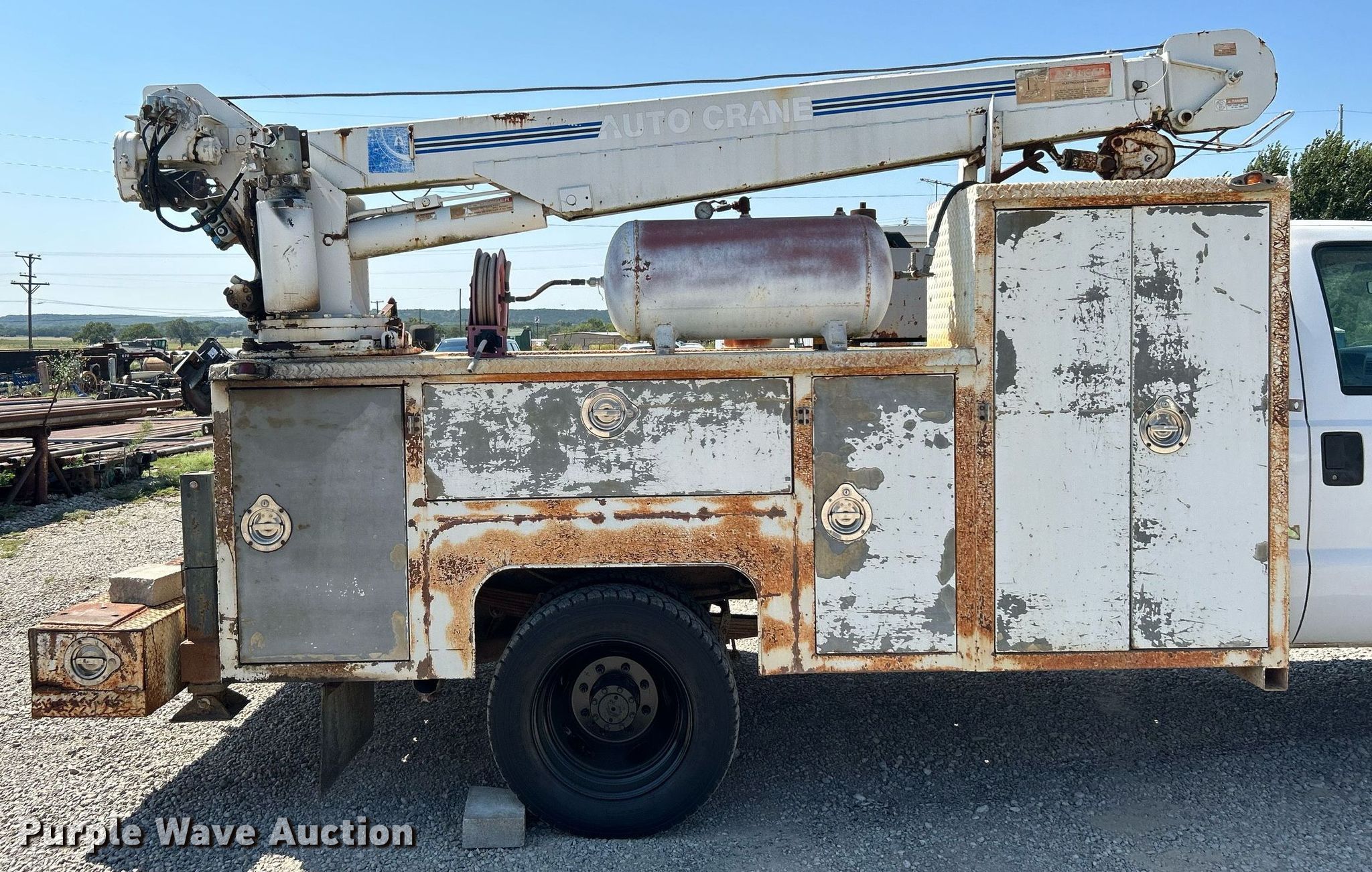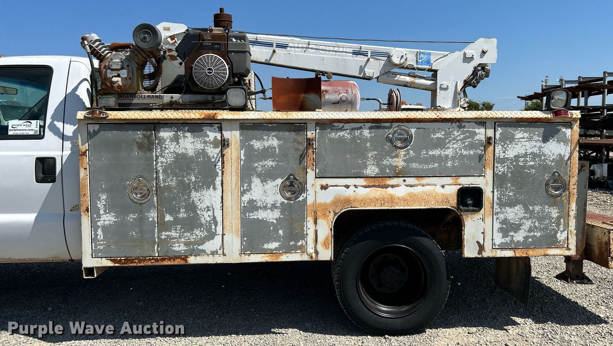 1999 Ford F550 Super Duty utility / service truck. Miles: 173,195 on odometer, VIN: 1FDAF56F9XEE07836, Unit #: 09. Engine Displacement: 7.3L, Cylinders: 8, Fuel type: Diesel. Transmission Manual, Speed: 5. Chassis Axles: Single, Suspension: Spring, Brakes: Hydraulic, GVWR: 17,500 lbs, Wheelbase: 165". Interior AC, Heat. Features Bed Caseco 84.52.LB.SD, 11' L x 96" W, Air compressor Ingersoll Rand T30, Kohler Command 12.5, Crane Auto Crane 6006EH, Maximum boom length: 23' Maximum lift capacity: 6,000 lbs.. Tires Size: 225/79R19.5. Notes Blower motor issues, Non-operational air compressor in crane. Oklahoma title. Title distribution may be delayed up to 14 days from verification of funds. Senax Inc.. 65 County Road 2173. Hominy, OK 74035