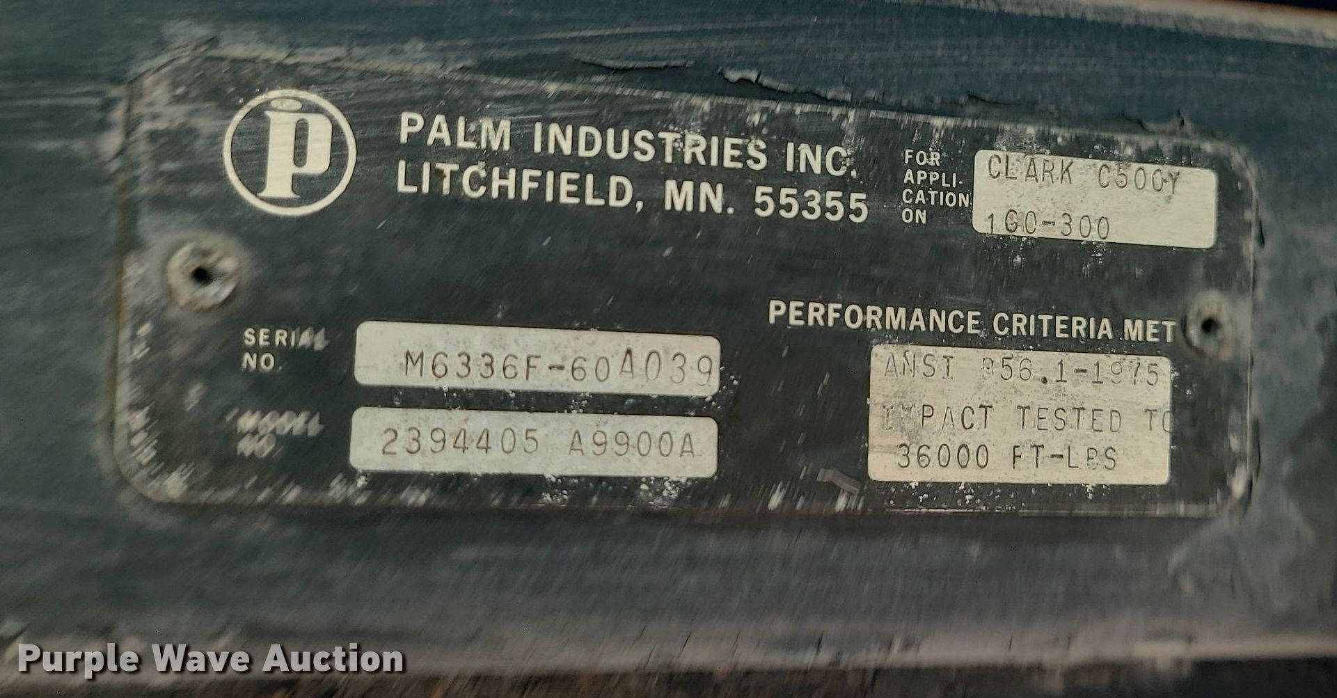 Clark C500Y300PK forklift. Hours: 5,382 on meter, Miles or hours may vary, unit still in use, Serial: Y1625837015CB. Engine Cylinders: 6, Fuel type: Diesel. Transmission Powershift, 3F - 3R. Operators station Enclosed cab. Features Side shift, Mast tilt, Fork length: 96". Tires Size: 11-20. Notes Glass cracked. Odessa, MO 64076