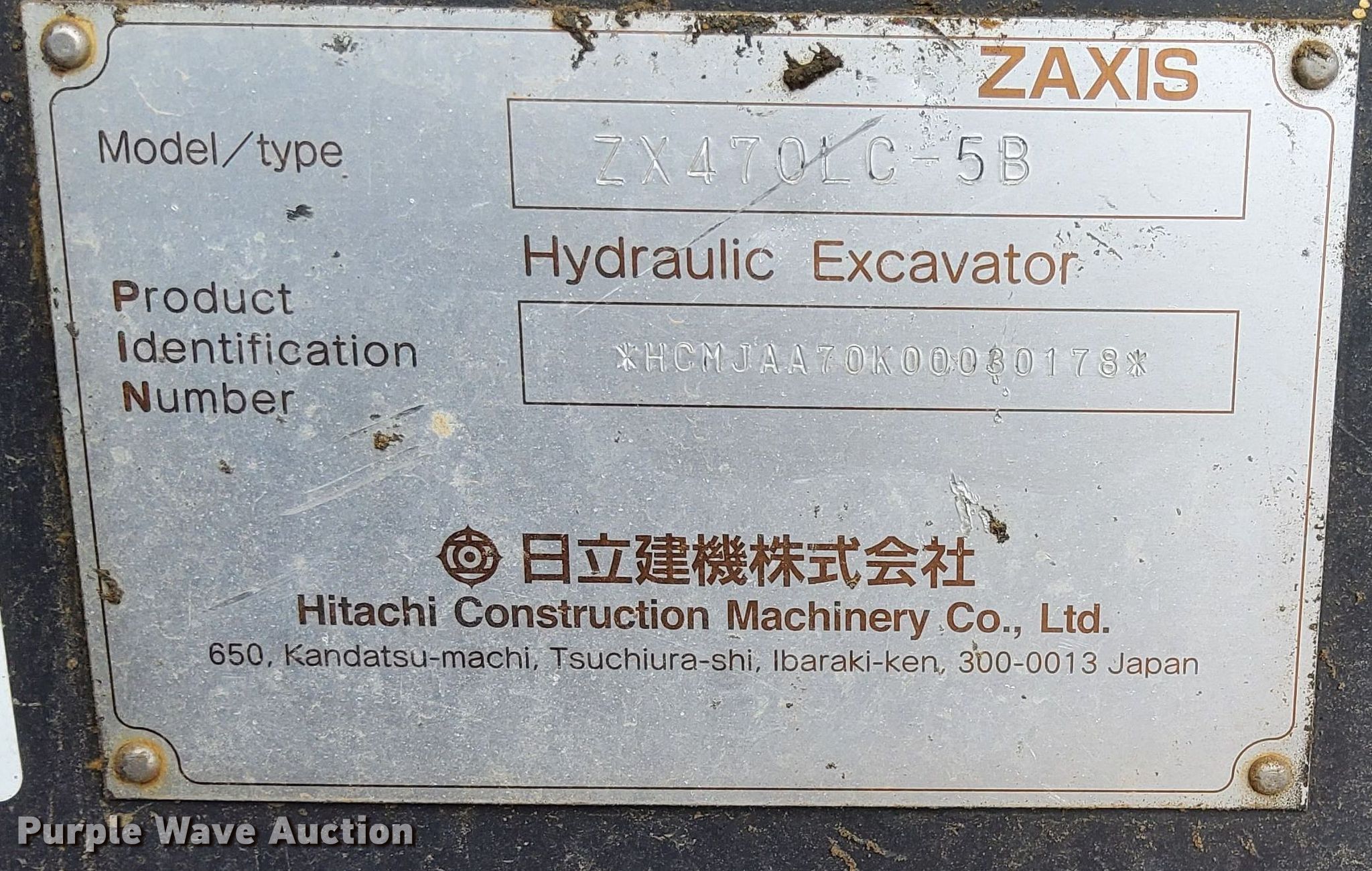 Purple Wave is selling a used Hydraulic Excavator in Colorado. This item is a 2013 Hitachi ZX470LC-5B excavator with the following: Hours: 9,417 on meter, Serial: HCMJAA70K00030178
