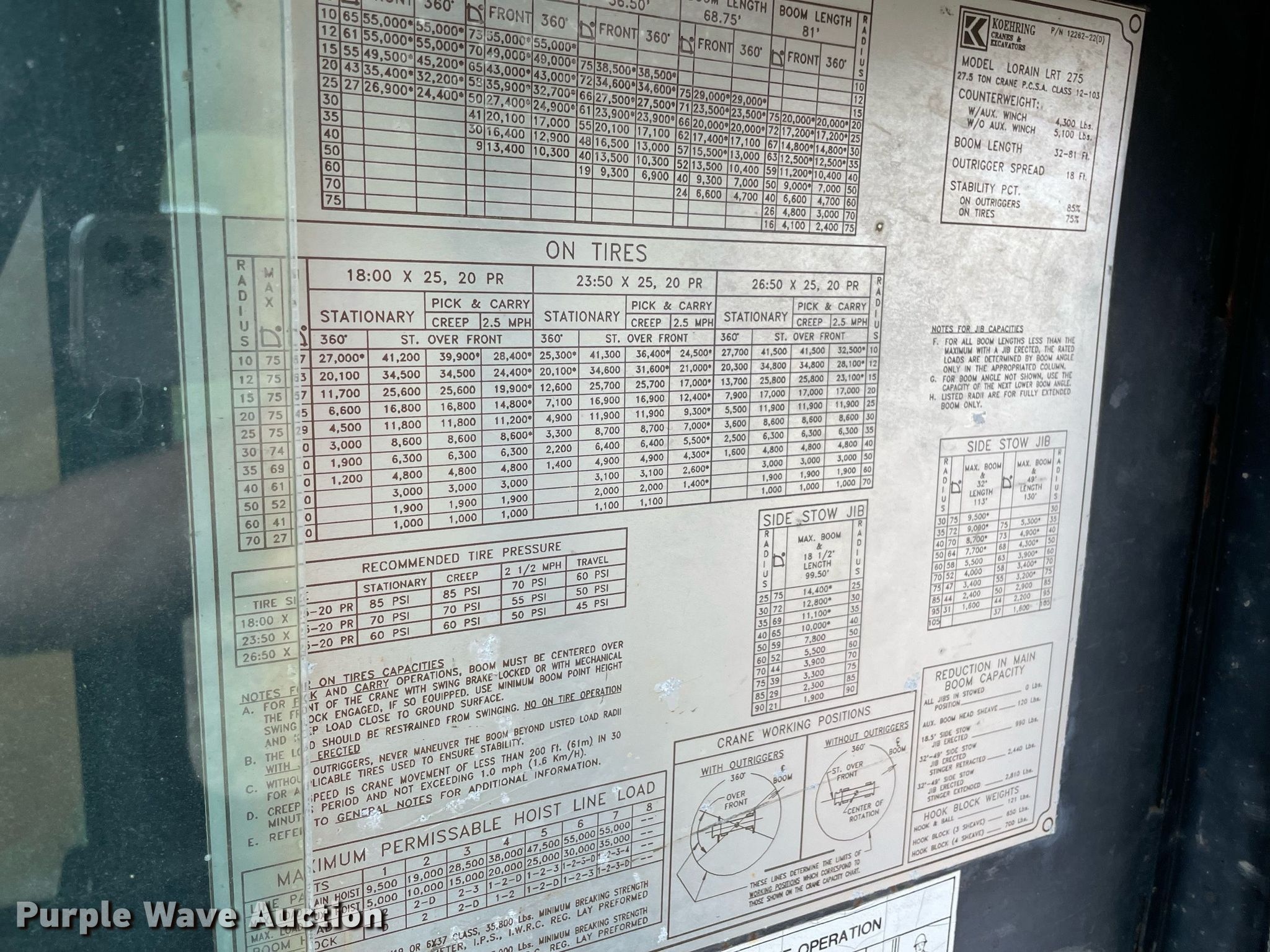Take a look at this used Lorain LRT-275 crane being sold on October 12th, 2023 in the SOLD! October 12 Construction Equipment Auction made by Lorain. Take a look at all of the item information below or take a look at similar auctions for Cranes.