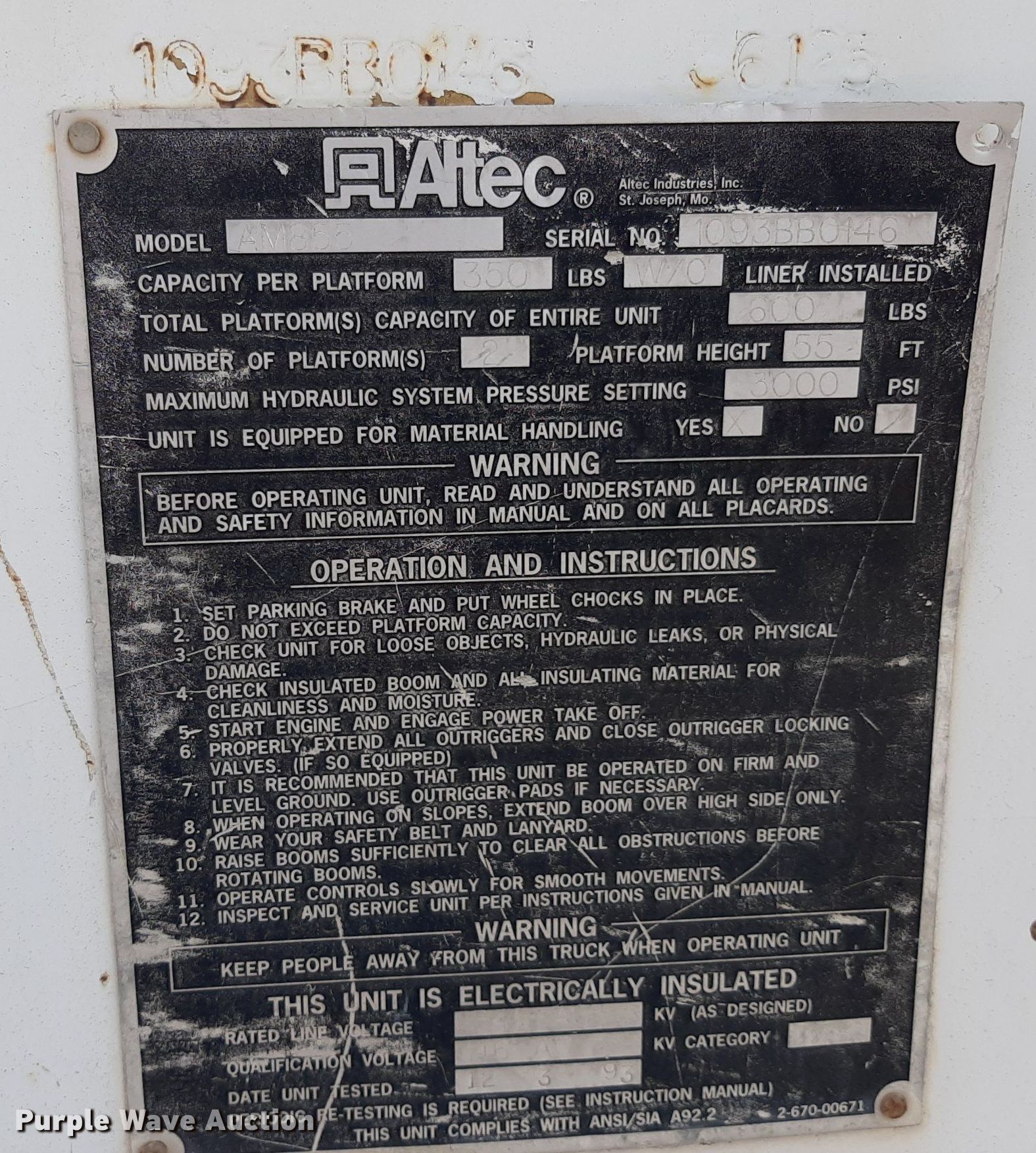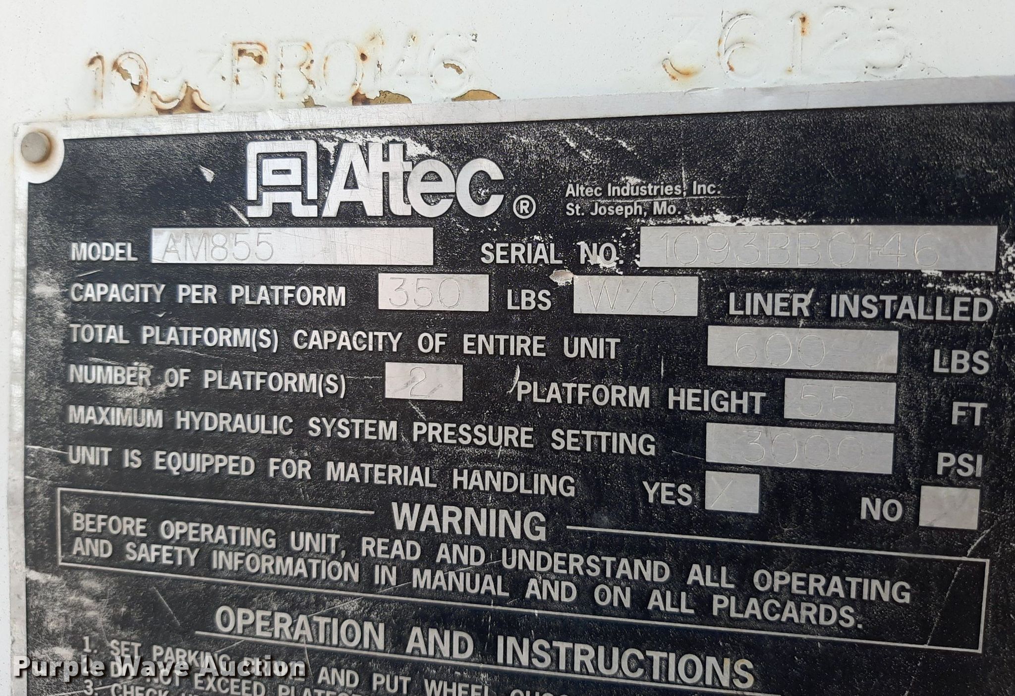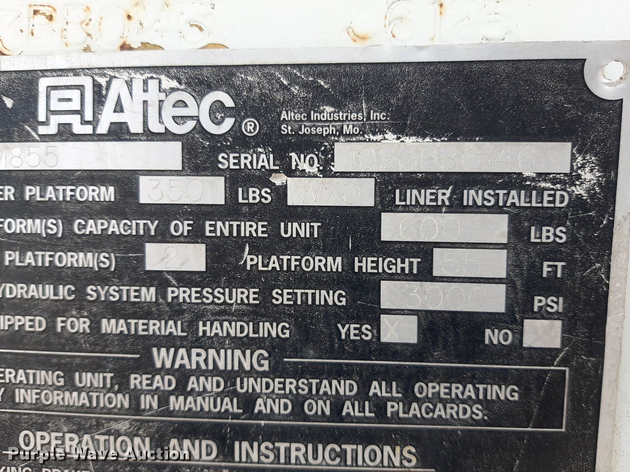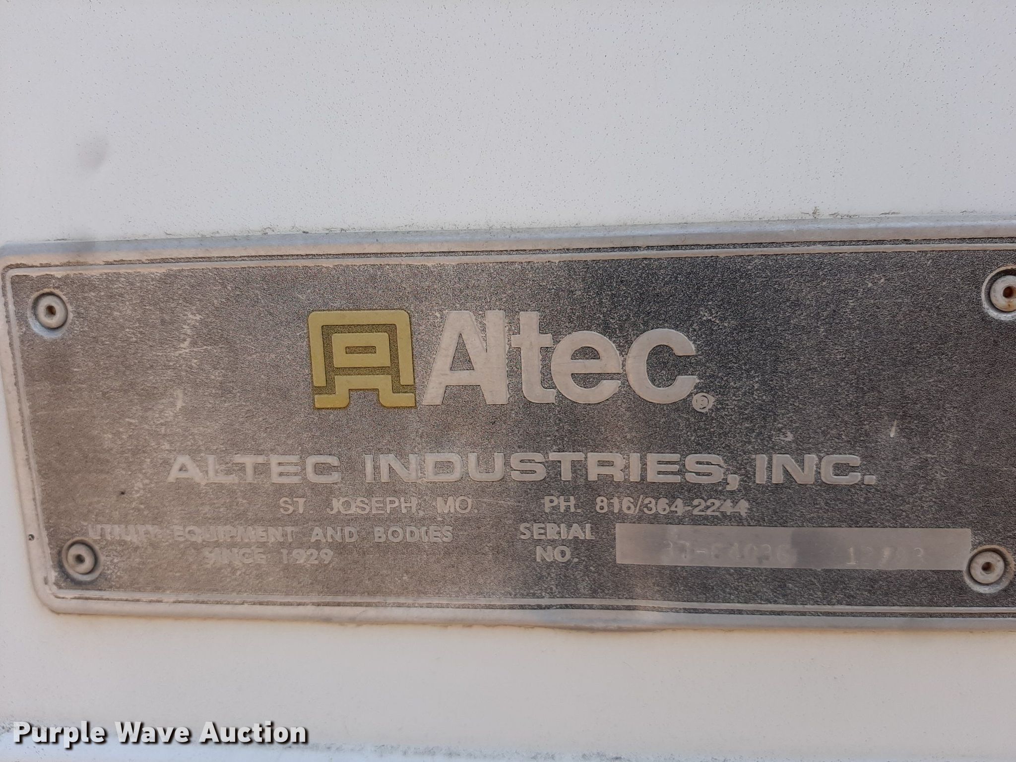 1994 Chevrolet Kodiak bucket truck. Miles: 158,238 on odometer, Hours: 12,211 on meter, VIN: 1GBS7H4J6RJ103036. Engine Caterpillar 3116, Displacement: 6.6L, Cylinders: 6, Fuel type: Diesel. Transmission Eaton Fuller, Manual, Speed: 10. Chassis Axles: Tandem, Suspension: Spring over walking beam, Brakes: Air, GVWR: 46,080 lbs. Interior AC, Heat. Features Bed Altec, 16' 4" L x 94" W, Boom Altec AM855, Serial: 1093BB0146, Maximum lift capacity: 600 lbs, Maximum lift height: 55', Boom type: Articulating, Insulated, Man basket, Boom controls Ground, Platform/ basket, Material handler. Tires Size: 10.00R20. Oklahoma title. Seller is a licensed motor vehicle dealer. The buyer may be required to pay sales tax and/or registration fees to the dealer prior to taking possession. Title will be assigned and distributed by the dealer. Please contact the seller for distribution questions. Ireland Sales LLC. 6350 North Broadway Avenue. Park City, KS 67219