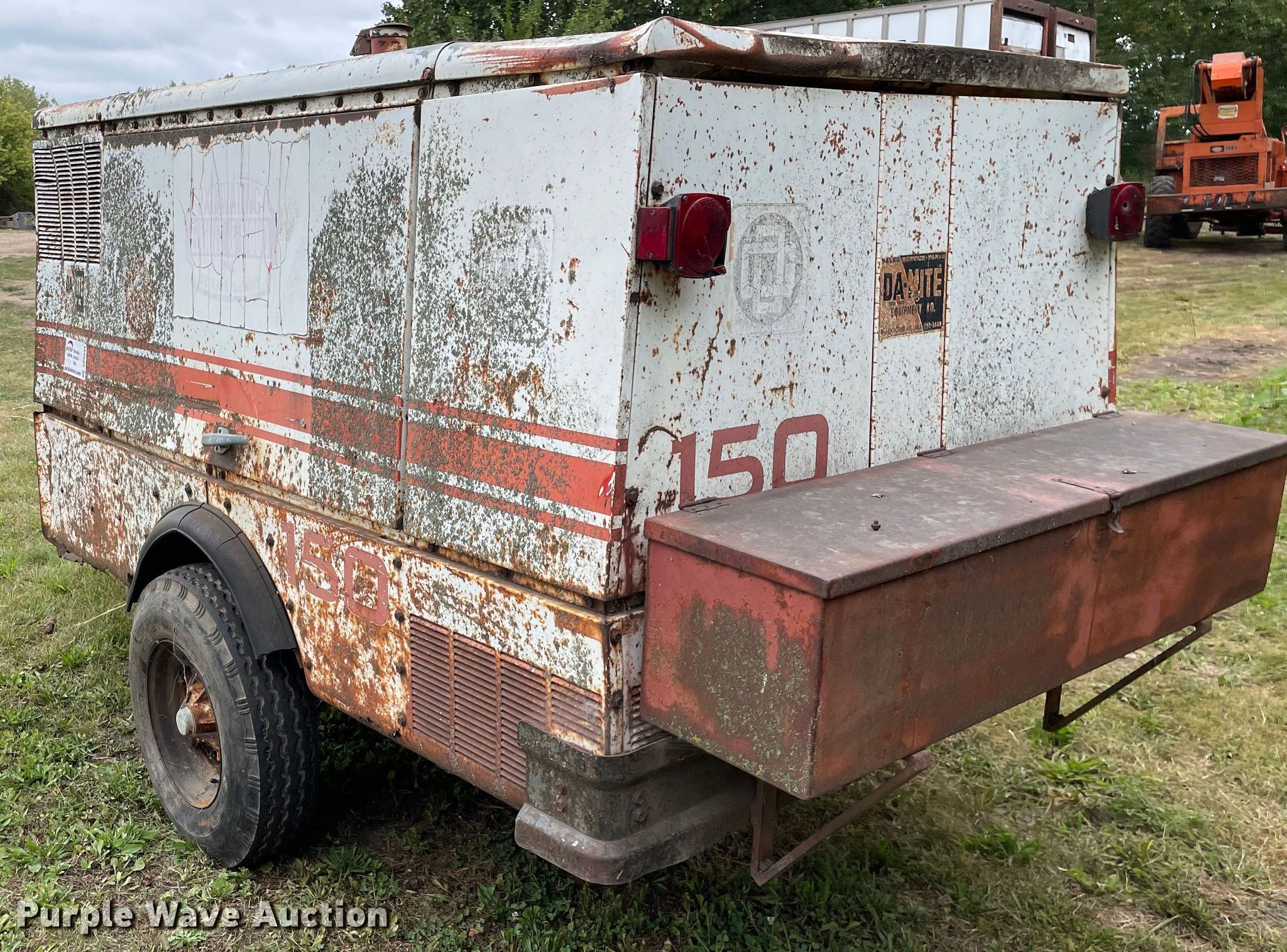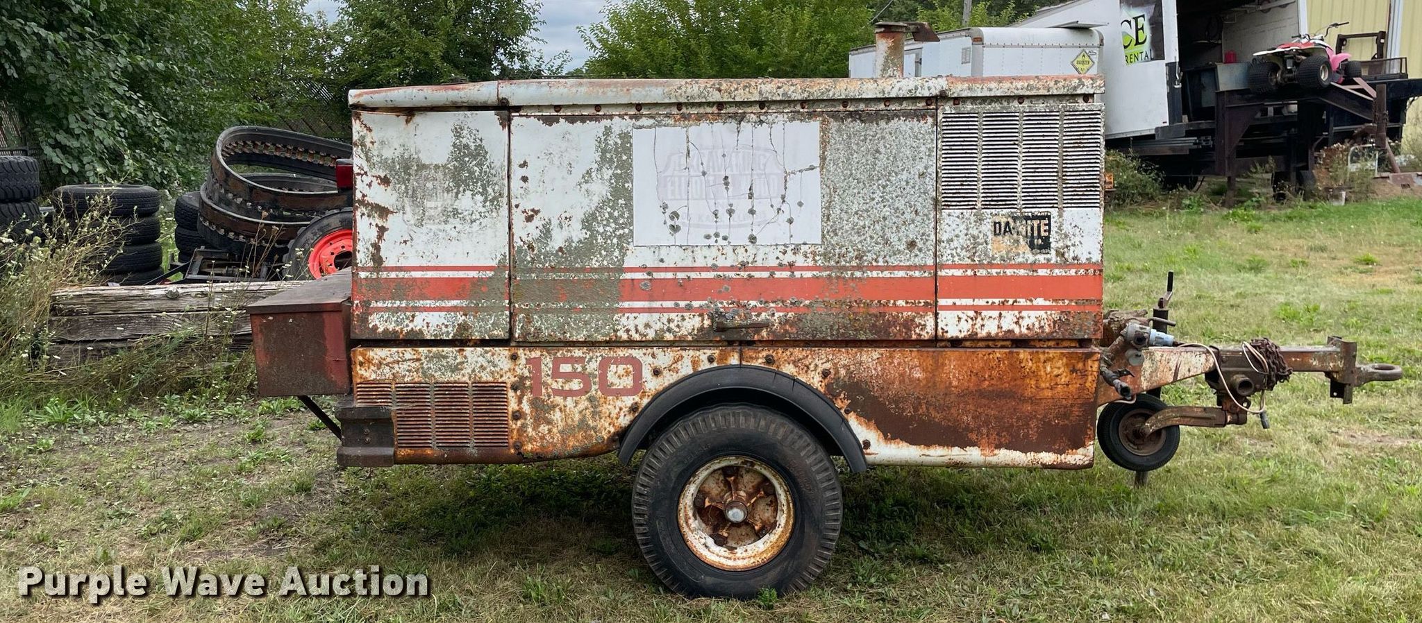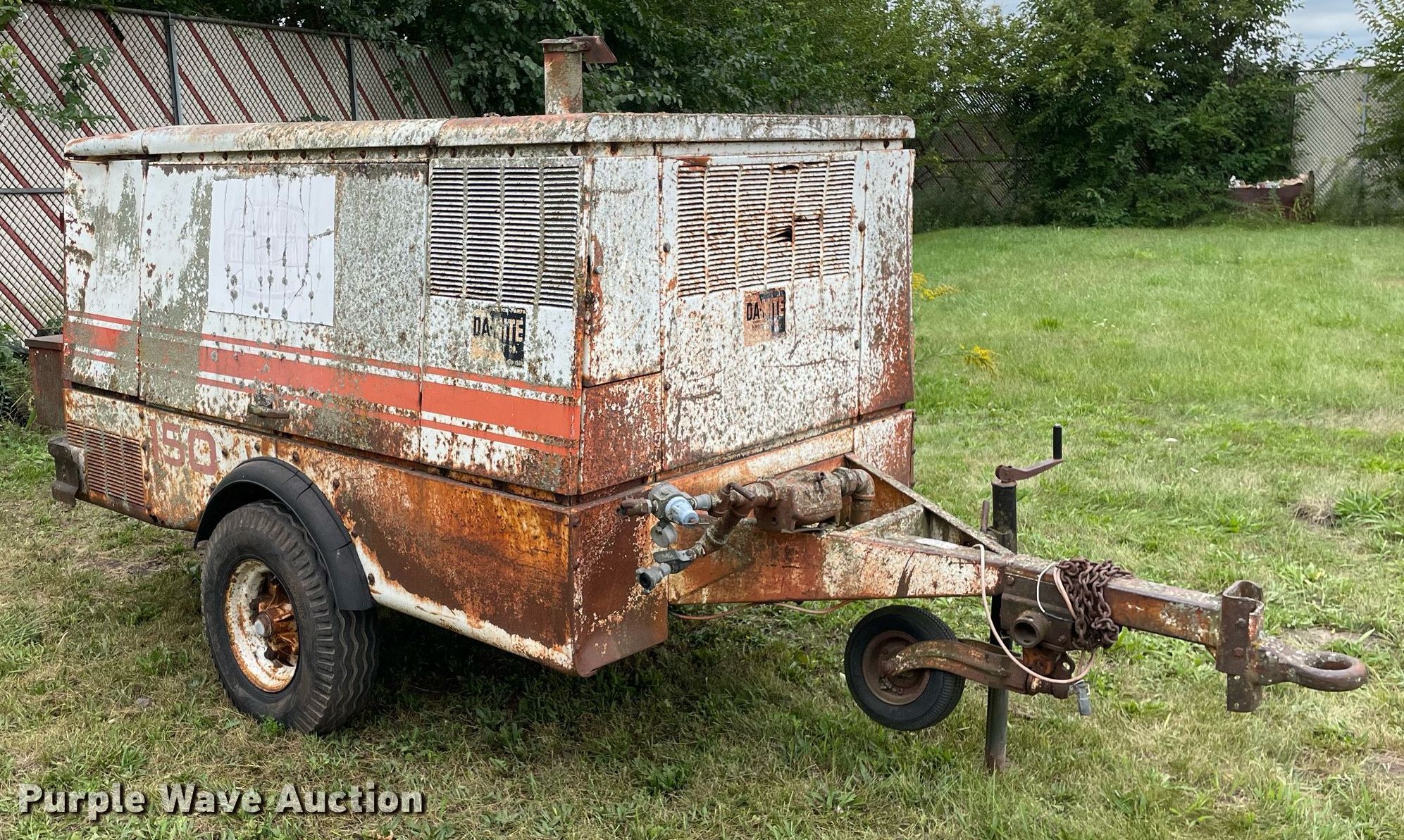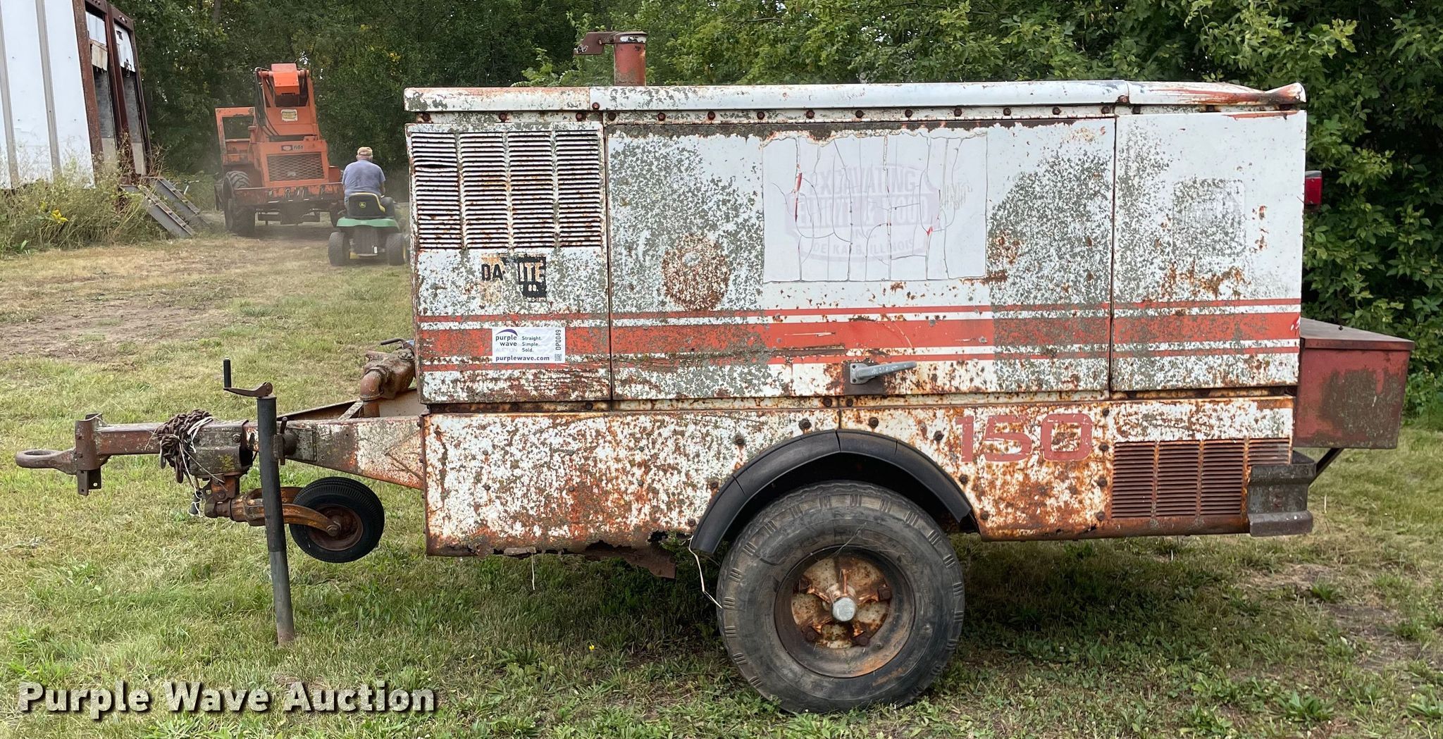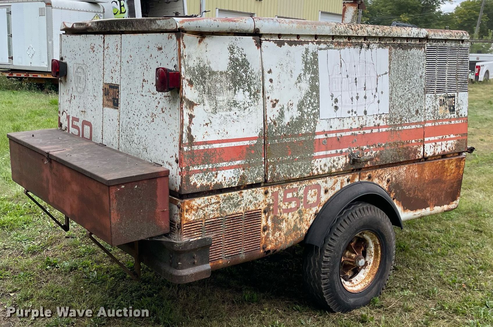 Gardner Denver Company 150 air compressor. Hours: 1,736 on meter. Engine John Deere , Cylinders: 3, Fuel type: Diesel. Features Air compressor CFM: 150. Trailer 13' 6" L x 68" W, Suspension: Spring, Axles: Single, Tire size: 8-14.5. Notes Contents included. Transfer of ownership documentation will be a bill of sale. 19982 Webster Road. DeKalb, IL 60115