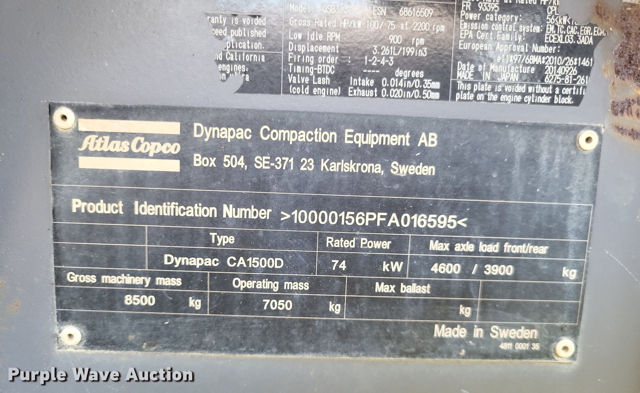 Purple Wave is selling a used Single Drum Roller Compactor in Louisiana. This item is a Atlas Copco CA 1500 single drum vibratory roller with the following: Hours: 487 on meter, Serial: 10000156PFA016595