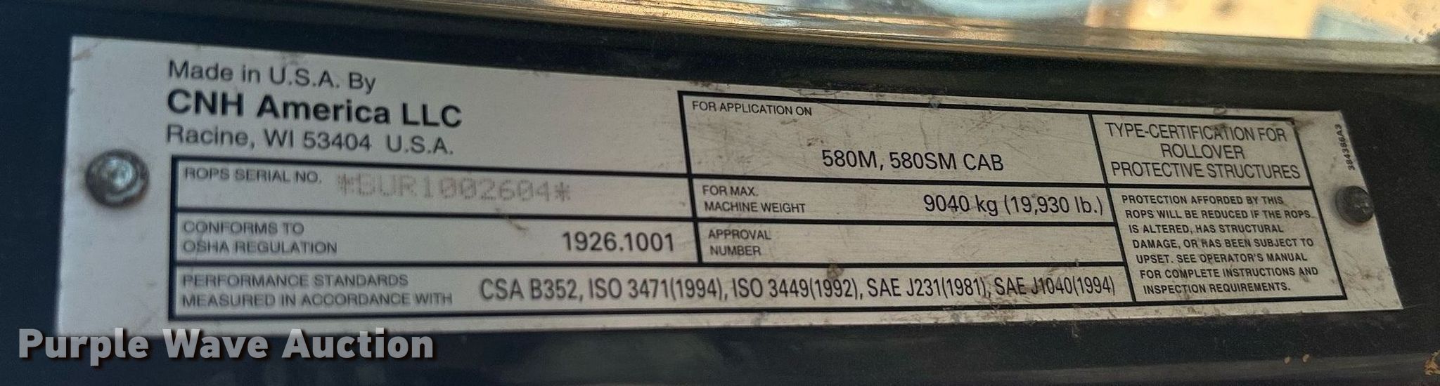2010 Case 580 Super M backhoe. Hours: 7,380 on meter, Serial: JJGN580SCAC531423. Engine Case, Cylinders: 4, Fuel type: Diesel. Transmission Shuttle shift, 4F - 4R. Chassis Four wheel drive. Operators station Enclosed cab, AC, Heat, Backhoe controls: Four stick. Features Loader Auxiliary hydraulics, Bucket Width: 82", Cutting edge: Bolt-on, Backhoe Extendable stick, Auxiliary hydraulics, Bucket Width: 30", Cutting edge: Weld-on.. Tires Front: 12-16.5, Rear: 19.5L-24. Rural Excavating. 5950 Hwy 80. Platteville, WI 53813