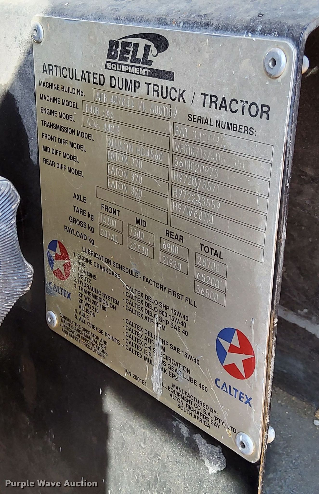 1998 Bell B40B haul truck. Hours: 8,201 on meter, Serial: BAT3420. Engine Cylinders: 8, Fuel type: Diesel. Transmission Automatic. Chassis Six wheel drive. Interior Heat. Features Dump bed Capacity: 40 tons. Tires Size: 29.5R25. Notes Brake issues , Non-operational unit. Riverview Stone LLC. 20344 Harveyville Road. Harveyville, KS 66431