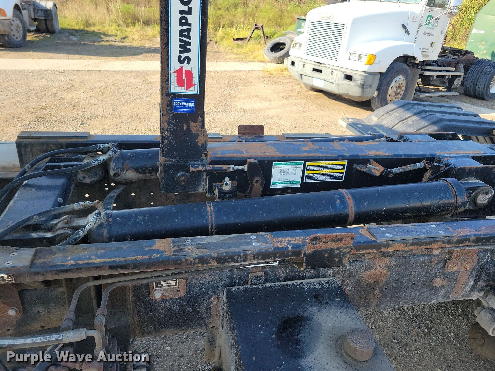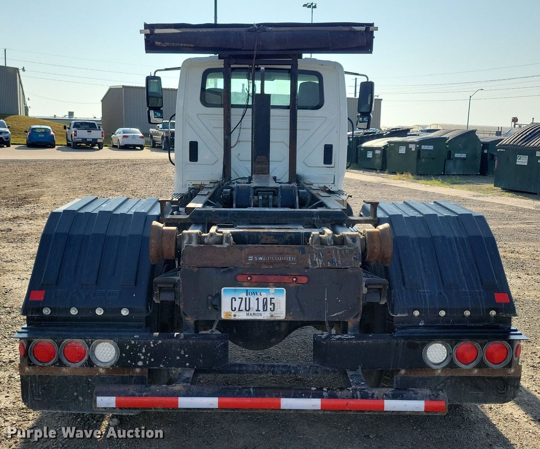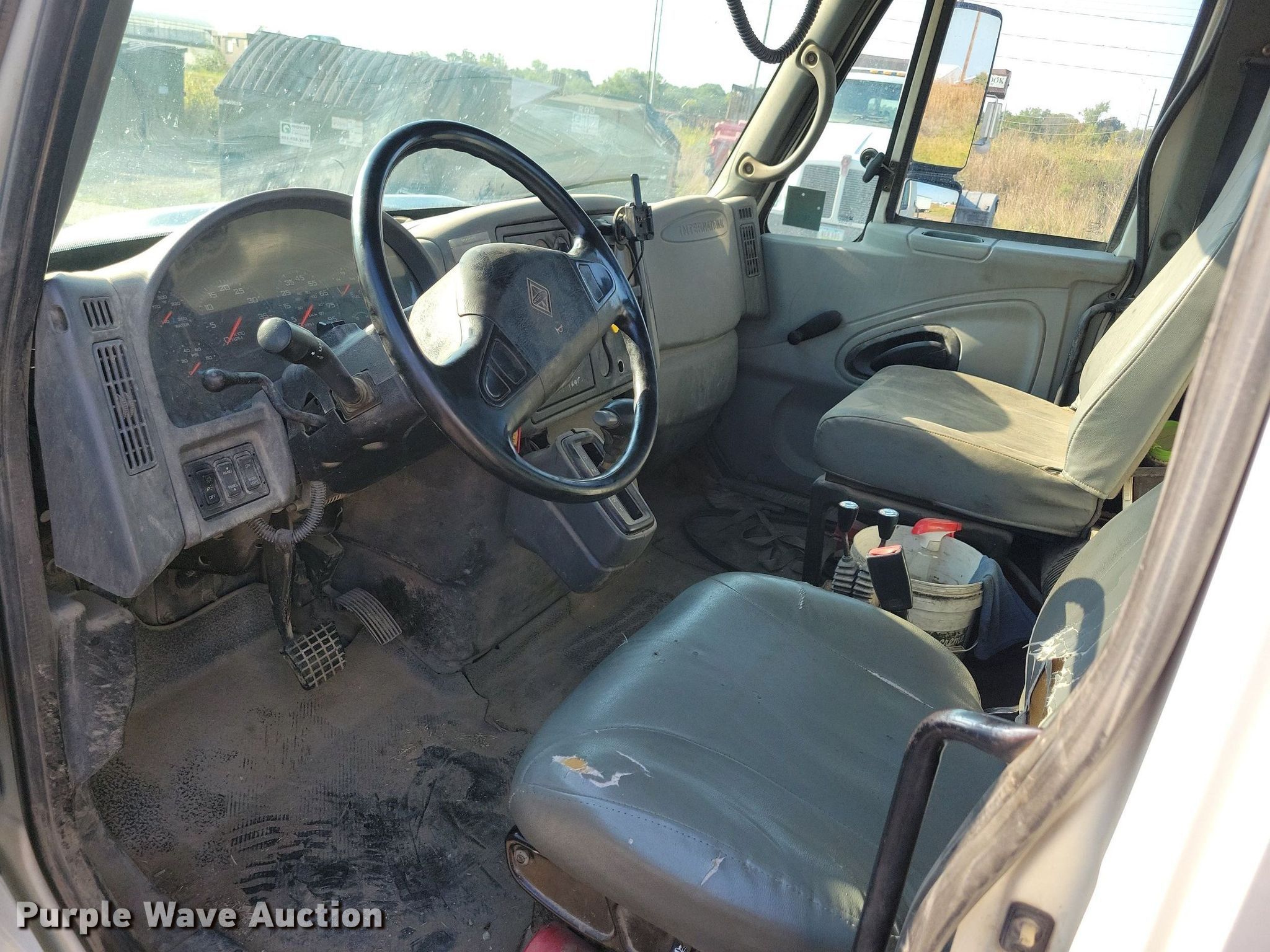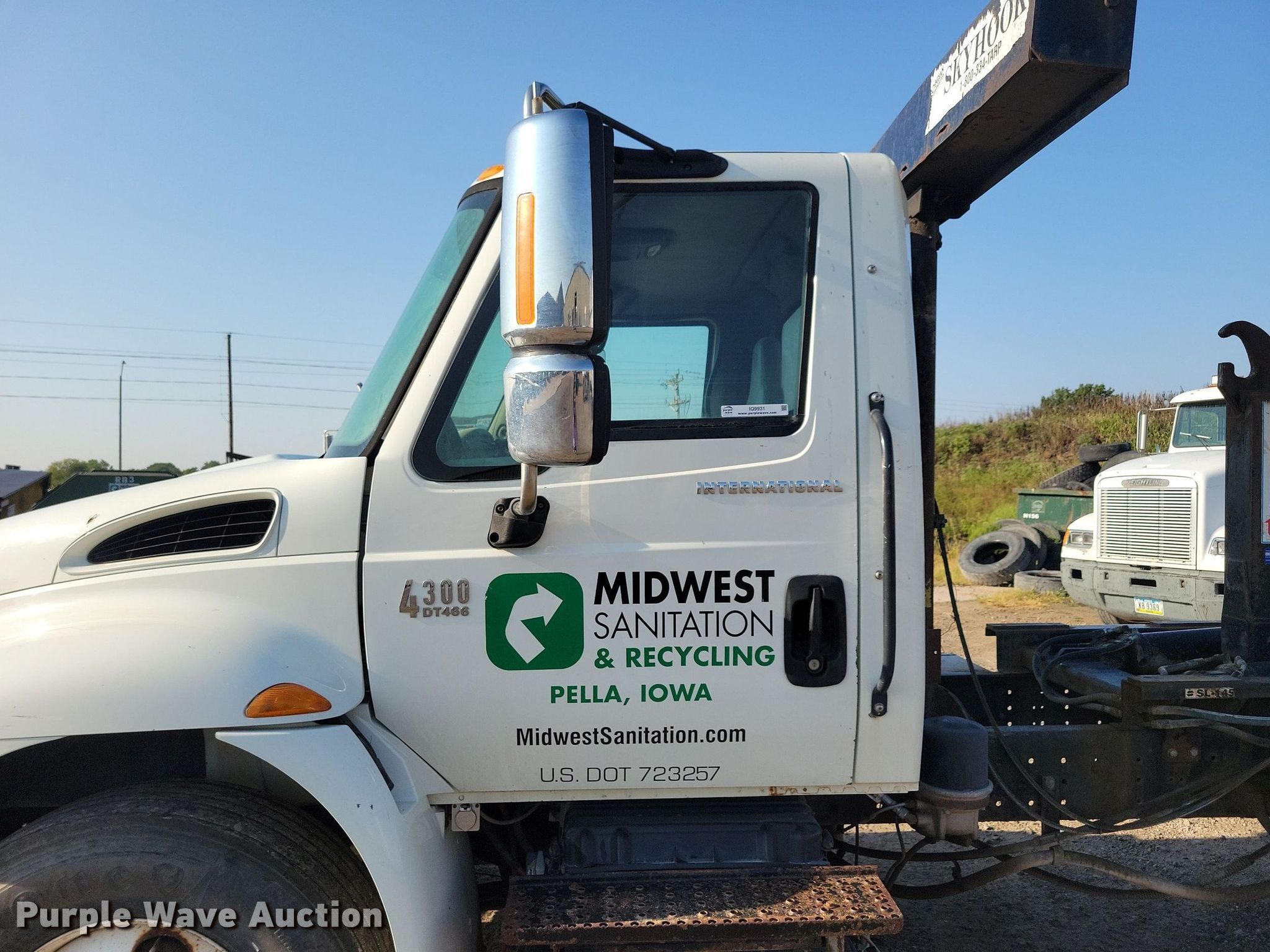 2007 International 4300 hook lift truck. Miles: 173,720 on odometer, VIN: 1HTMMAAN87H366566, Unit #: 114. Engine International DT466, Cylinders: 6, Fuel type: Diesel. Transmission Automatic. Chassis Axles: Single, Suspension: Spring, Brakes: Air, PTO, Wet kit. Interior AC, Heat, Cruise control, Auxiliary controls. Features Hook lift bed Swaploader SL-145, Serial: VO1002, 12' L x 43" W, Roll tarp, Capacity: 14,000 lbs, Ram: Double. Tires Front: 11R22.5, Rear: 275/80R22.5. Notes Dash warning indicator: ABS. Iowa title. Title distribution may be delayed up to 14 days from verification of funds. Midwest Sanitation & Recycling. 815 W 10th St. Pella, IA 50219