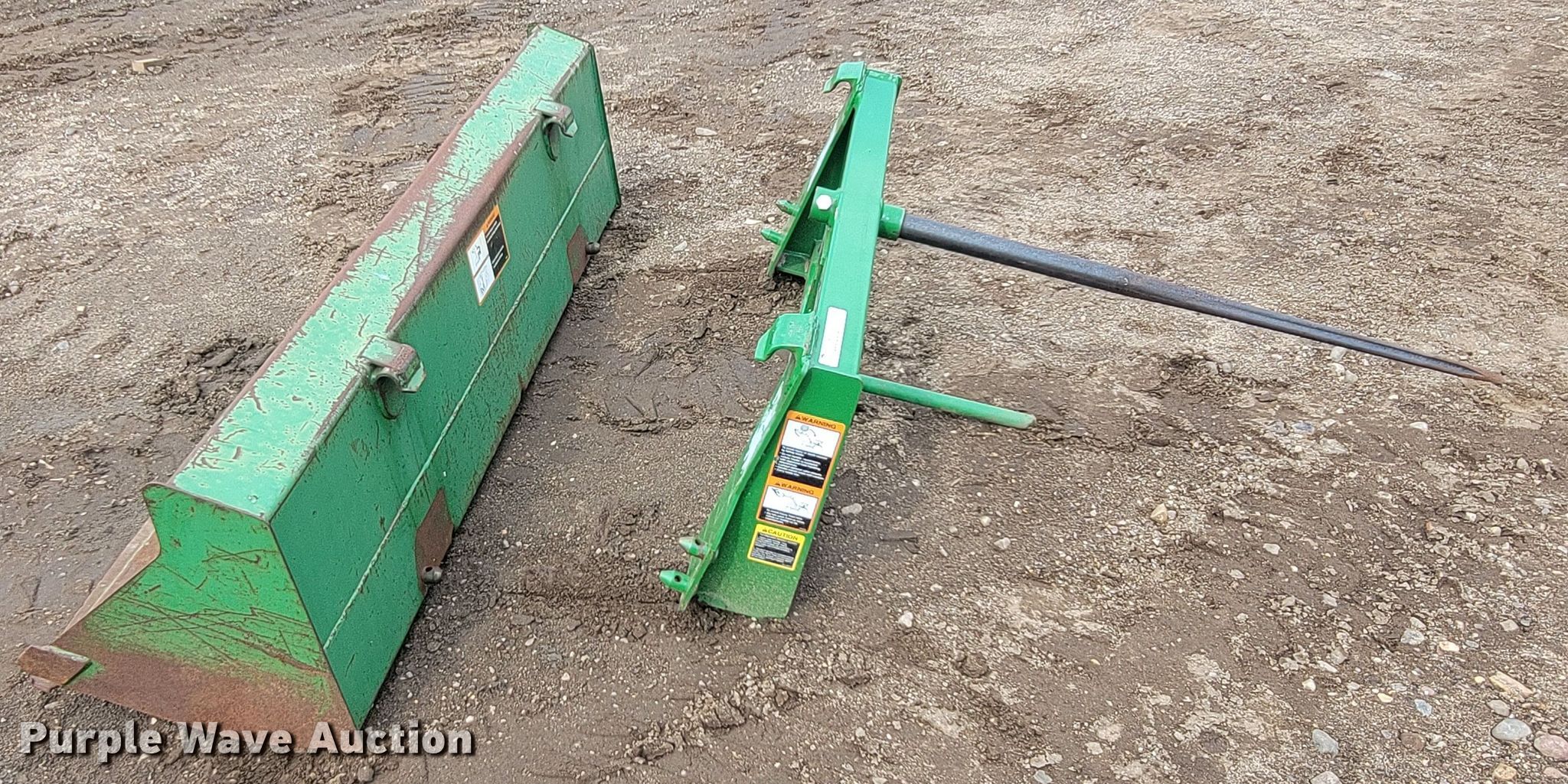 Frontier tractor attachments. Bale spear. Serial: 1XFAB11ELK0007636. Bucket Width: 6'. Pfeifer's Implement. 5301 West 12th Street. Sioux Falls, SD 57106