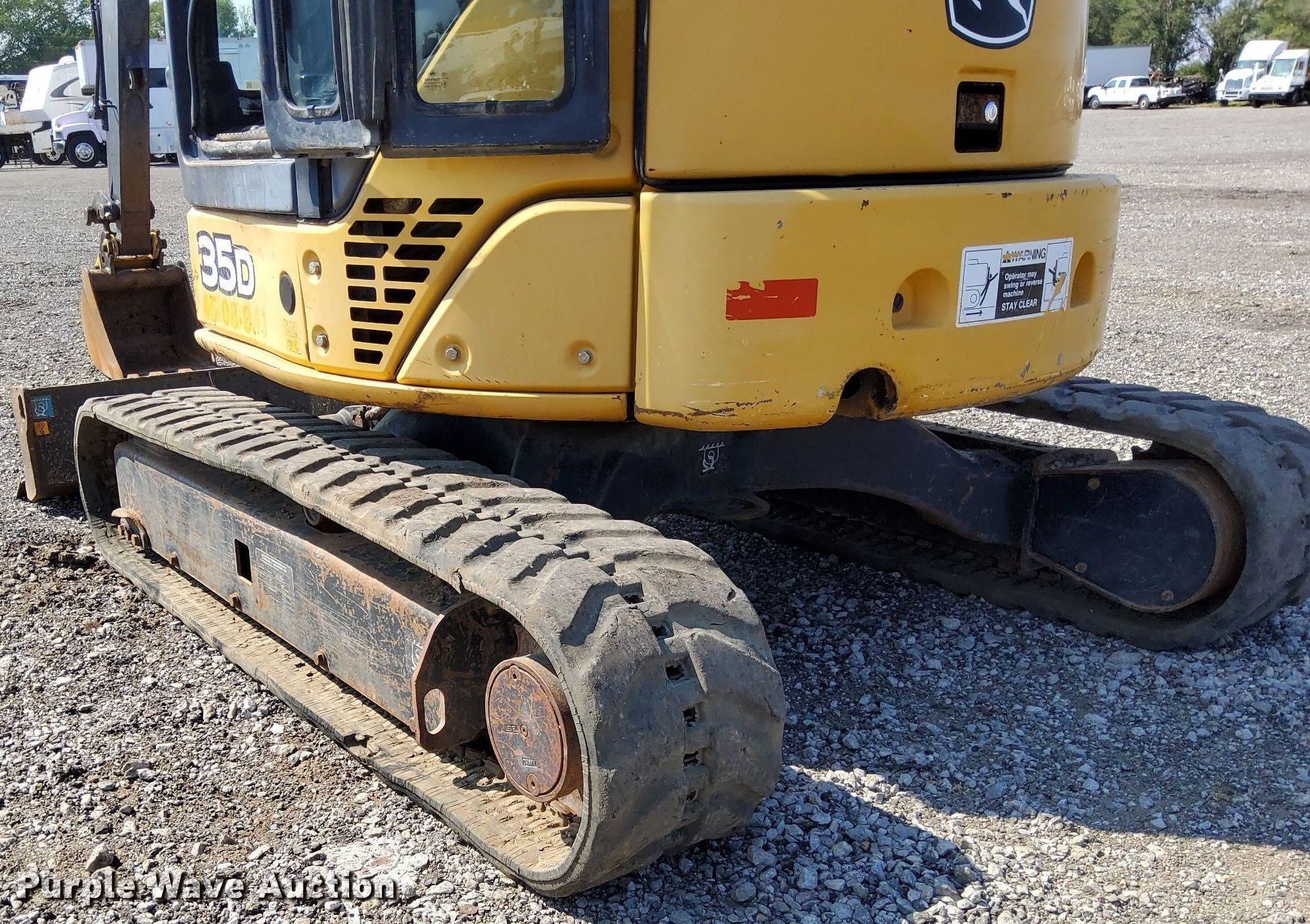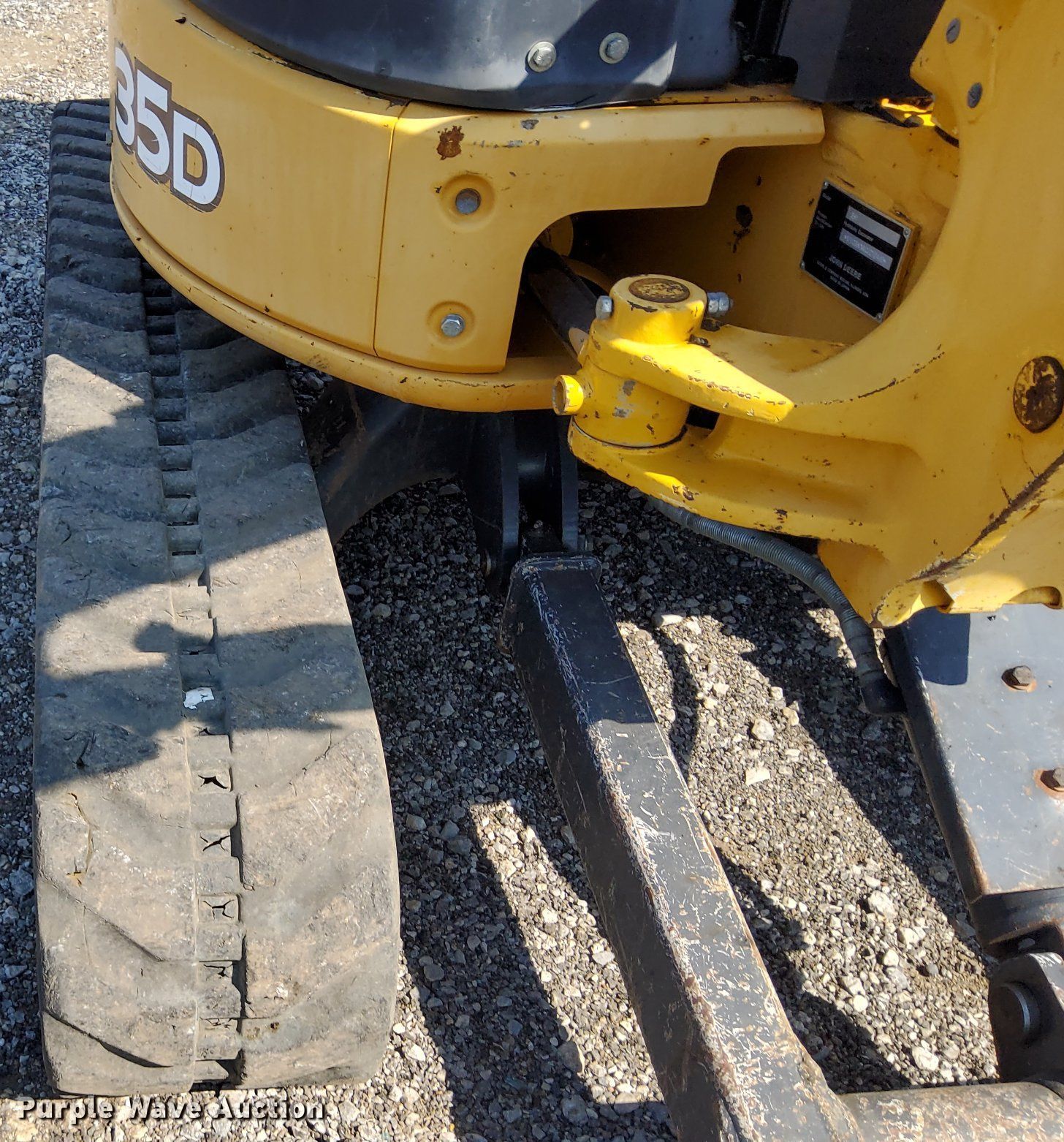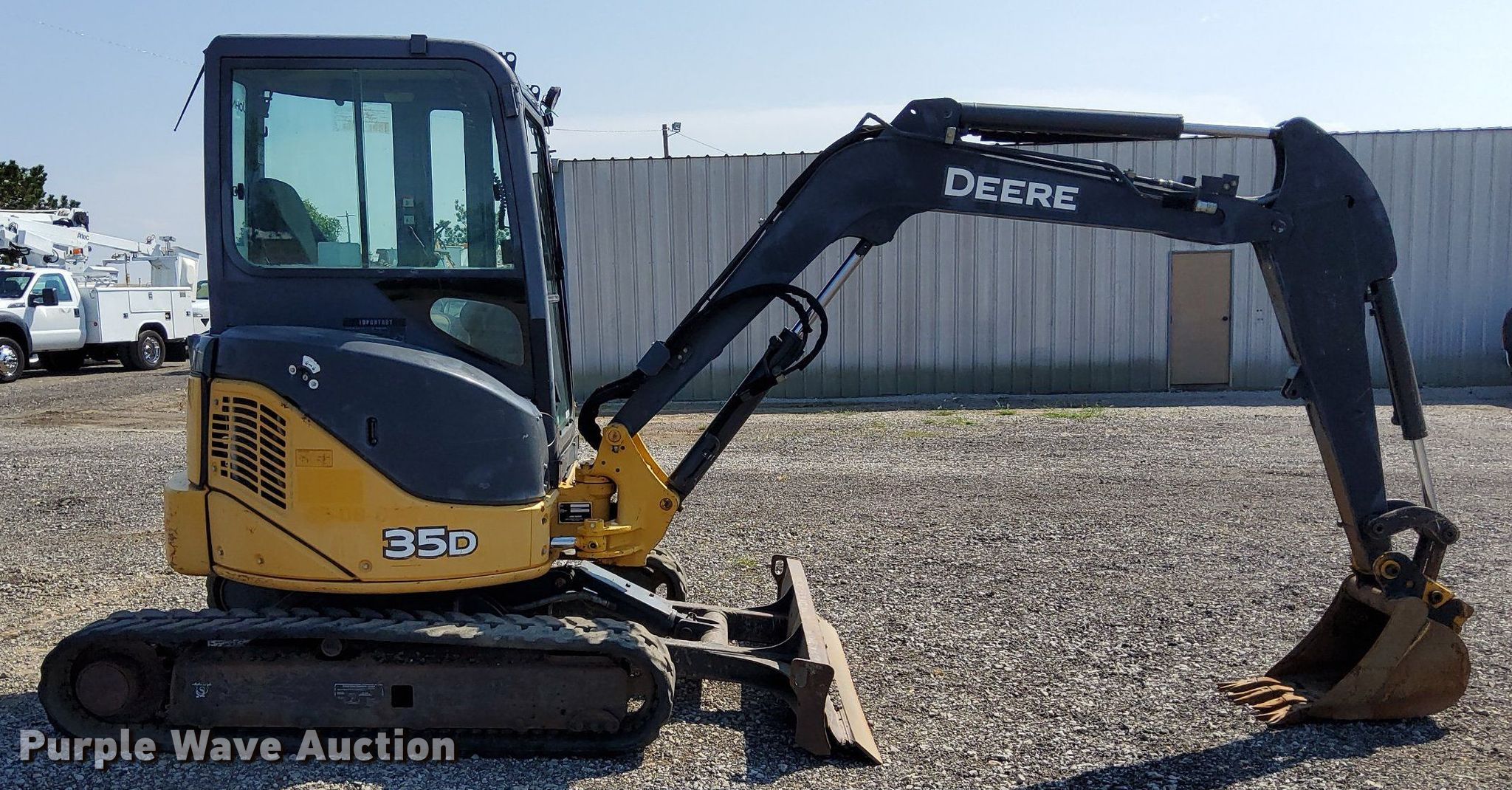 Purple Wave is selling a used Mini Excavator in Oklahoma. This item is a 2013 John Deere 35D mini excavator with the following: Hours: 4,165 on meter, Serial: 1FF035DXVCG270449