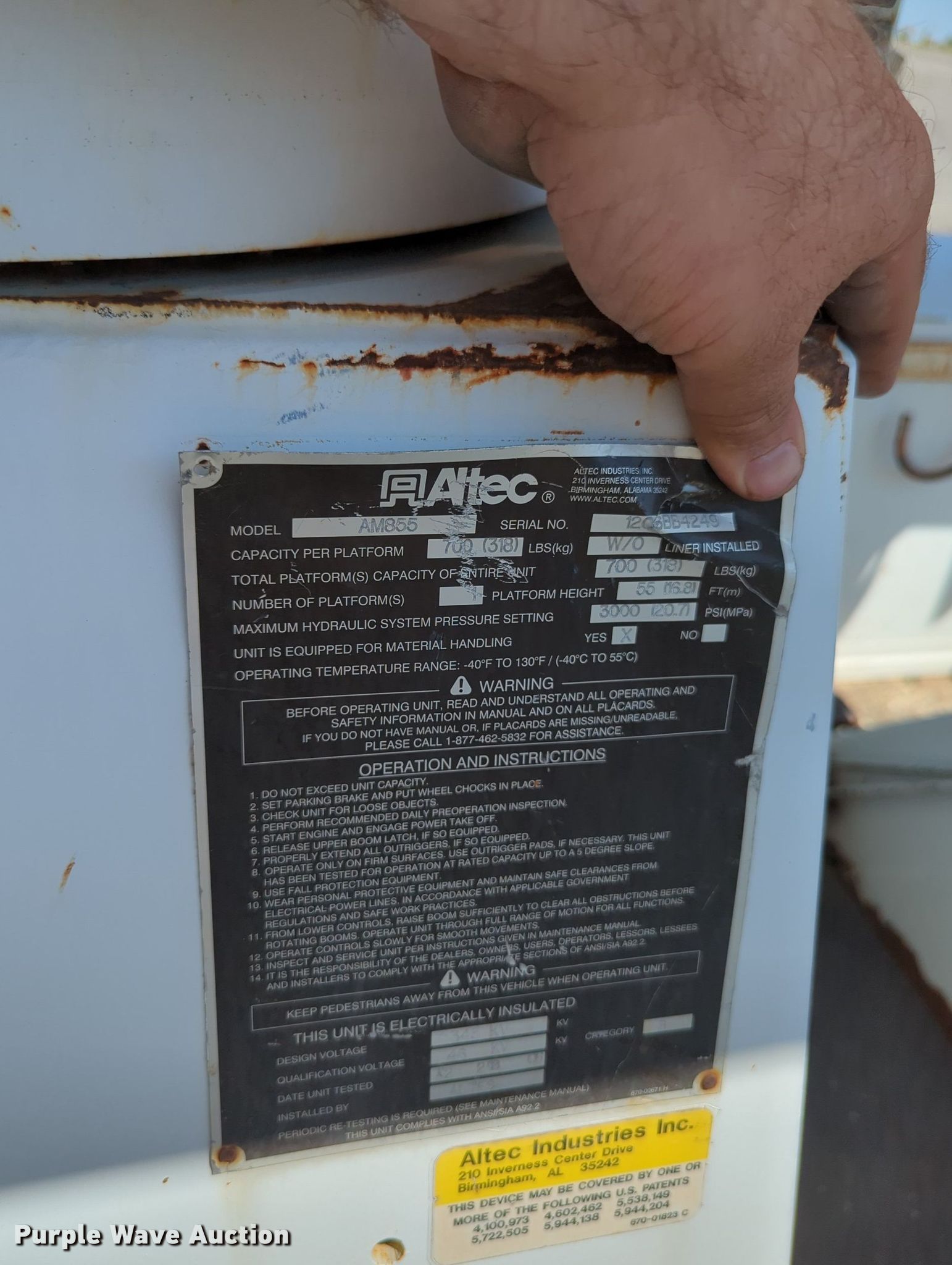 2006 Chevrolet C8500 bucket truck. Miles: 90,078 on odometer, VIN: 1GBS8C4C06F431911. Engine Caterpillar C7, Serial: WAX37578, Displacement: 7.2L, Cylinders: 6, Fuel type: Diesel, HP: 230. Transmission Automatic. Chassis Axles: Tandem, Suspension: Spring over walking beam, Brakes: Air, PTO. Interior AC, Heat. Features Bed 18' L x 96" W, Boom Altec AM855, Serial: 1206bb4249, Maximum lift capacity: 700 lbs, Maximum lift height: 55', Boom type: Articulating, Man basket, Boom controls Ground, Platform/ basket.. Tires Size: 11R22.5. Notes Dash warning indicator: Brake. Oklahoma title. Title distribution may be delayed up to 14 days from verification of funds. 15107 North 137th East Avenue. Collinsville, OK 74021
