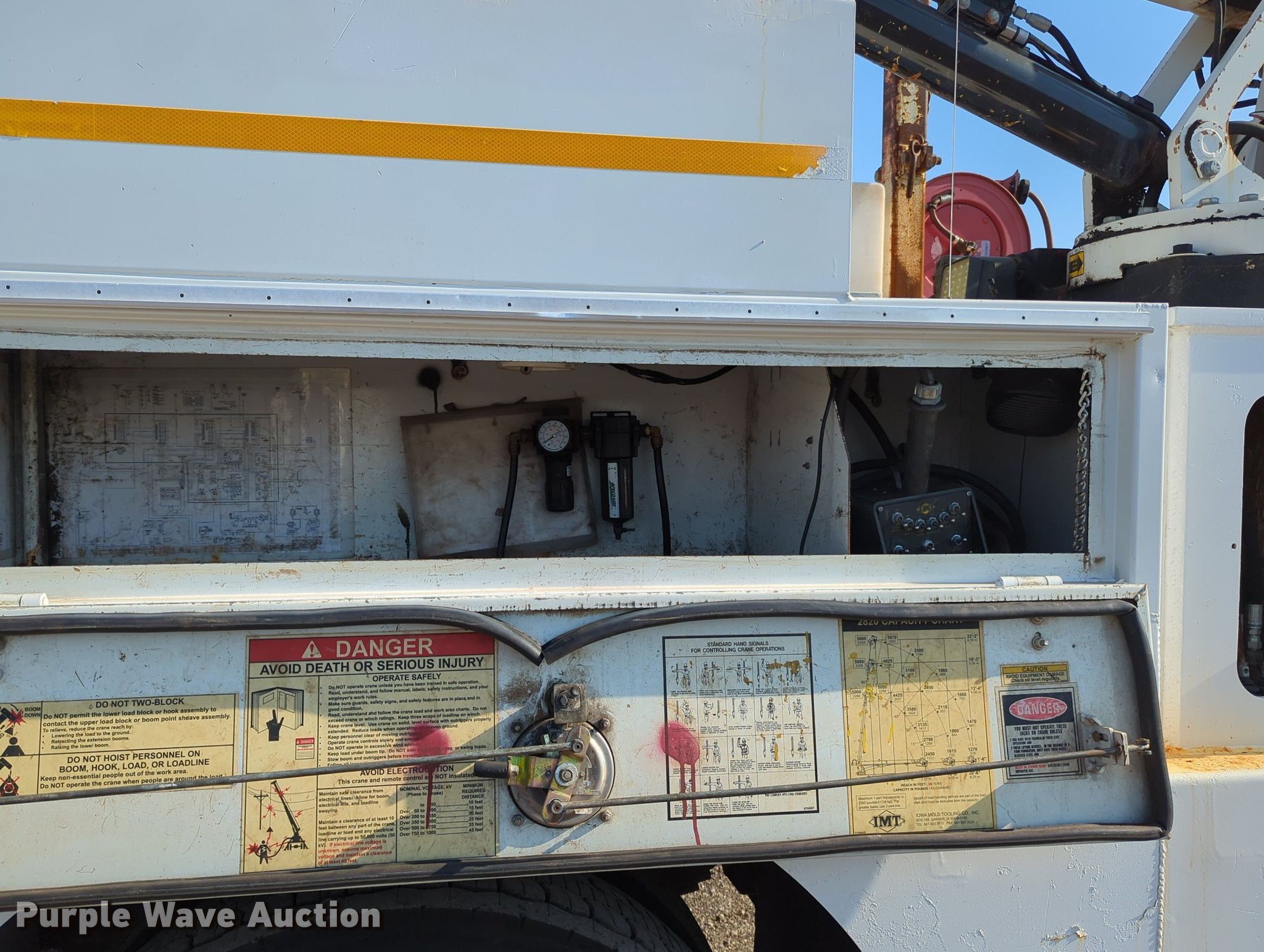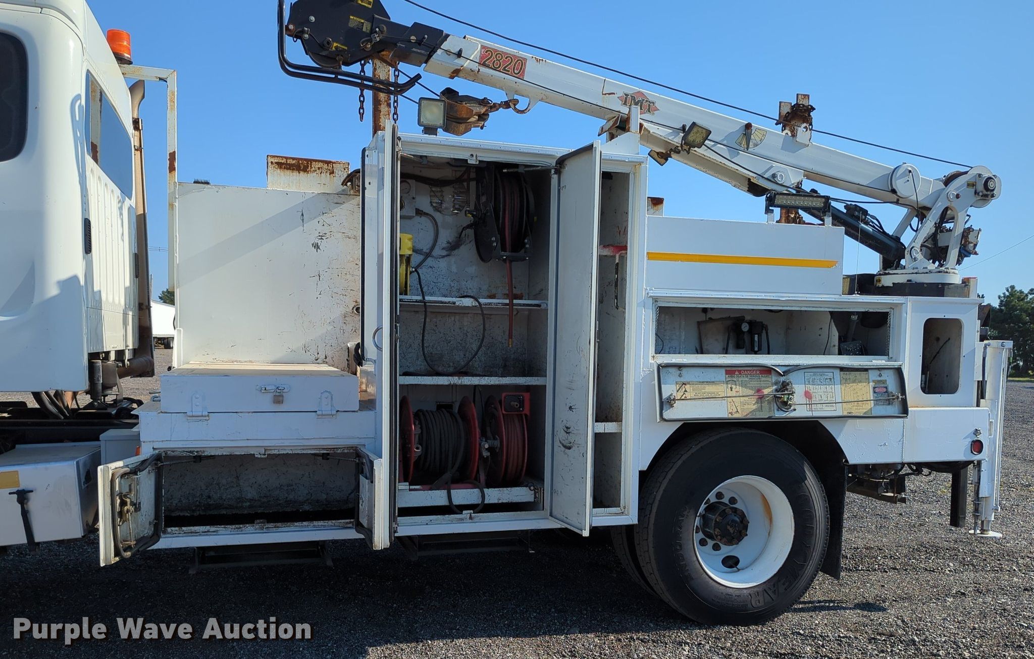 2013 Freightliner Business Class M2 utility / service truck. Miles: 139,272 on odometer, VIN: 1FVAC2BS7DHFA4903. Engine Cummins, Displacement: 8.3L, Cylinders: 6, Fuel type: Diesel. Transmission Eaton Fuller, Manual, Speed: 10. Chassis Axles: Single, Suspension: Spring, Brakes: Air, PTO. Interior AC, Heat, Heated mirrors, Cruise control. Features Bed 15' L x 96" W, Oil/lube system Hose reels, Crane IMT 2820, Maximum boom length: 22' Maximum lift capacity: 5,000 lbs.. Tires Size: 11R22.5. Oklahoma title. Title distribution may be delayed up to 14 days from verification of funds. 15107 North 137th East Avenue. Collinsville, OK 74021