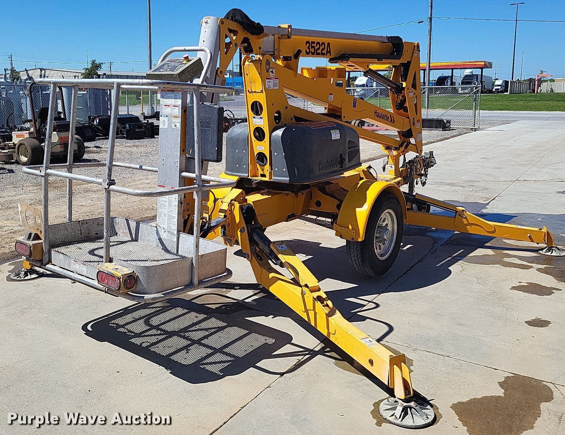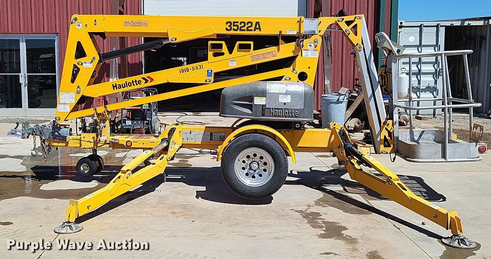 2017 Haulotte 3522A boom lift. Hours: 5,370 on meter, VIN: 5CUAG1614HA000023, Serial: 35A17-00023. Features Articulating boom, Tow behind, Maximum lift capacity: 500 lbs, Maximum reach length: 20', Maximum lift height: 40', Hydraulic outriggers, Hydraulic extendable jib, Platform: 27" L x 47" W, AC power outlet, Air outlet, Controls: Platform, Ground, 2" ball hitch. Tires Tire size: 225/75R15. Transfer of ownership documentation will be a bill of sale. Mike Rentals. 109 Larcel Dr. Sikeston, MO 63801