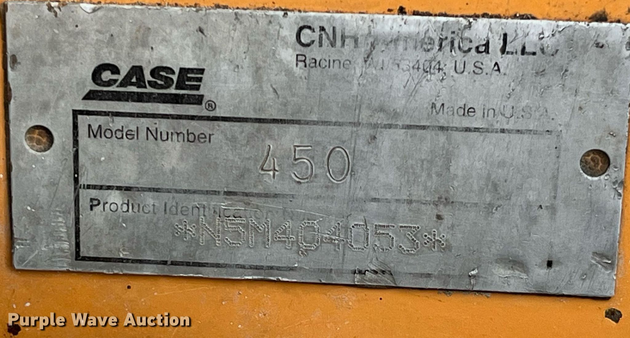 2005 Case 450 skid steer loader. Hours: 5,049 on meter, Serial: N5M404053, Unit #: 276. Engine Cylinders: 4, Fuel type: Diesel. Transmission Hydrostatic. Operators station OROPS, Bucket control: Hand. Features Auxiliary hydraulics, Auxiliary electrical outlet, Quick coupler: Hydraulic. Tires Size: 12-16.5. Notes Dead battery, Non-operational hood struts. Emery Sapp. 6739 Co Rd 423. Palmyra, MO 63461