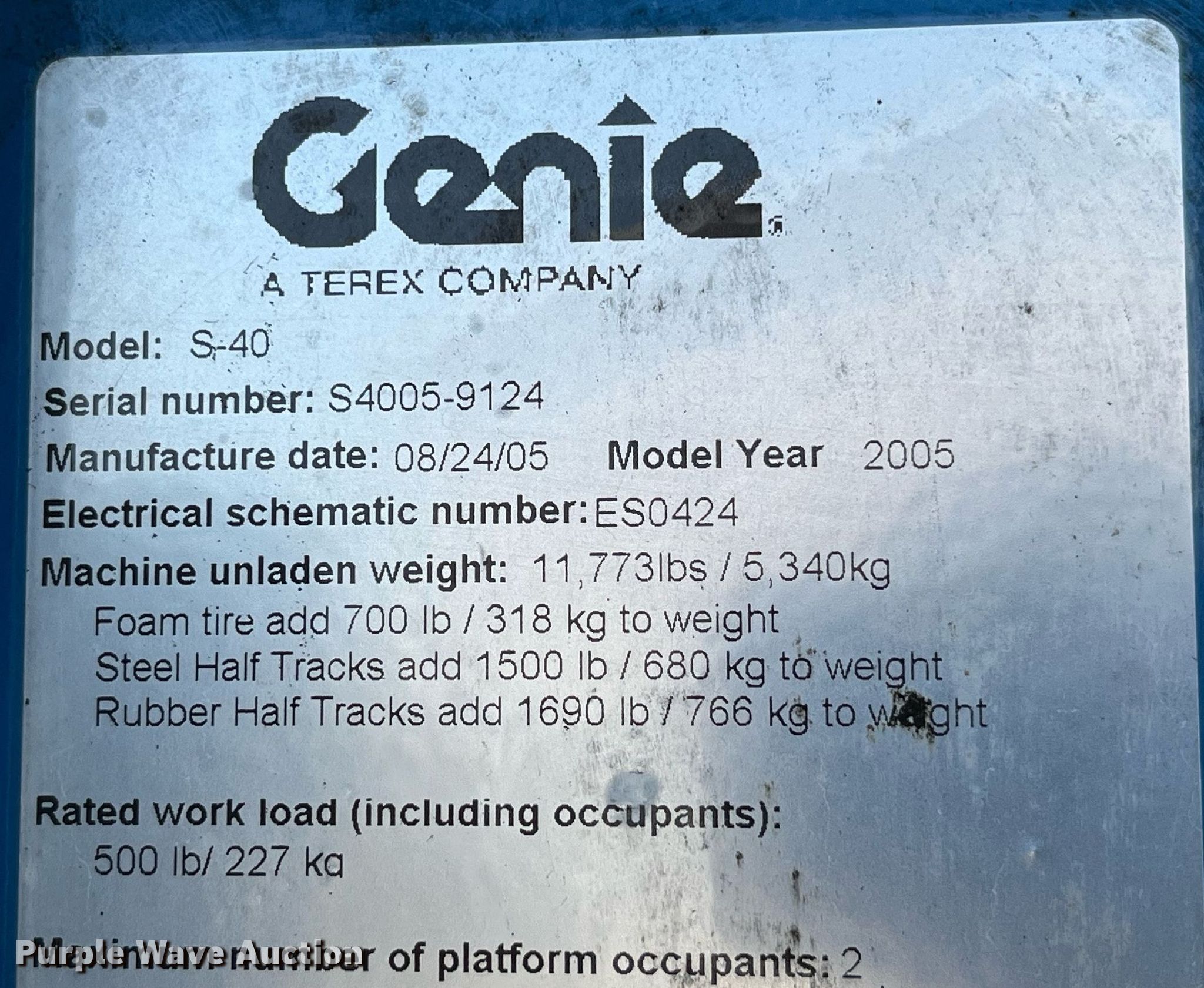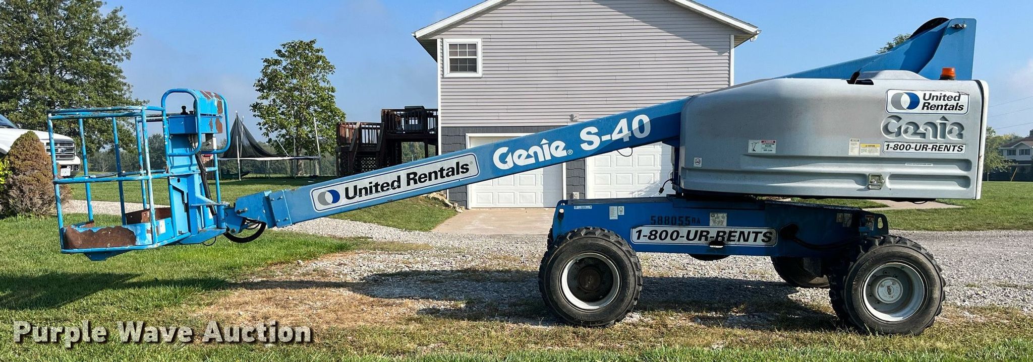 Purple Wave is selling a used Boom Lift in Missouri. This item is a 2005 Genie S-40 boom lift with the following: Hours: 4,442 on meter, Serial: S4005-9124, Unit #: 588055RA