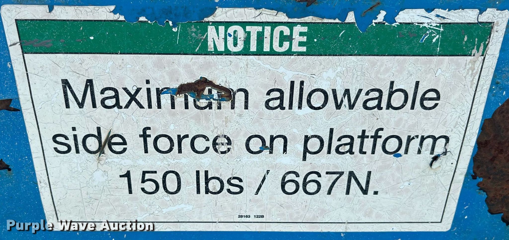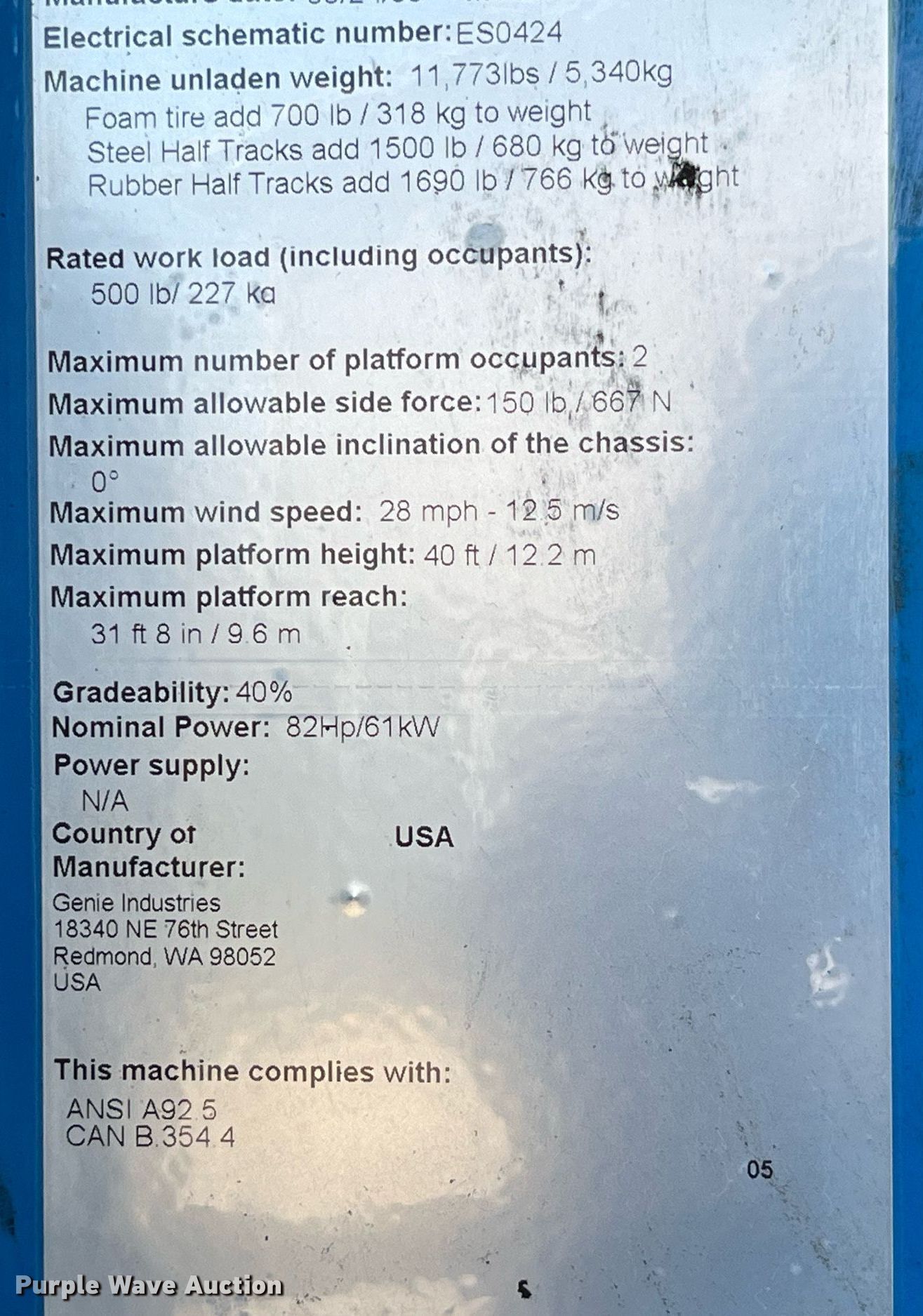 2005 Genie S-40 boom lift. Hours: 4,442 on meter, Serial: S4005-9124, Unit #: 588055RA. Engine Ford LRG425, Serial: 05UG44384, Displacement: 2.5L, Cylinders: 4, Fuel type: Dual fuel Gas or LPG, HP: 82, kW: 61. Chassis Four wheel drive. Features Rough terrain, Maximum lift capacity: 500 lbs, Maximum reach length: 31' 8", Maximum lift height: 40', Hydraulic leveling, Platform: 68 1/2" L x 27 1/2" W, AC power outlet, Controls: Platform, Ground, Platform rotation: Hydraulic. Tires Tire size: 12-16.5. Everett Davis Construction. 5084 Autumnwood Lane. Hannibal, MO 63401
