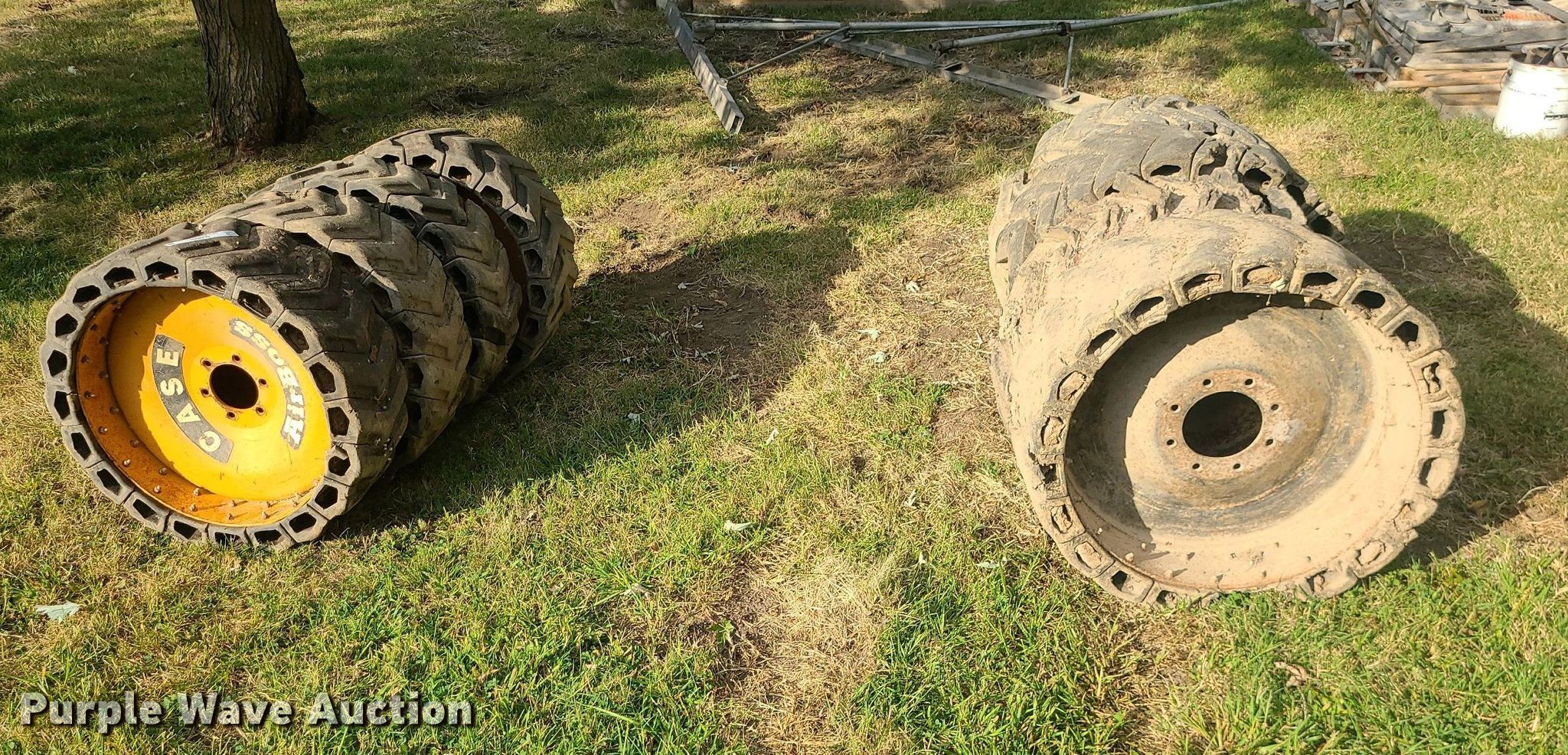 Purple Wave is selling a used Industrial Tires or Tracks in Missouri. This item is a (8) skid steer tires and wheels with the following: (4) 8 lug, 12" W, (4) 6 lug, 10" W