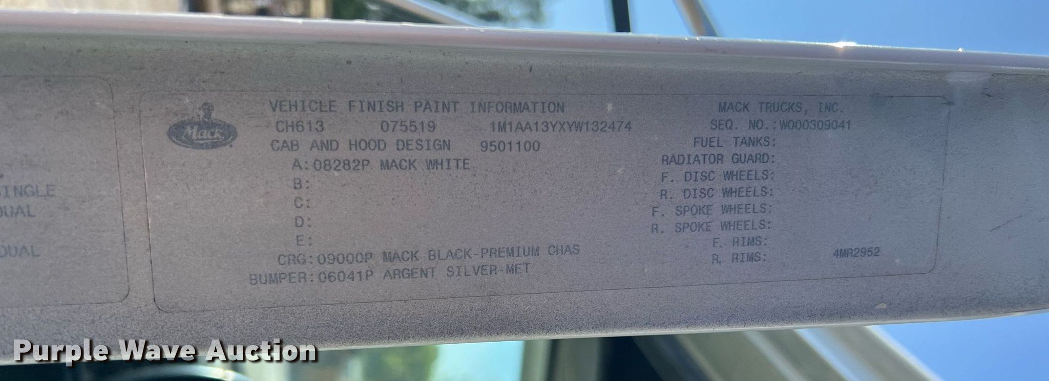2000 Mack CH613 dump truck. Miles: 756,696 on odometer, Hours: 22,633 on meter, VIN: 1M1AA13YXYW132474. Engine Mack E7-350, Serial: 0D0455, Displacement: 12.0L, Cylinders: 6, Fuel type: Diesel, HP: 350. Transmission Eaton Fuller, Manual, Speed: 10. Chassis Axles: Tandem, Suspension: Air, Brakes: Air, PTO, GVWR: 52,000 lbs FAWR: 12,000 lbs, IAWR: 20,000 lbs, RAWR: 20,000 lbs. Interior AC, Heat, Heated mirrors, Cruise control. Features Dump bed 16' L x 96" W, Side height: 42", Bed type: Steel, Ram: Single, End gate: Air operated, Rotating dump bed, Hi-Rail wheel system. Tires Front: 315/80R22.5, Rear: 295/75R22.5. Notes Dead battery. Missouri title. Title distribution may be delayed up to 14 days from verification of funds. Capital Railroad Contracting Inc... 8500 E Trade Center Dr. Columbia, MO 65201