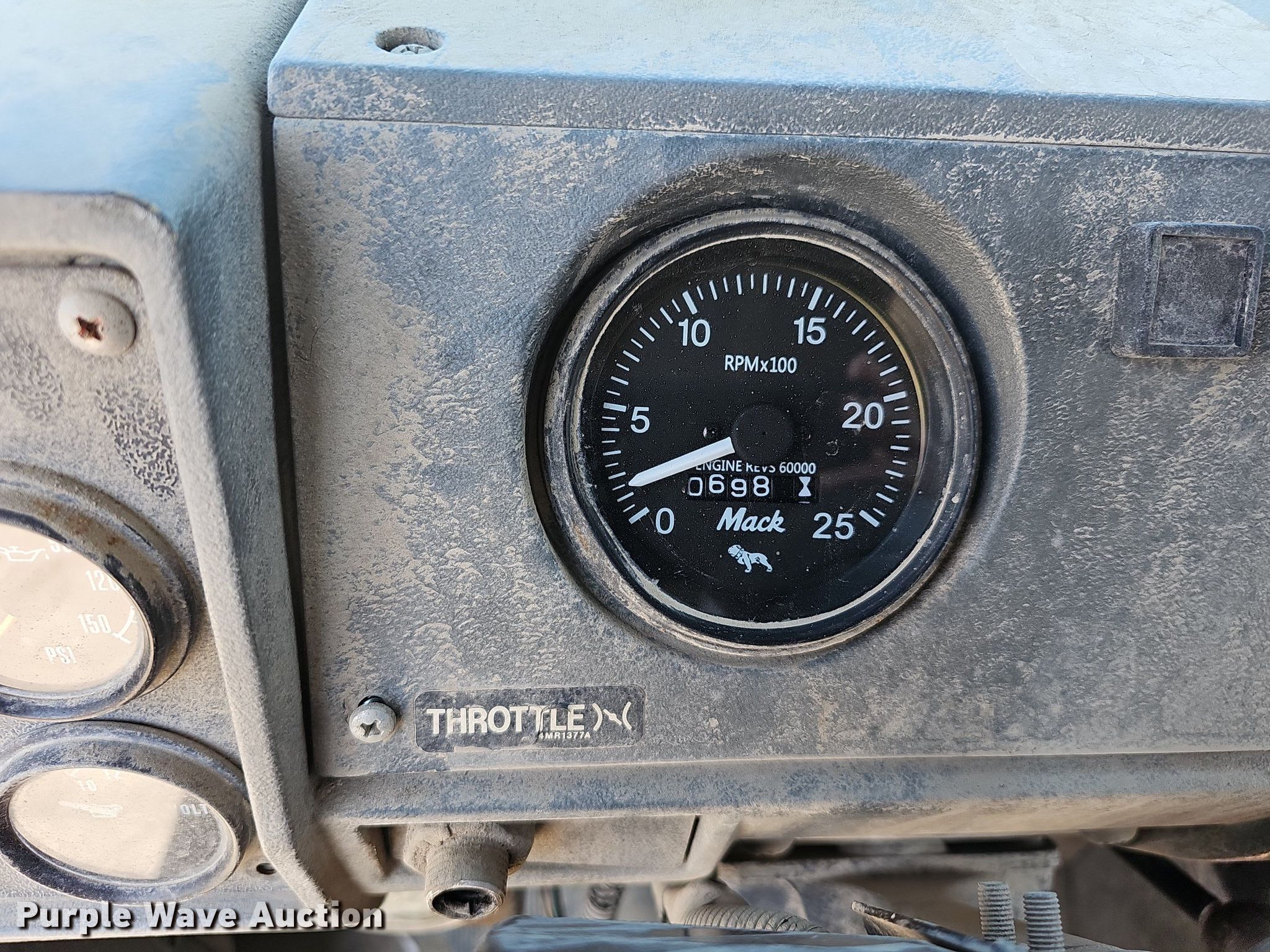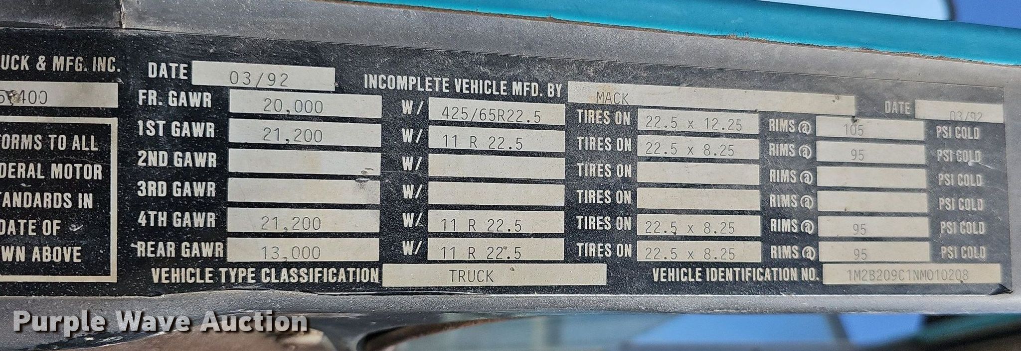 1992 Mack DM690S water truck. Miles: 58,039 on odometer, Hours: 698 on meter, VIN: 1M2B209C1NM010208. Engine Model: Mack, Displacement: 12.0L, Cylinders: 6, Fuel type: Diesel. Transmission Mack Maxitorque T2080 Extended Range, Manual, Speed: 8. Chassis Axles: Tandem, Suspension: Camelback, Brakes: Air, GVWR: 75,400 lbs, Wheelbase: 200". Features Bed / tank Capacity: 4,000 gallons, 15' 2" L x 8' W, Spray bar: Front, Rear, Side discharge, Hose reel, Top fill, Rear drain: 2". Tires Front: 425/65R22.5, Rear: 11R22.5, Brand: Firestone and Continental. Notes Passenger side mirror cracked , Tank leaks, Windshield chipped or cracked, Unknown operating condition of AC, Heat, Pump. Title distribution may be delayed up to 14 days from verification of funds. Emery Sapp. Bucyrus, KS 66013