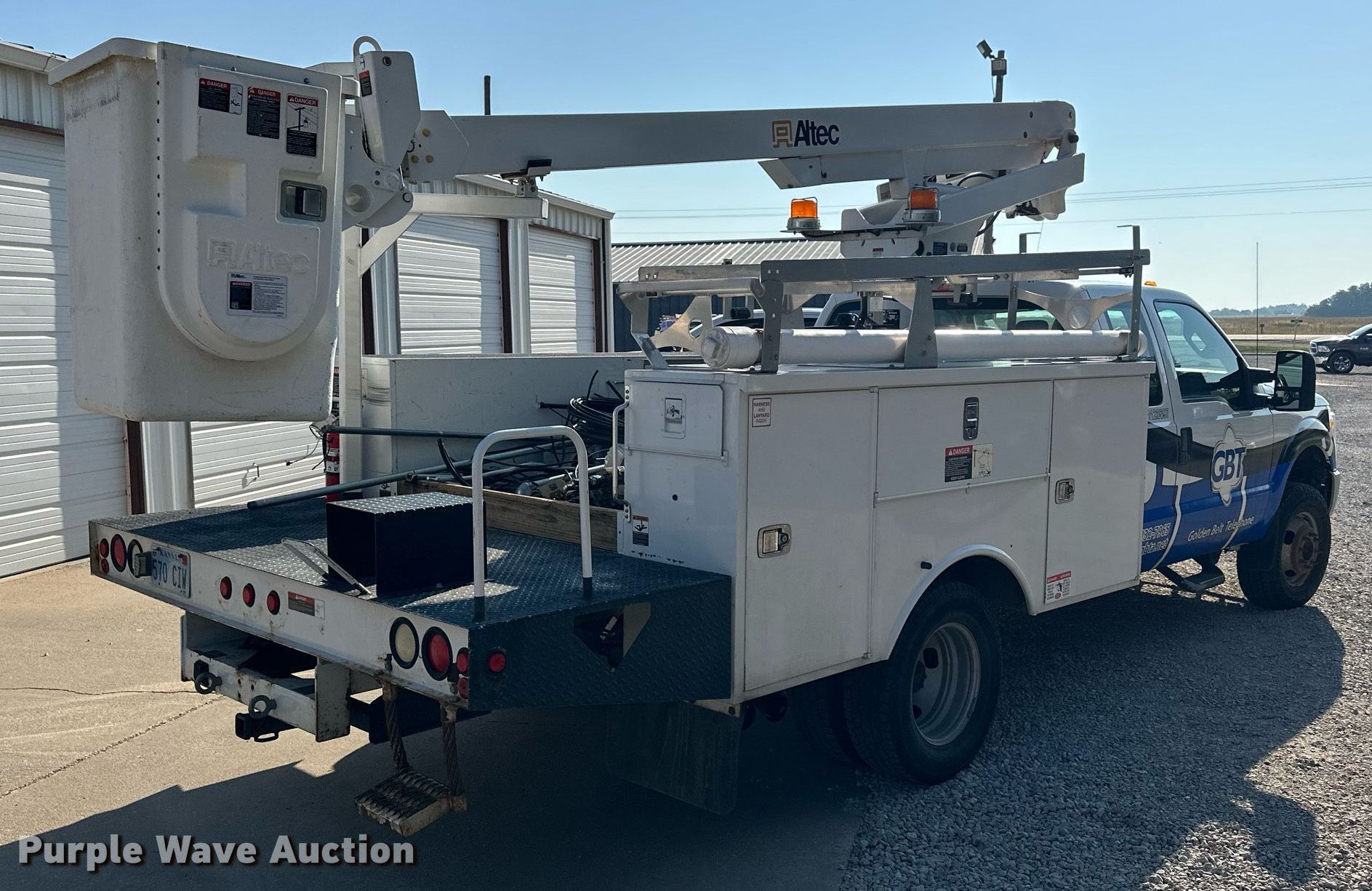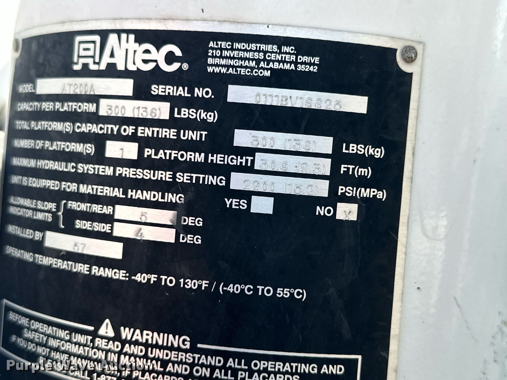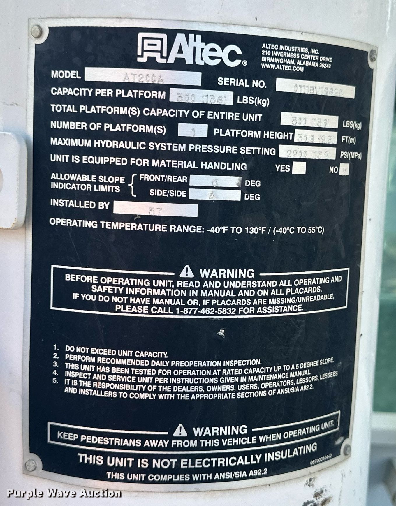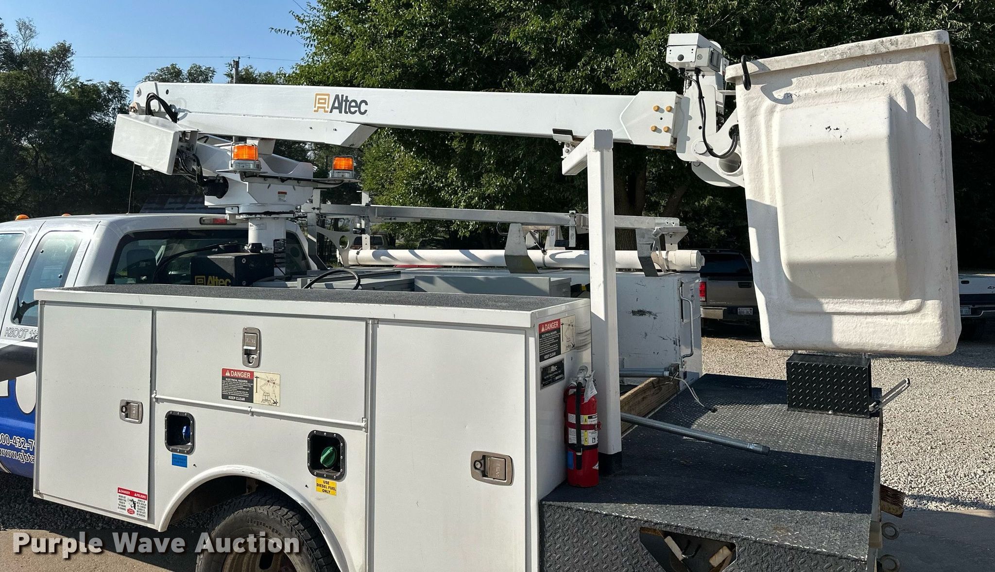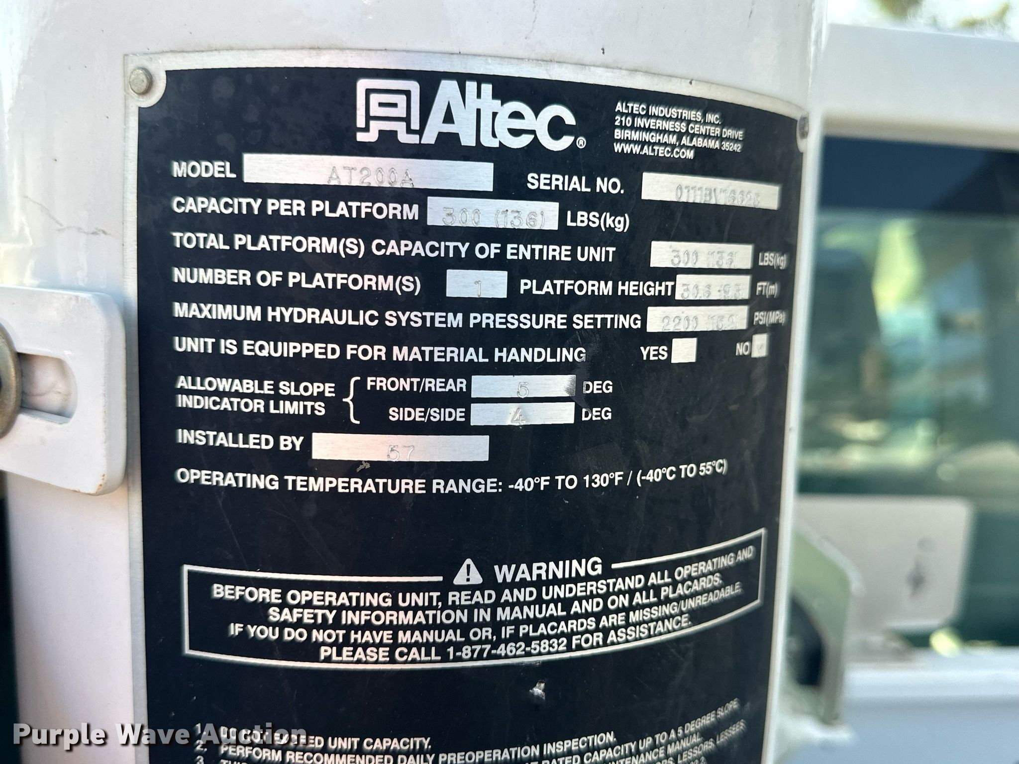 2011 Ford F350 Super Duty bucket truck. Miles: 222,383 on odometer, Miles or hours may vary, unit still in use, VIN: 1FD8X3HTXBEB76876. Engine Displacement: 6.7L V8 OHV, Cylinders: 8, Fuel type: Diesel, HP: 300. Transmission Automatic. Chassis Four wheel drive, Axles: Single, Suspension: Spring, Brakes: Hydraulic, PTO, GVWR: 13,300 lbs, Wheelbase: 162". Interior AC, Heat, Cruise control, Auxiliary controls. Features Bed Altec, Serial: 856-17709295, 12' L x 94" W, Boom Altec AT200A, Serial: 0111BV16625, Maximum lift capacity: 300 lbs, Maximum lift height: 30.6', Boom type: Telescopic, Man basket, Boom controls Ground, Platform/ basket.. Tires Size: 245/75R17. Notes Engine replaced at 179,087 miles, Contents not included, Decals have been removed. View repairs. Kansas title. Golden Belt Telephone Assn.. 103 Lincoln Street. Rush Center, KS 67575