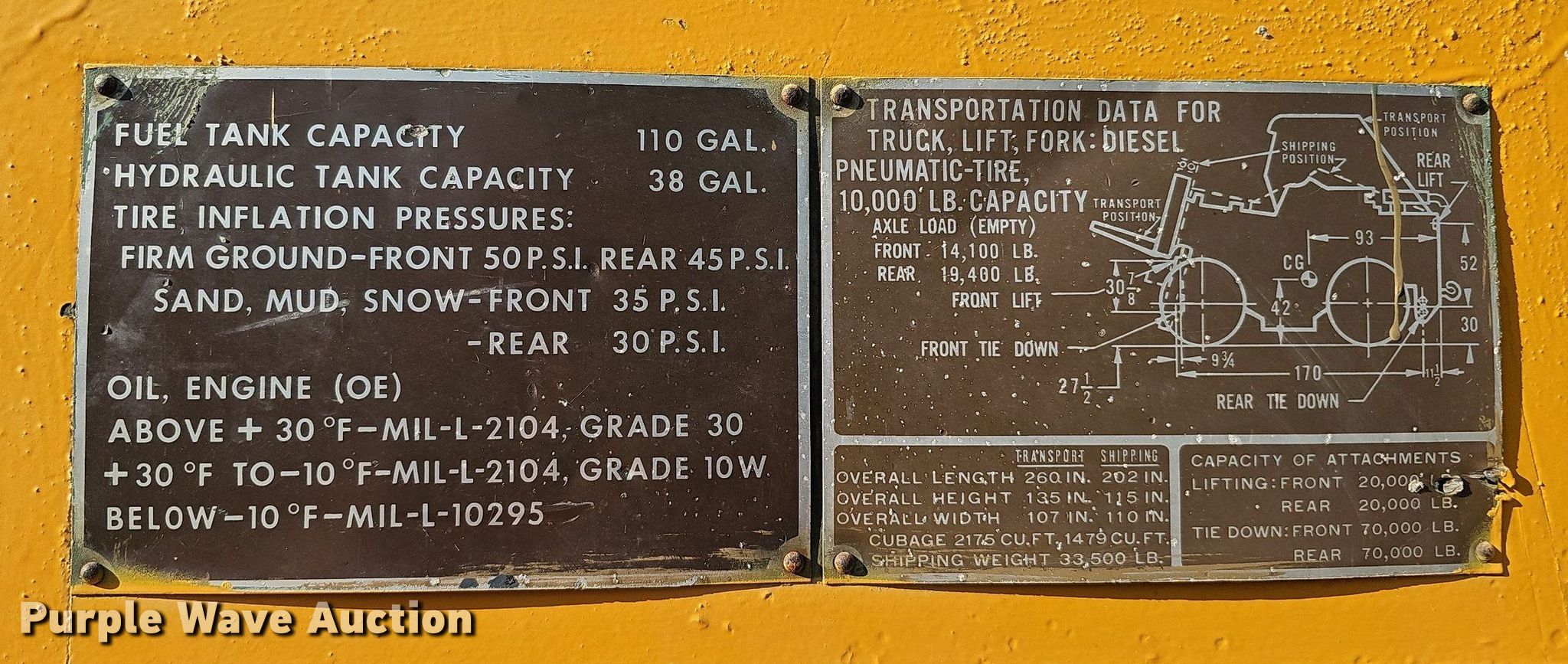 1971 Pettibone A3520-1 forklift. Hours: 2,591 on meter, Serial: 811. Engine Detroit Diesel 5063-5000, Serial: 06DB005684, Cylinders: 6, Fuel type: Diesel. Transmission Powershift, 6F - 6R. Chassis Four wheel drive. Operators station Steering: Crab, Four wheel. Features Maximum lift capacity: 10,000 lbs, Maximum lift height: 115", Mast stages: 1, Side shift, Mast tilt, Fork length: 59". Tires Size: 20.5-25. View repairs. Atchison County Road and Bridge Department. 1003 South Main Street. Rock Port, MO 64482