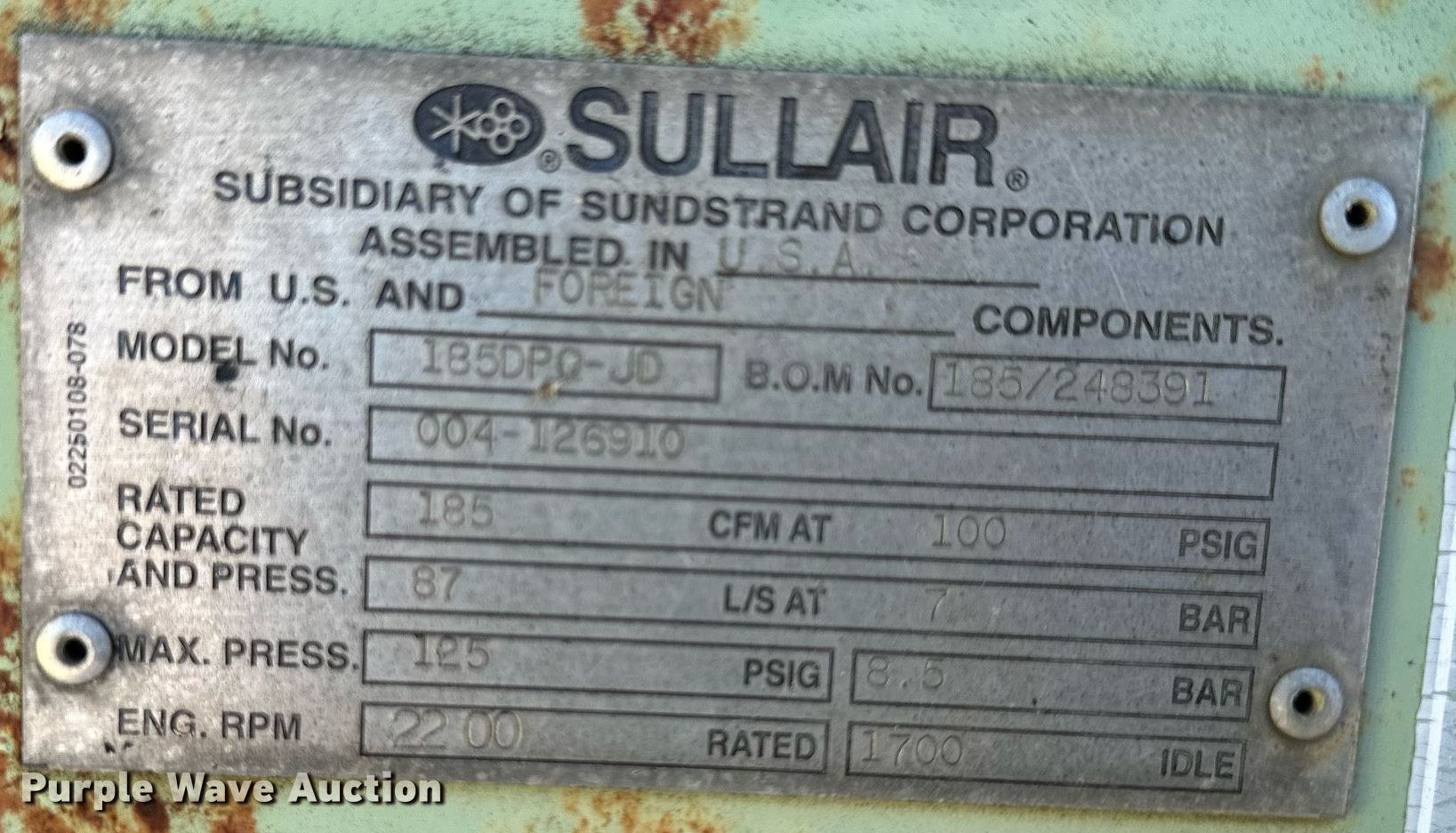 Purple Wave is selling a used Air Compressor in Missouri. This item is a Sullair 185DPQ-JD air compressor with the following: Hours: 457 on meter, Serial: 004-126910