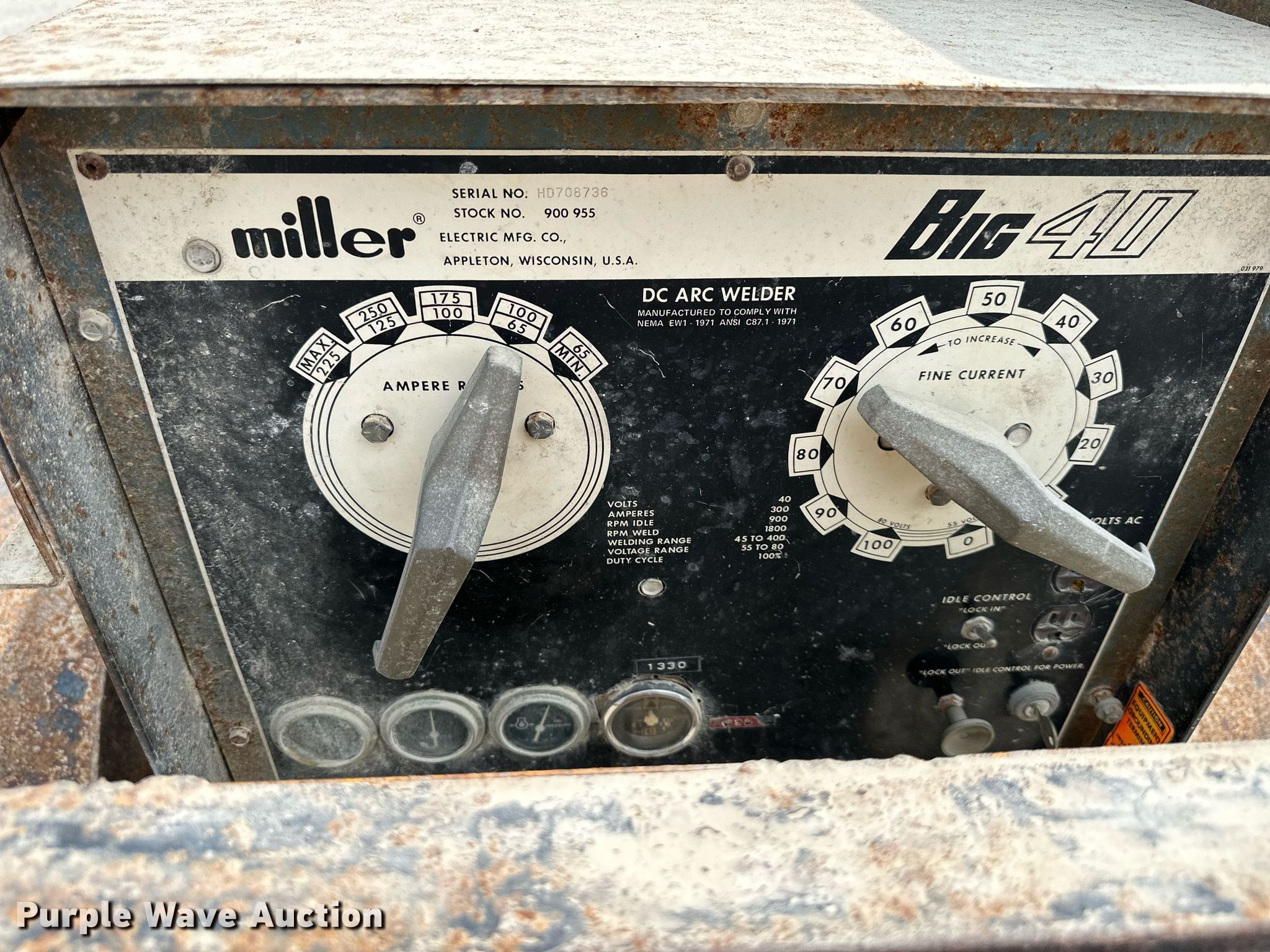 Purple Wave is selling a used Welder (Manual) in Kansas. This item is a Miller Big 40 welder with the following: Hours: 1,159 on meter, Serial: HD708736