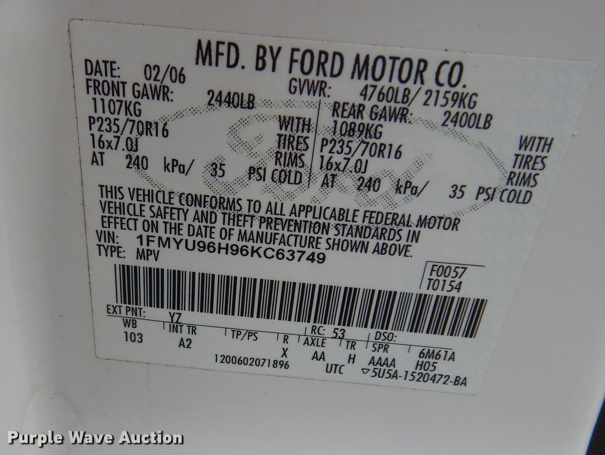 - VIN: 1FMYU96H96KC63749
