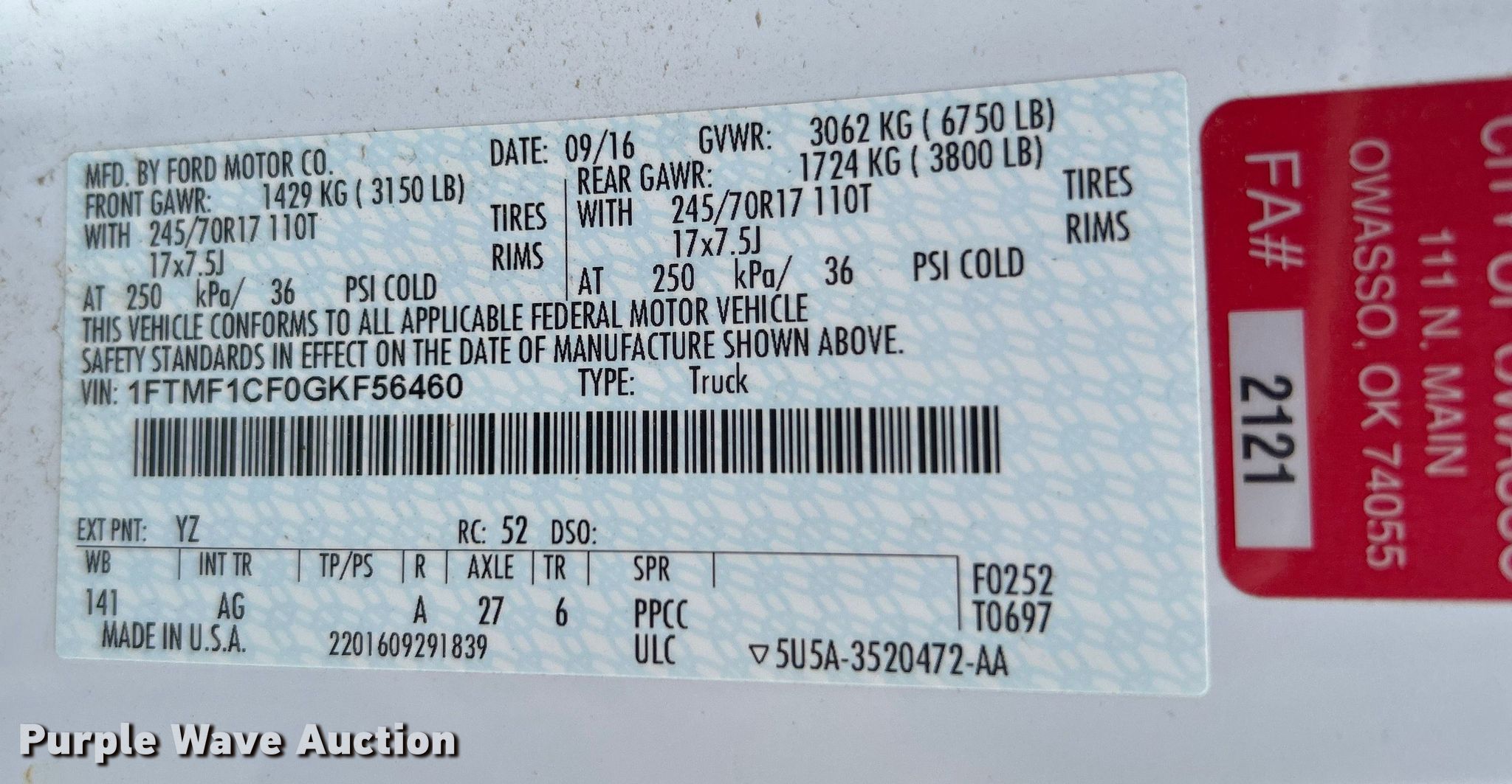 2016 Ford F150 pickup truck. Miles: 36,787 on odometer, VIN: 1FTMF1CF0GKF56460. Engine Displacement: 5.0L V8, Cylinders: 8, Fuel type: CNG. Transmission Automatic. Interior AC, Heat, Power windows, Power locks, Cruise control. Tires Size: 255/70R17. Notes Dash warning indicator: TPMS. Law enforcement and emergency equipment will be removed prior to auction. Includes but not limited to decals, two-way radio, spotlight, emergency lights and siren, firearm rack, and camera.. Oklahoma title. Seller is a government entity who will be assigning and distributing the title. Please contact the seller for distribution questions. City of Owasso, OK. 200 South Main Street. Owasso, OK 74055