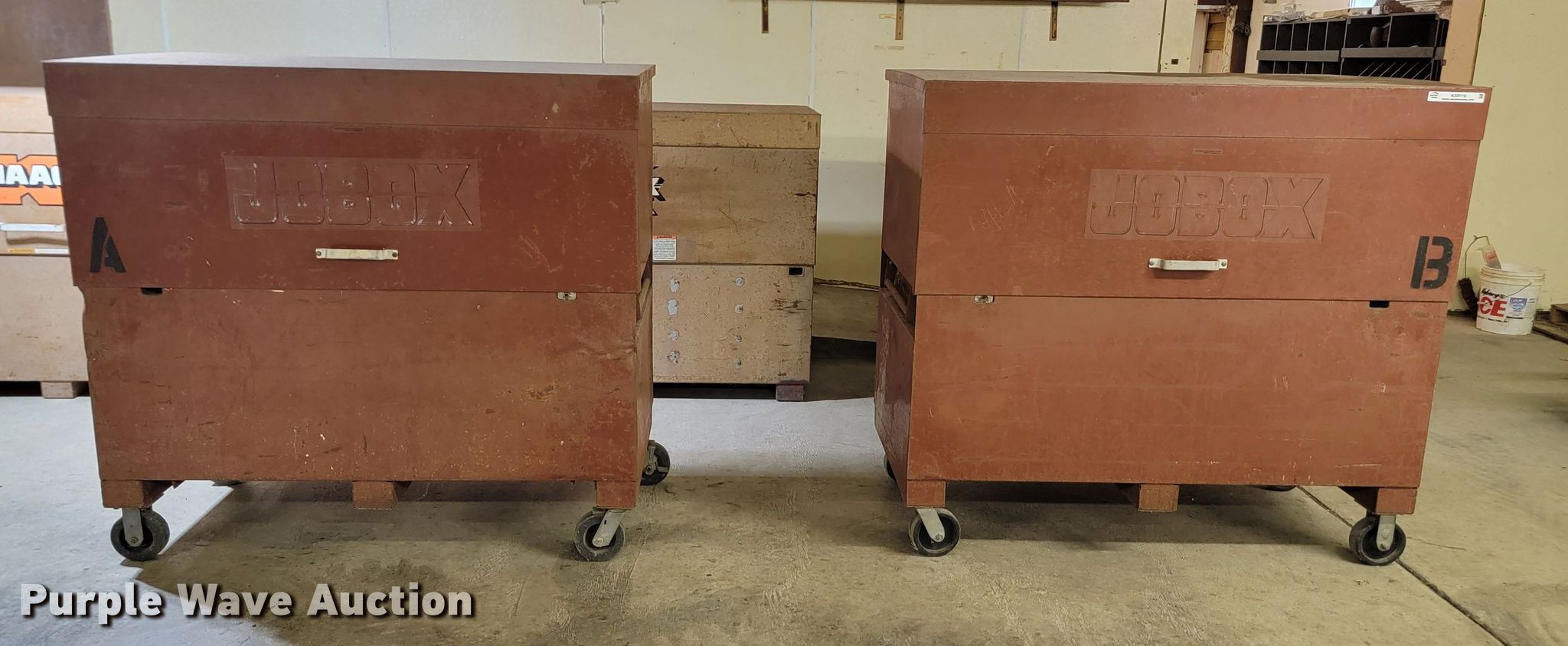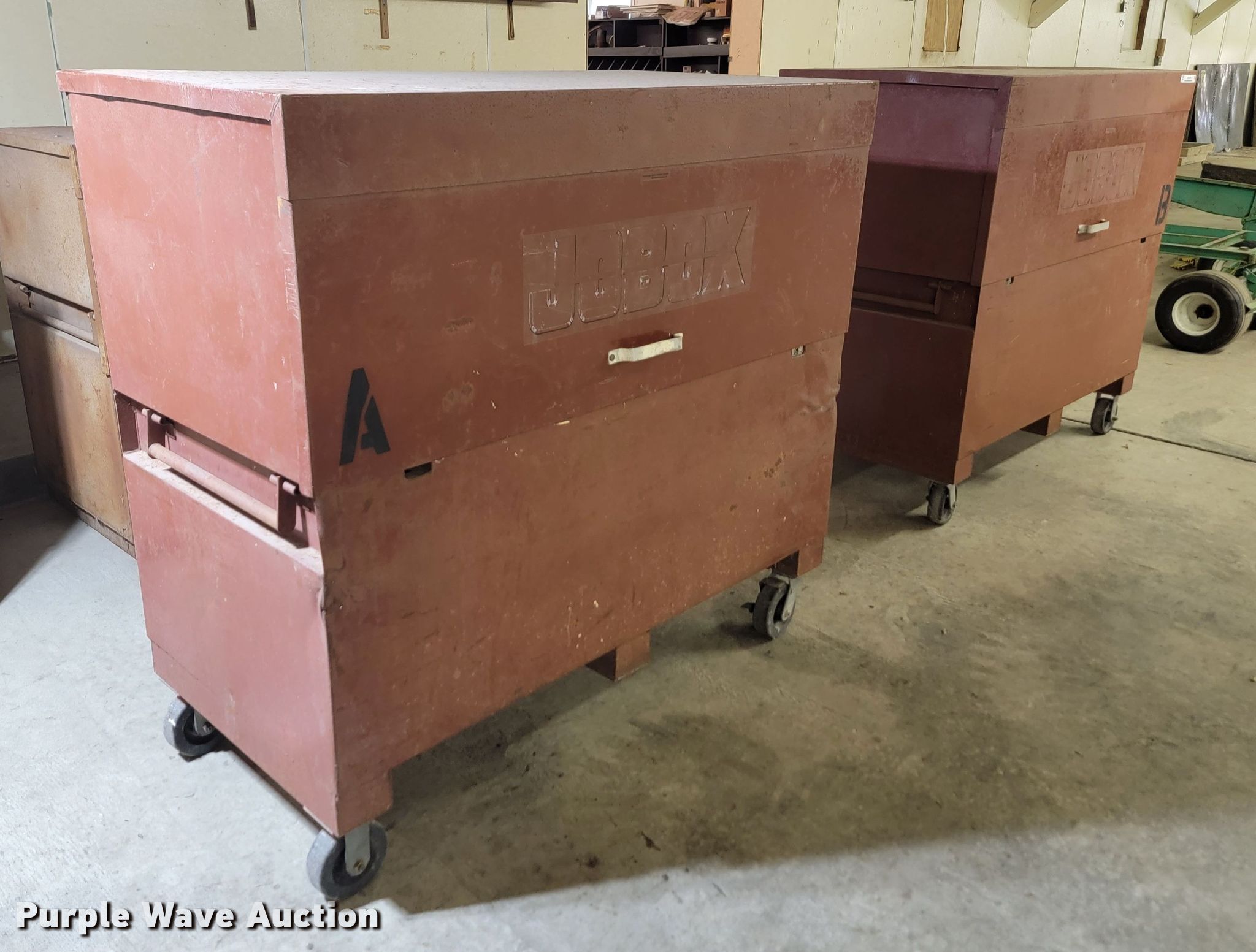 Purple Wave is selling a used Tools in South Dakota. This item is a (4) toolboxes with the following: (2) Knaack, 6' L x 30" W x 50" H, (2) JoBox, 5' L x 30" W x 57" H