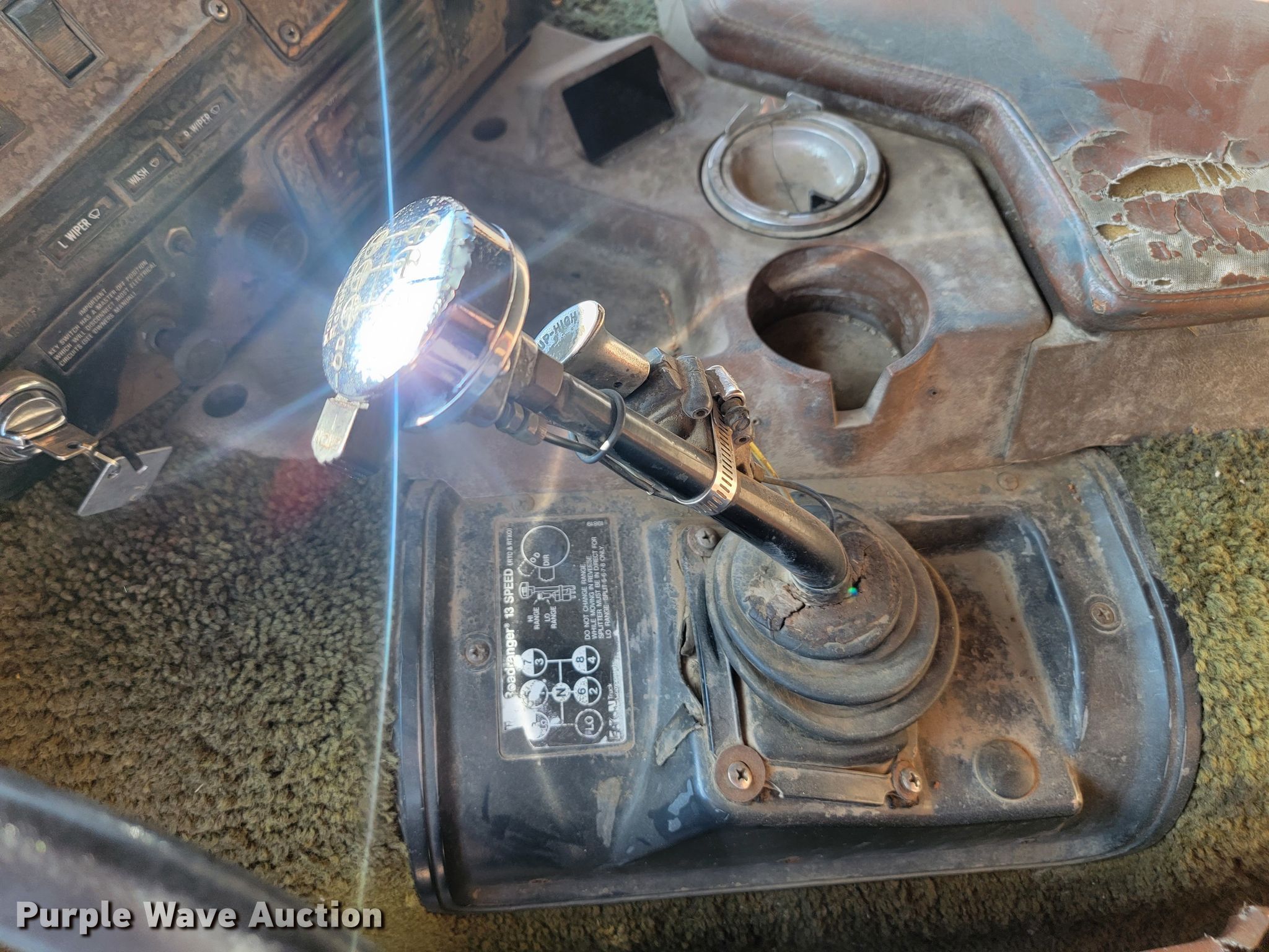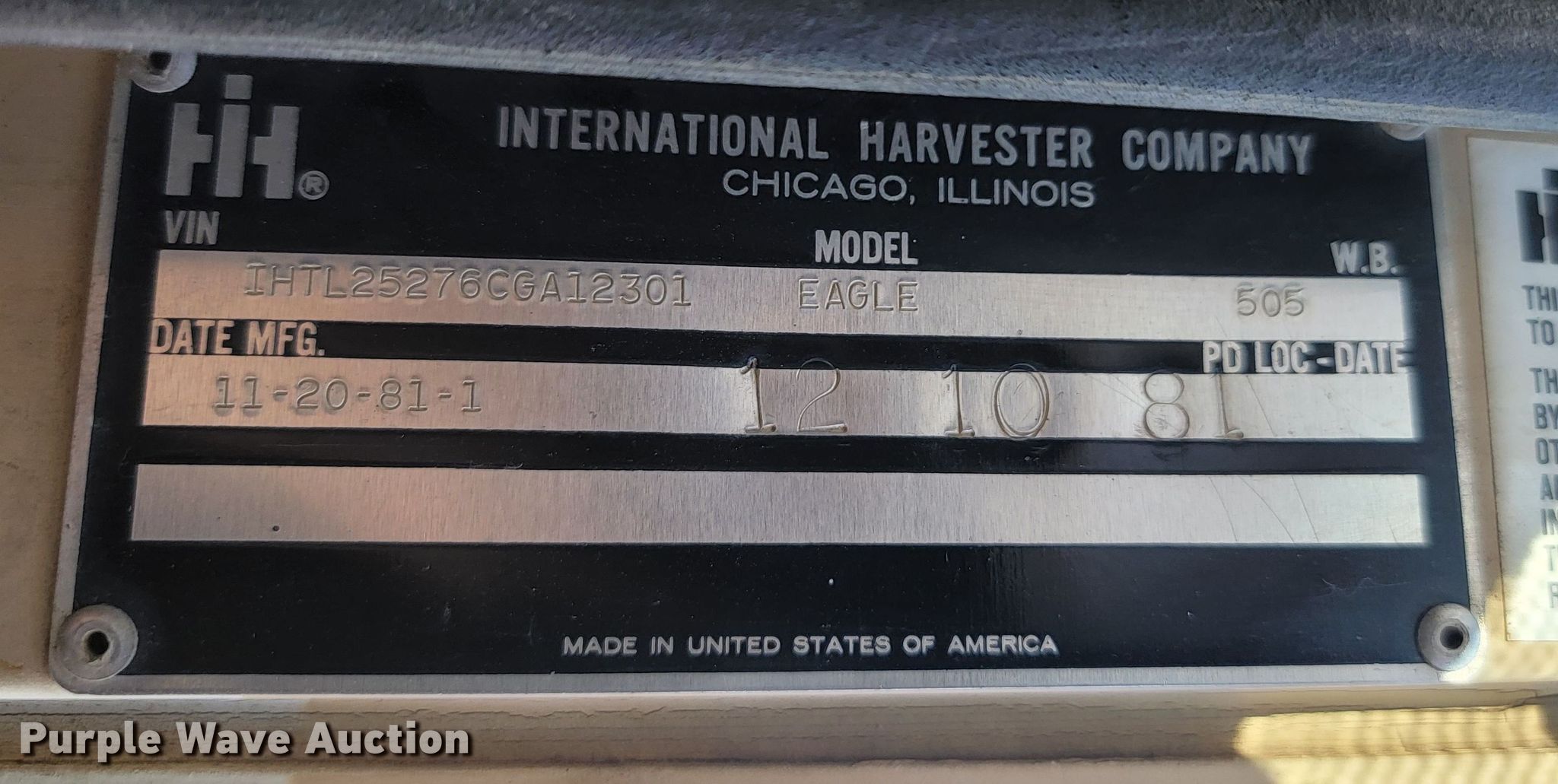 1982 International 9670 Eagle semi truck. Miles: 954,982 on odometer, VIN: 1HTL25276CGA12301. Engine Cummins 855, Cylinders: 6, Fuel type: Diesel, Engine brake. Transmission Eaton Fuller Roadranger, Manual, Speed: 13. Chassis Axles: Tandem, Differential lock: Inter-axle, Suspension: Spring, Brakes: Air, PTO, Wet kit, Truck chassis: 14' L. Interior Heat, Sleeper Sleeper length: 57", Beds: Single. Features Deck plate: Steel, Fifth wheel type: Sliding, Fuel tank: Dual. Tires Size: 11R24.5. Notes Windshield chipped or cracked, Hail damage. South Dakota title. Title distribution may be delayed up to 14 days from verification of funds. 1224 West 5th Avenue. Mitchell, SD 57301