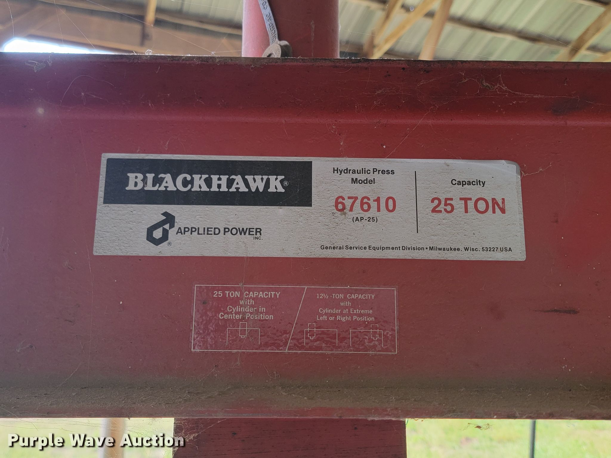 Black Hawk 67610 hydraulic press. Capacity: 25 tons. State of South Dakota Property Management. Sioux Falls, SD 57107