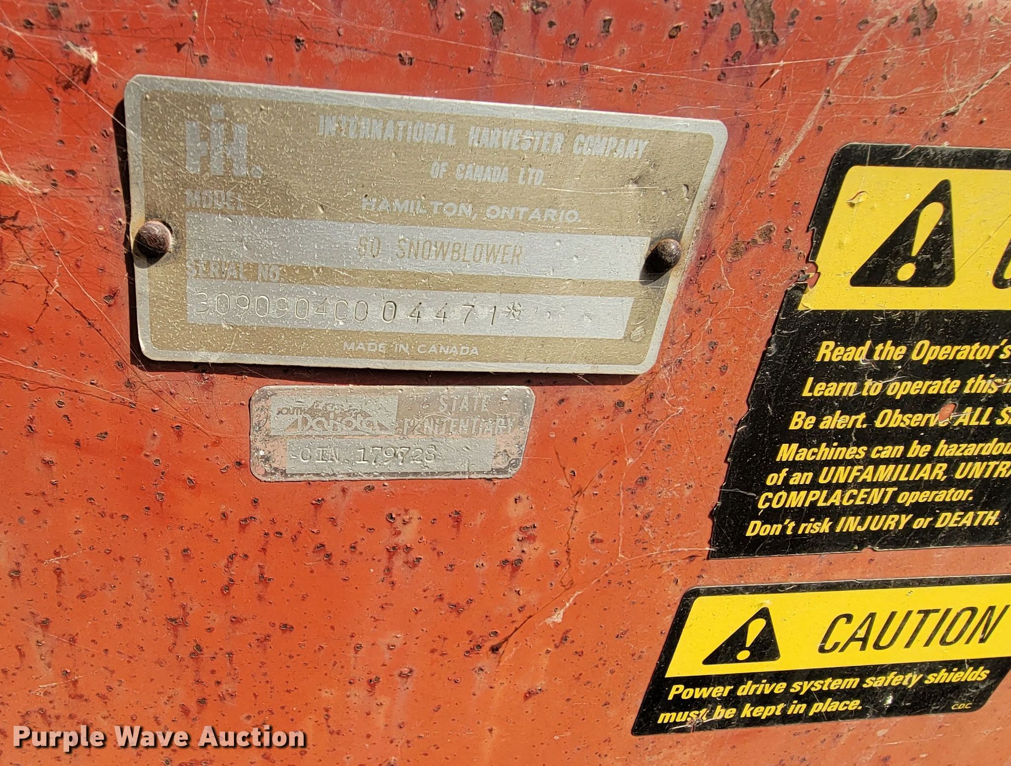 Purple Wave is selling a used Ag Equip. Other in South Dakota. This item is a International 80 snow blower with the following: Serial: 30909040004471, Width: 7' 3", PTO: 540, Three point, Unknown operating condition