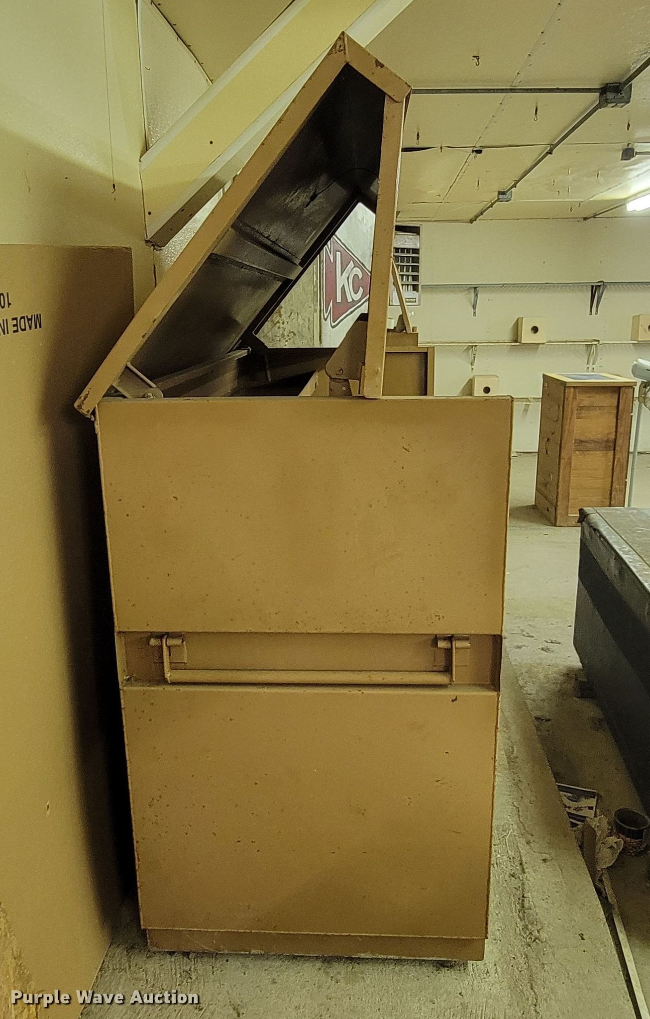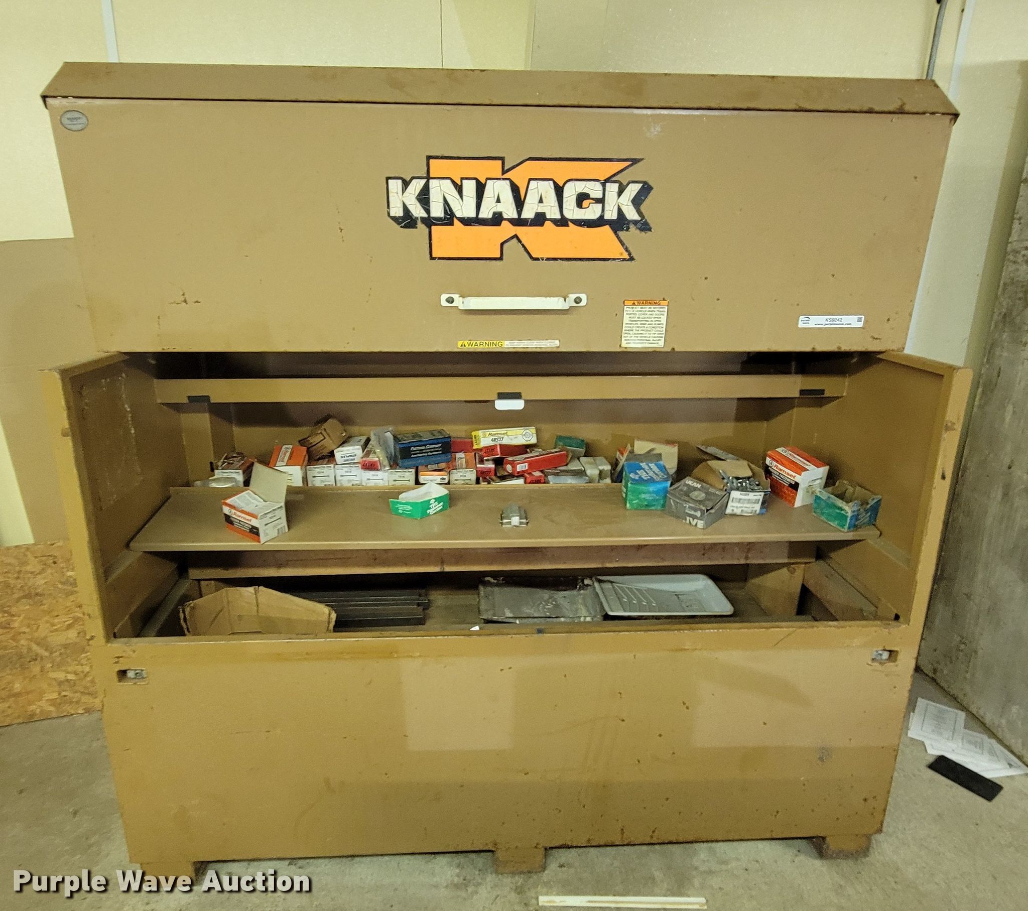 Purple Wave is selling a used Tools in South Dakota. This item is a Knaack toolbox with the following: 6' L x 30" W x 50" H