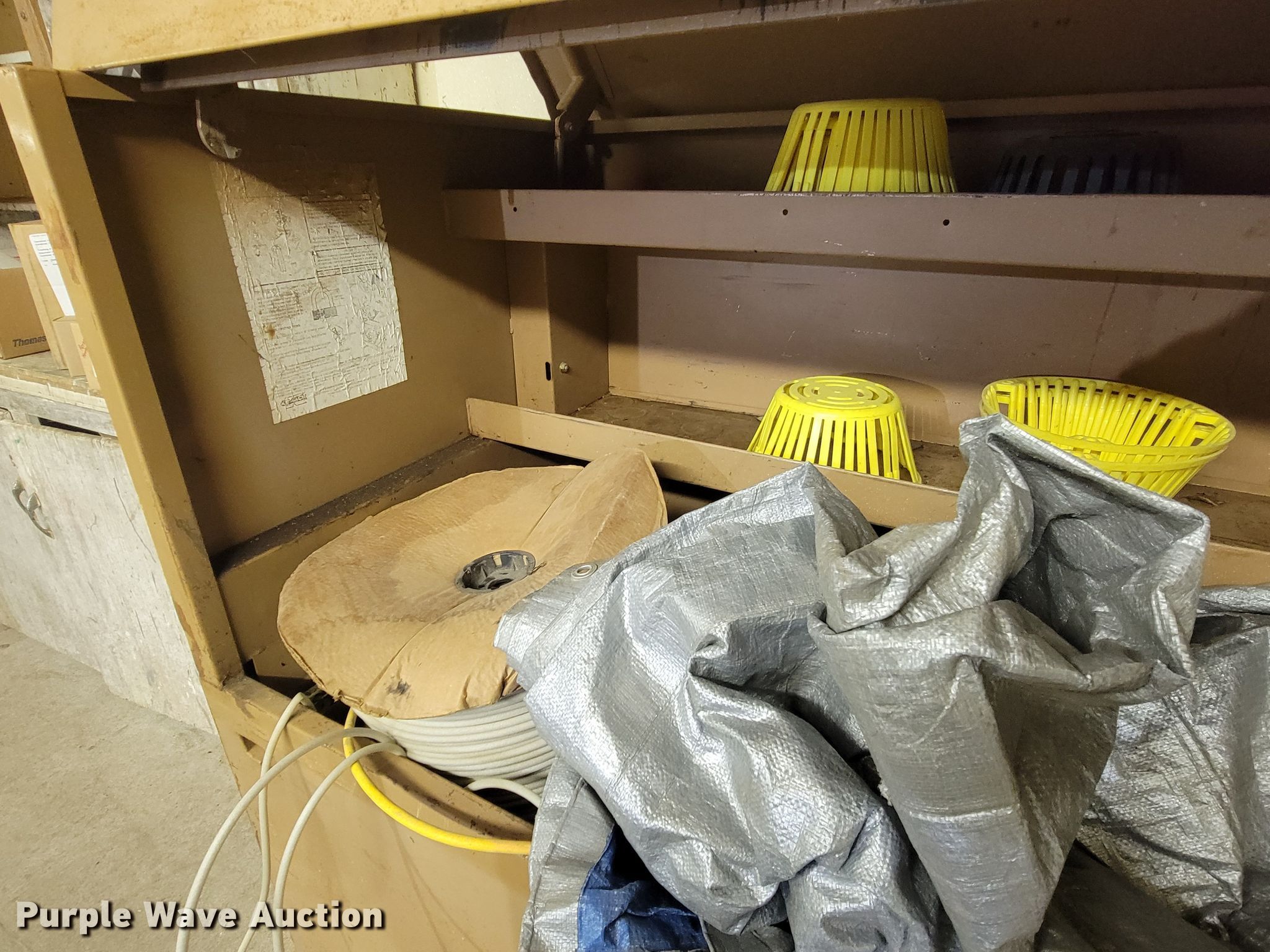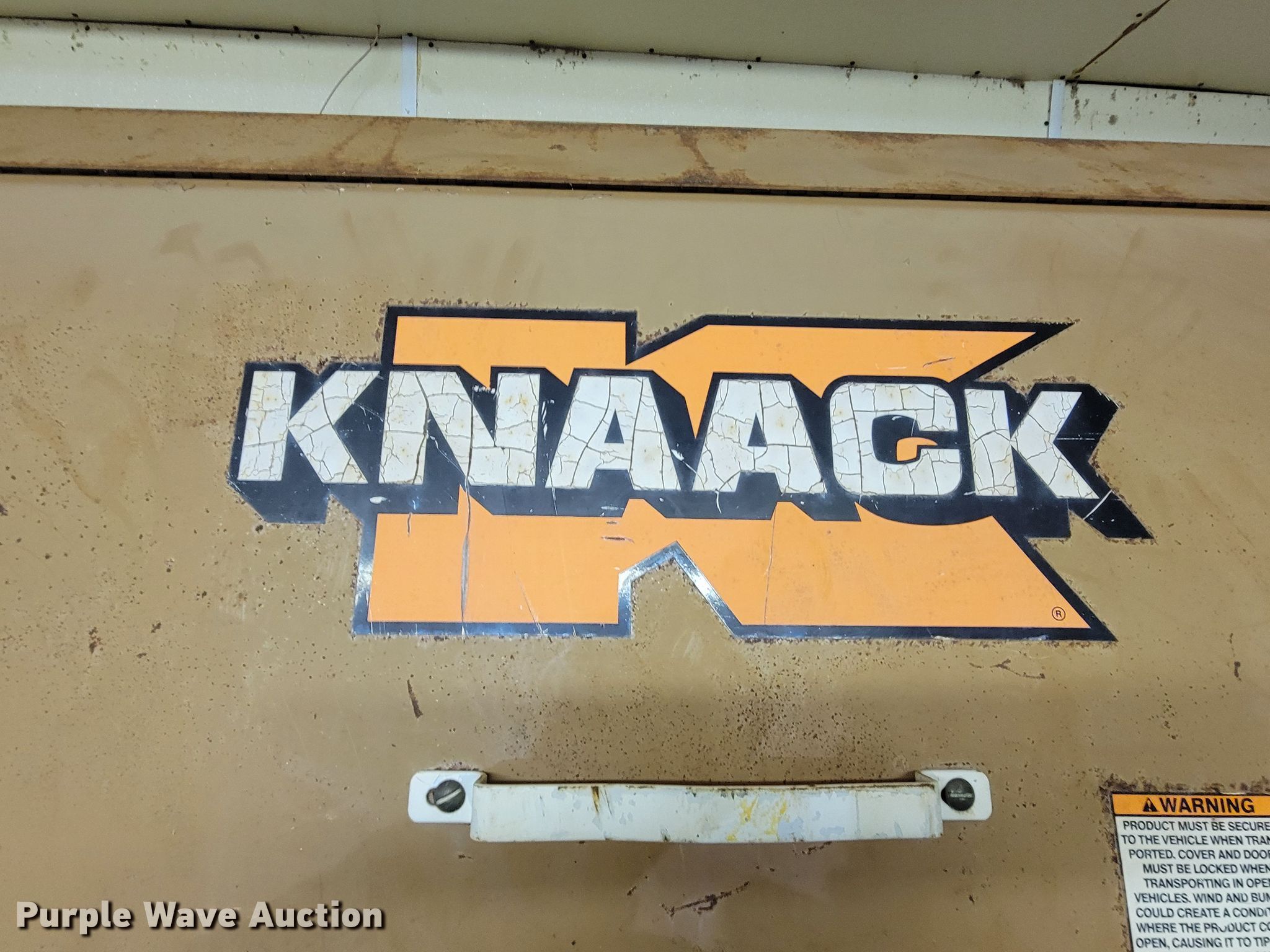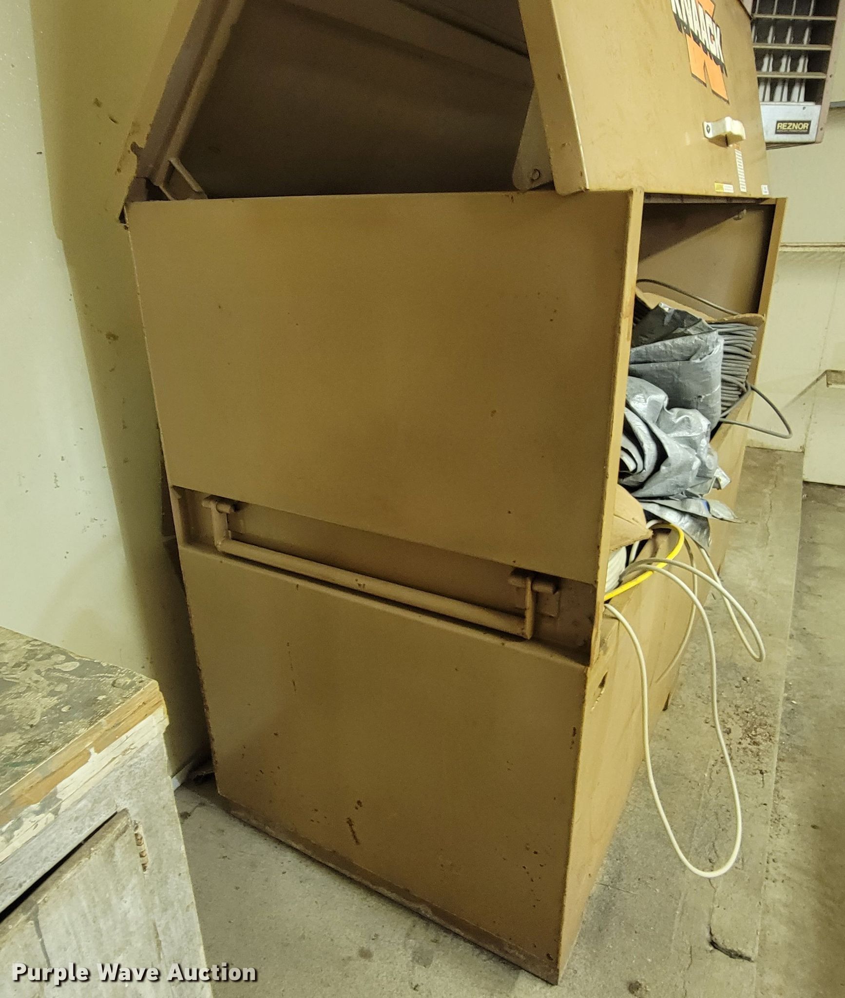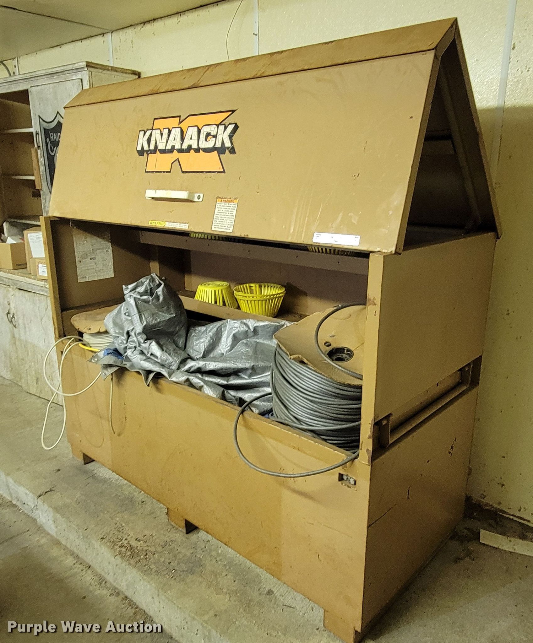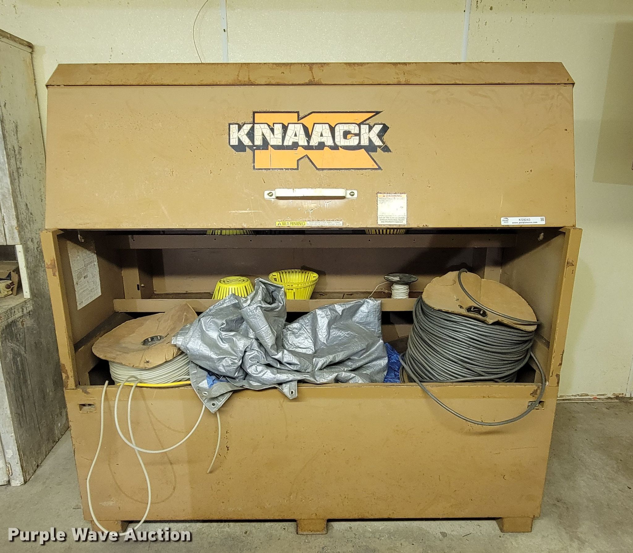 Purple Wave is selling a used Tools in South Dakota. This item is a Knaack toolbox with the following: 6' L x 30" W x 50" H
