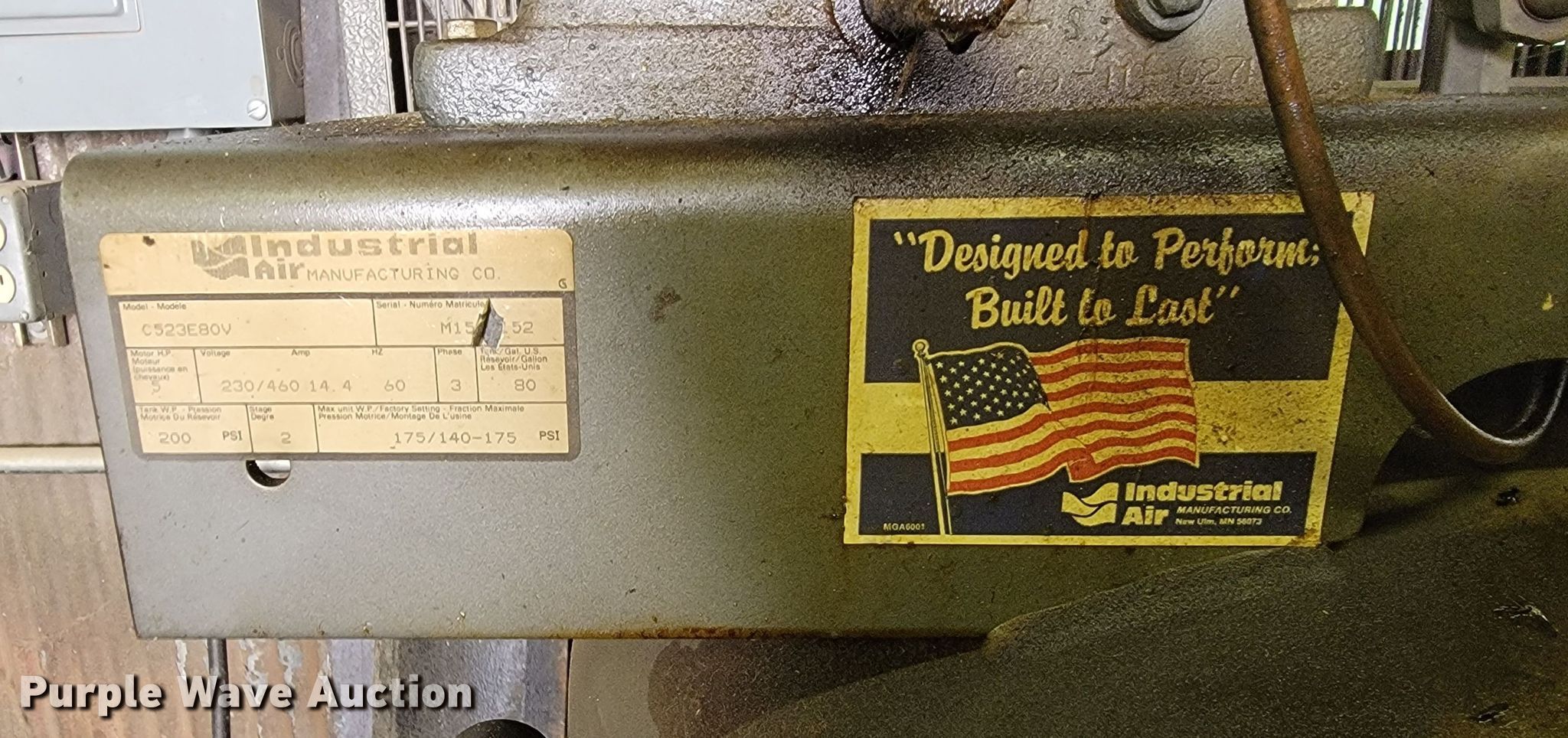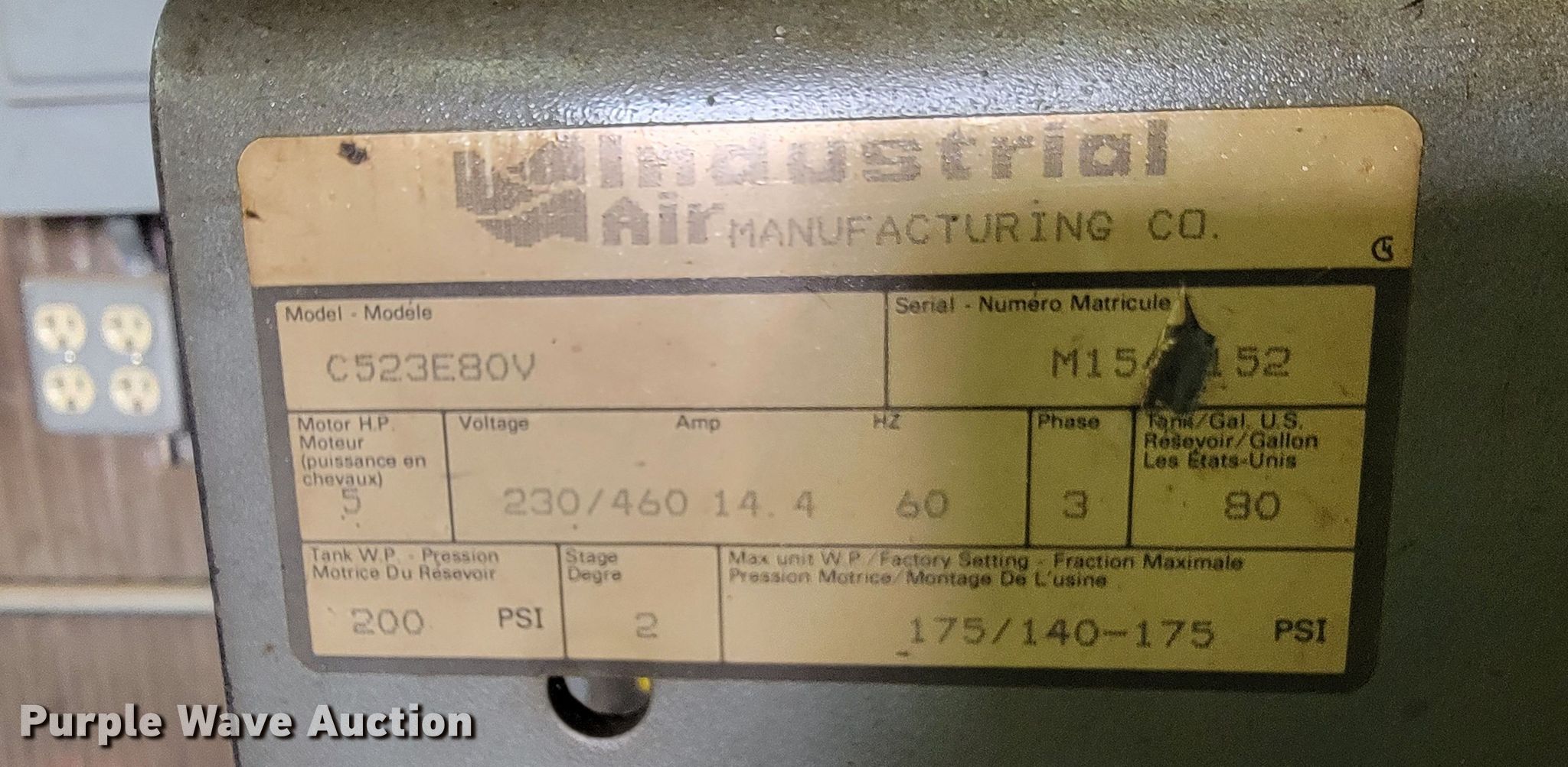 Purple Wave is selling a used Air Compressor in South Dakota. This item is a Industrial Air air compressor with the following: HP: 5, Volts: 230/460, Phase: Three
