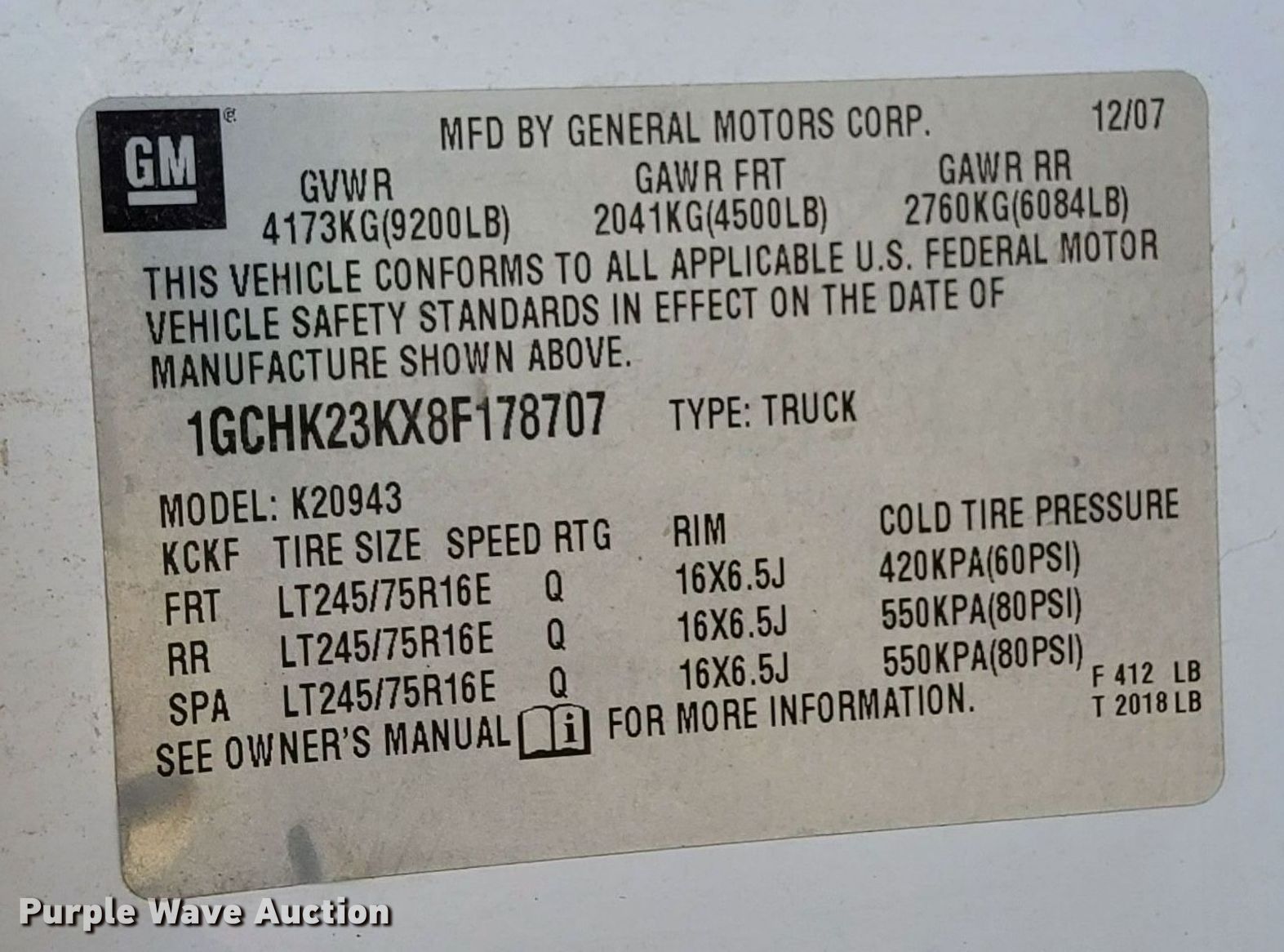 Purple Wave is selling a used 3/4 or 1 Ton Pickup or Van in Oklahoma. This item is a 2008 Chevrolet Silverado 2500HD Crew Cab pickup truck with the following: Miles: 106,134 on odometer, VIN: 1GCHK23KX8F178707, Unit #: 03