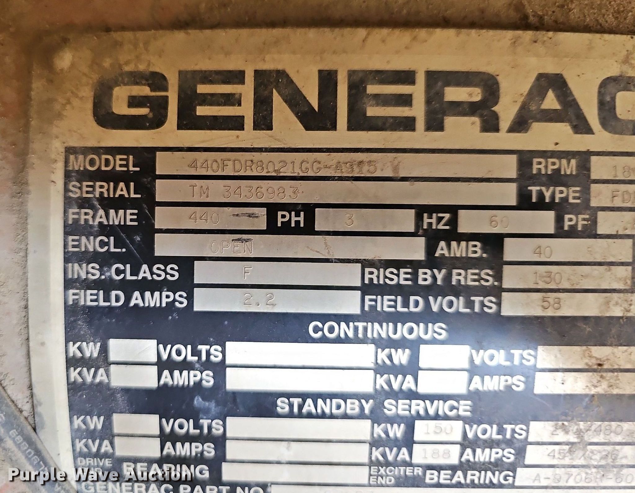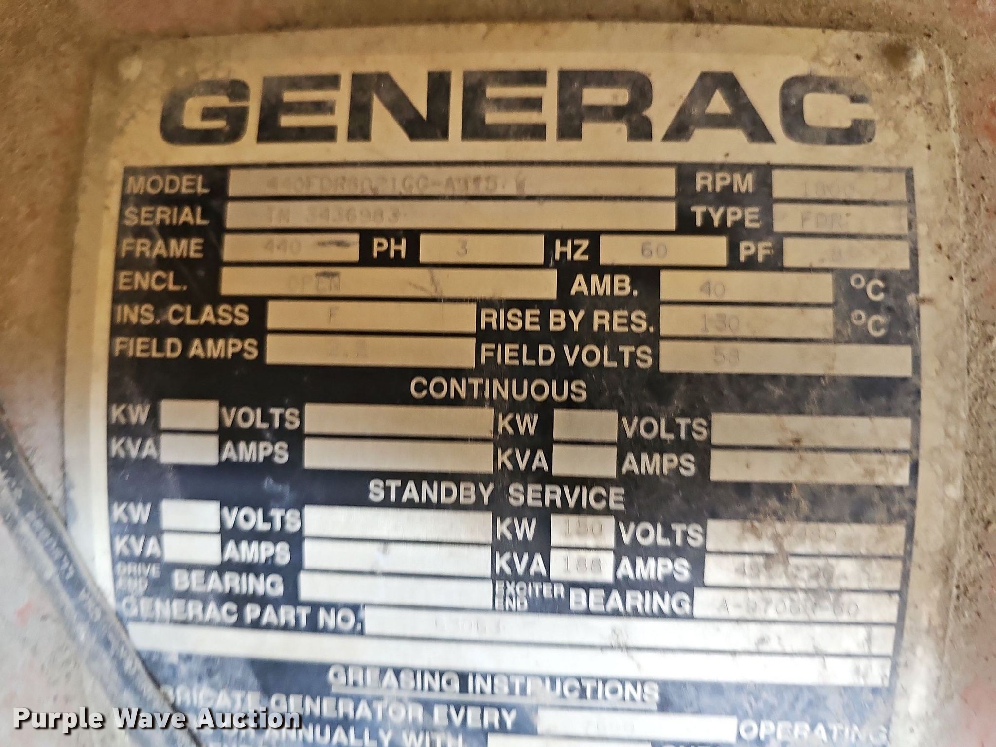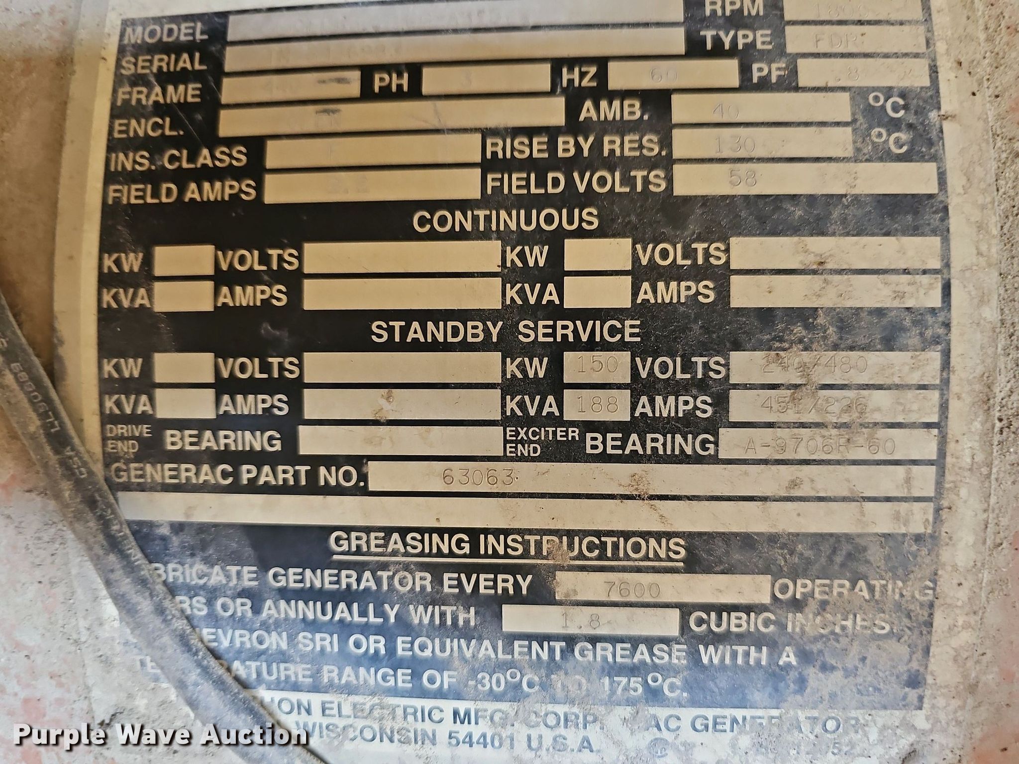 Generac 87A02574-S generator. Hours: 894 on meter, Serial: 6412. Engine Cylinders: 6, Fuel type: Diesel. Features Generator kVA: 187.5, kW: 150, Phase: Three, Electric start, Fuel tank, Skid mounted. Notes Unknown operating condition. City of Owasso, OK. 200 South Main Street. Owasso, OK 74055