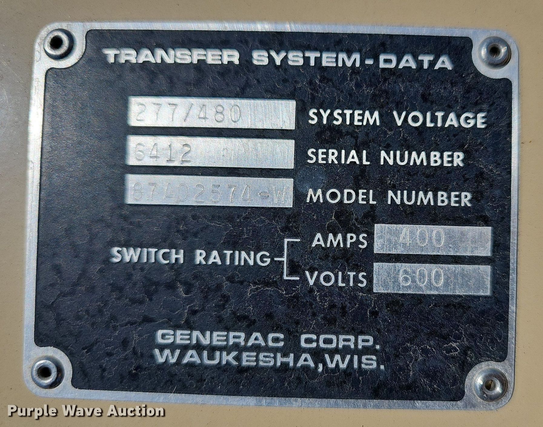 Purple Wave is selling a used Generator Set in Oklahoma. This item is a Generac 87A02574-S generator with the following: Hours: 894 on meter, Serial: 6412