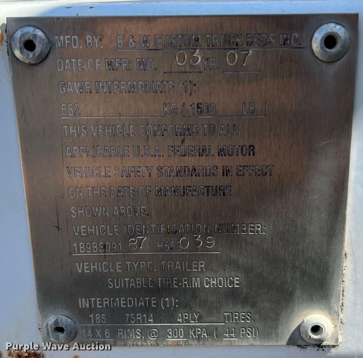 2007 B&W radar trailer. VIN: 1B9BS09187H659039. Dimensions Overall: 8' 6" L x 6' W. Chassis Ball hitch: 2", GAWR: 682 lbs. Tires Steel wheels, Size: 185/75R14. Notes Unknown operating condition. This is worksite support equipment and will not come with a title. Transfer of ownership documentation will be a bill of sale. City of New Braunfels. 3030 West San Antonio Street. New Braunfels, TX 78130
