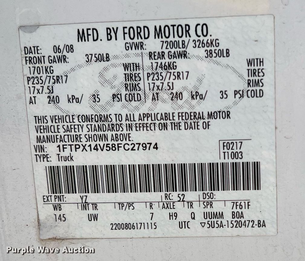 Purple Wave is selling a used 1/2 Ton Pickup or Van in Texas. This item is a 2008 Ford F150 XL SuperCab pickup truck with the following: Miles: 92,817 on odometer, VIN: 1FTPX14V58FC27974, Unit #: 51105