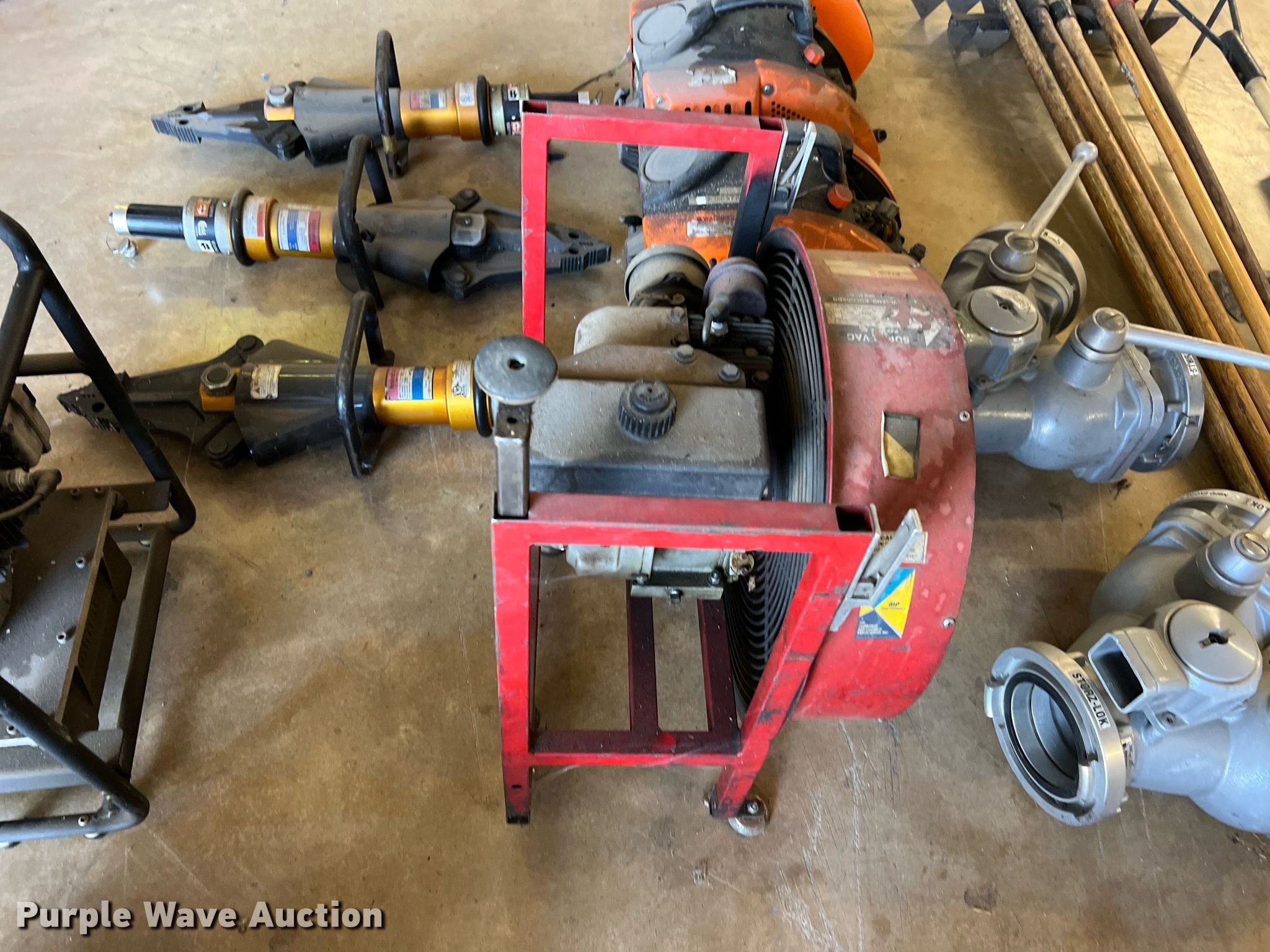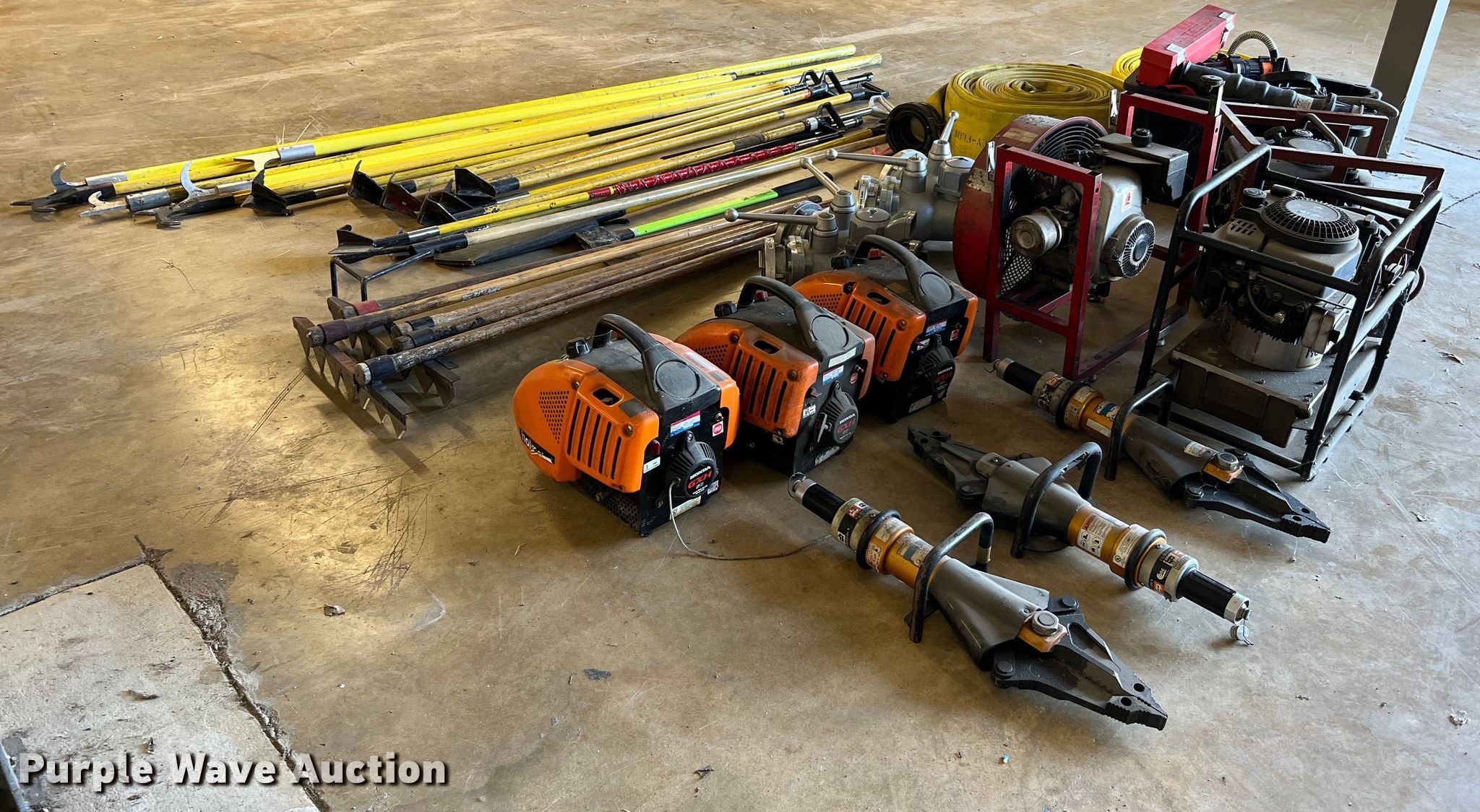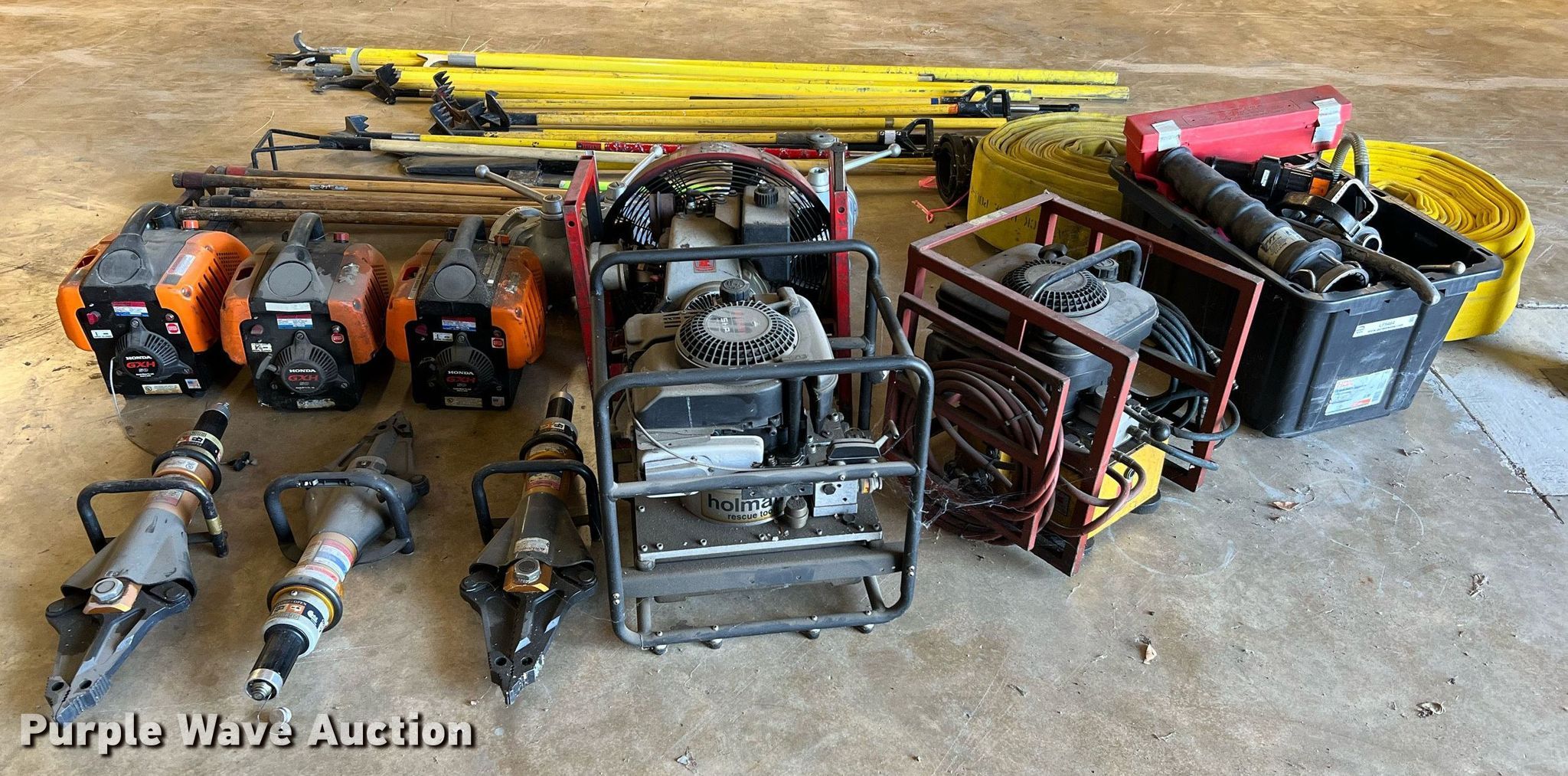 Purple Wave is selling a used Tools in Texas. This item is a Fire rescue equipment with the following: (3) rescue jaws, (3) Honda GXH 50 power units, Holmatrol rescue power unit, Amkus rescue power unit, (2) 5" diameter fire hoses, (2) water valve sets and more