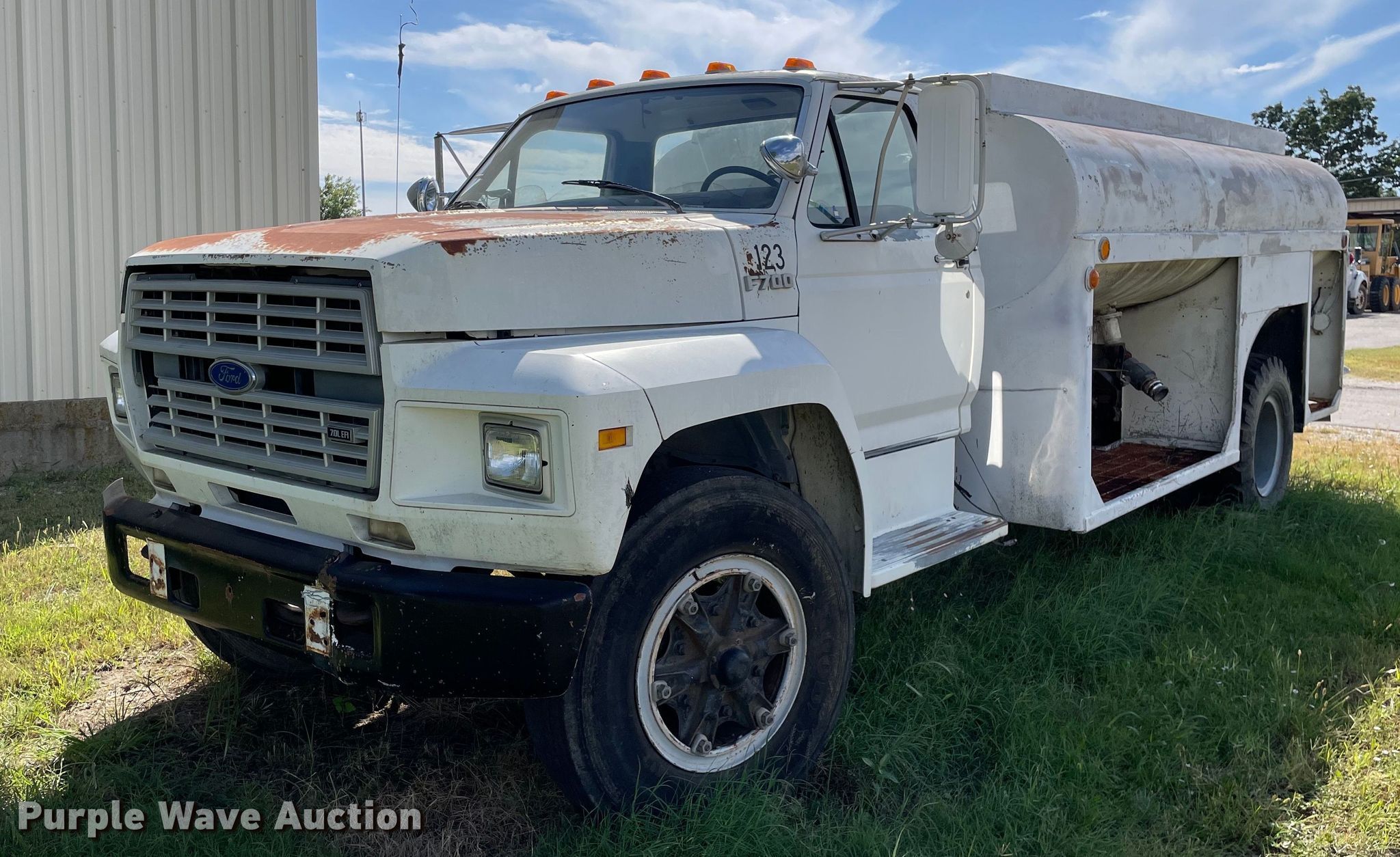 Purple Wave is selling a used Tank Truck or Water Truck in Kansas. This item is a 1991 Ford F700 tank truck with the following: Miles: 75,693 on odometer, Hours: 2,590 on meter, VIN: 1FDPF70JXMVA33364, Unit #: 123