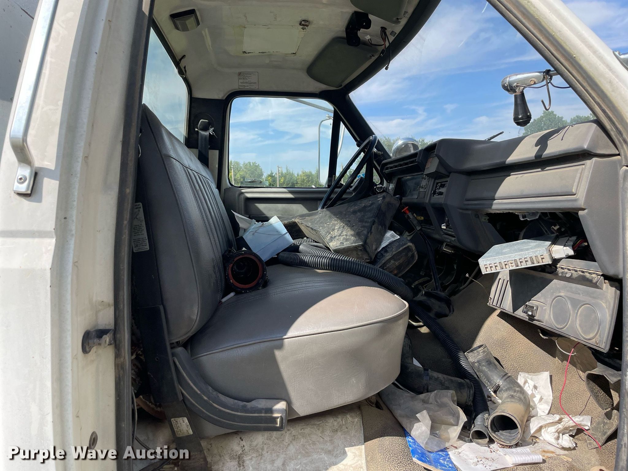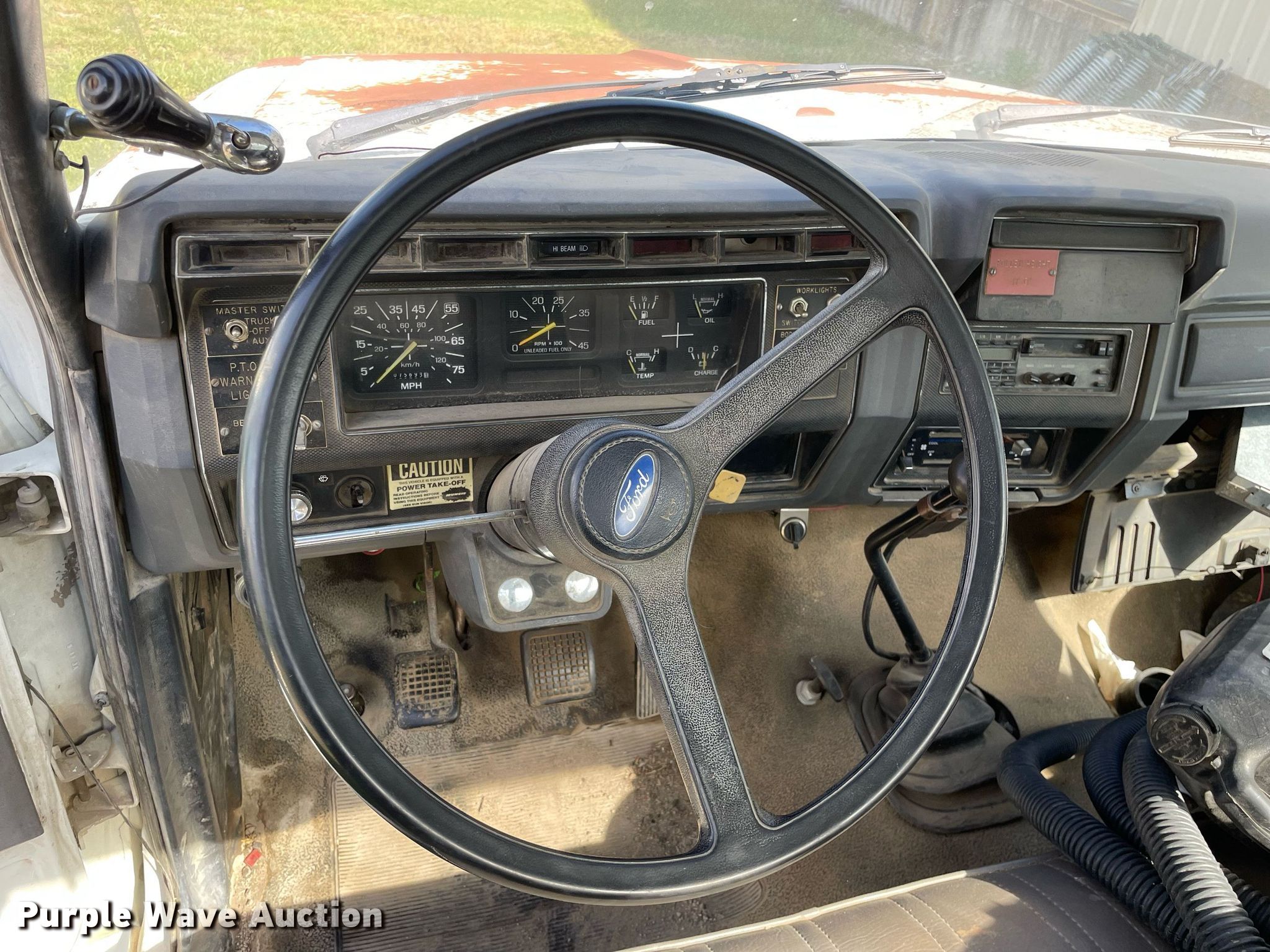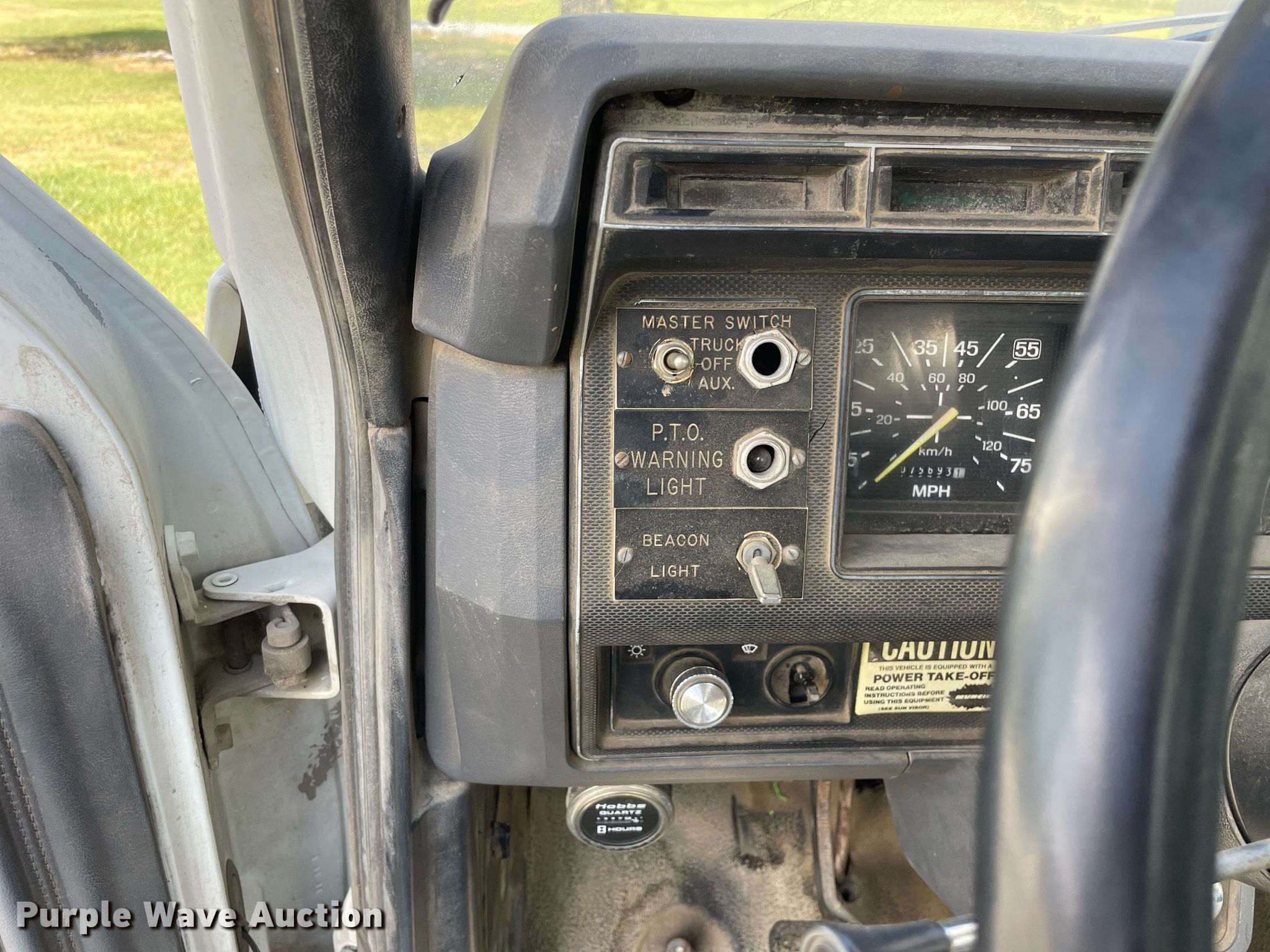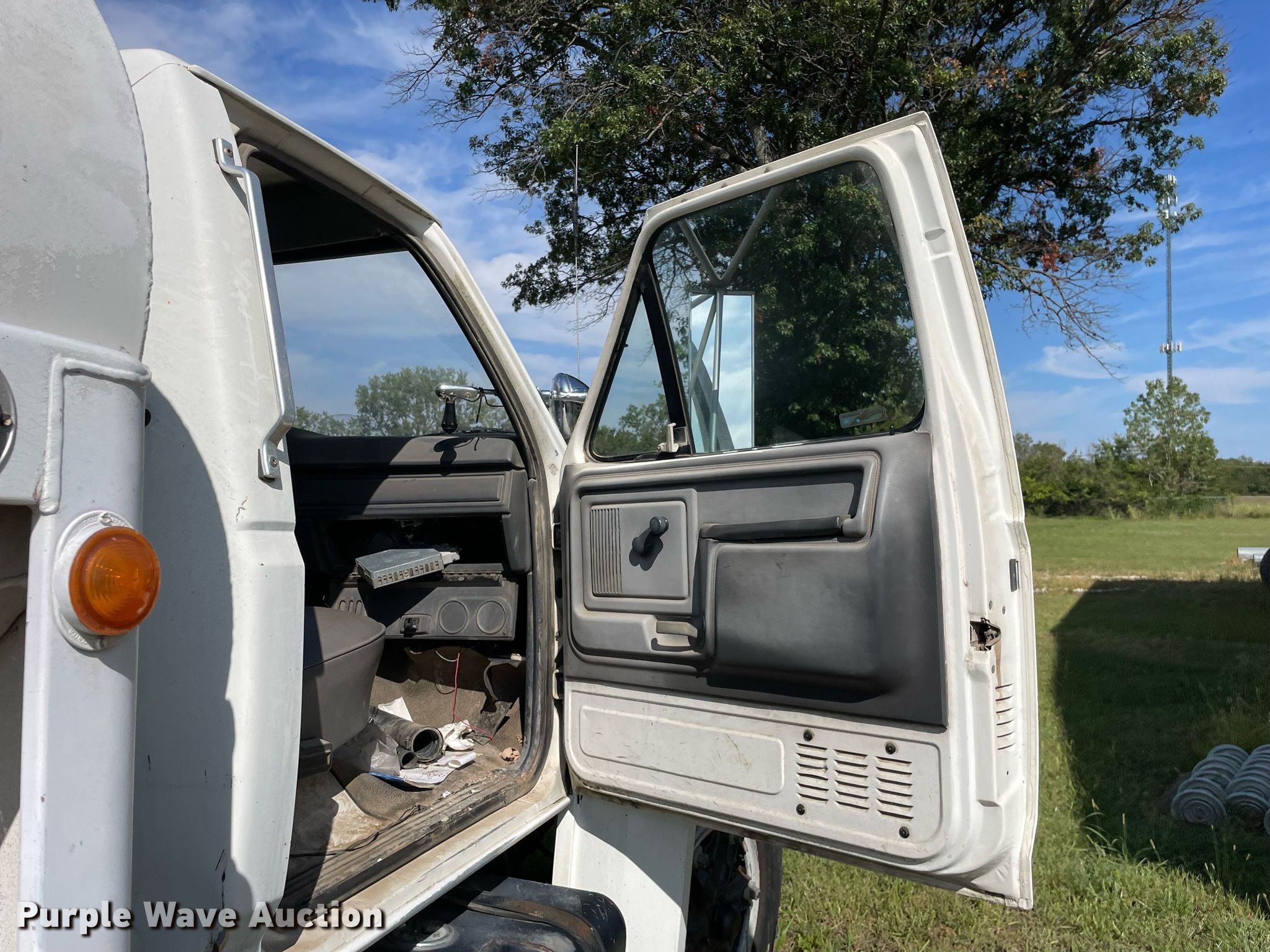 1991 Ford F700 tank truck. Miles: 75,693 on odometer, Hours: 2,590 on meter, VIN: 1FDPF70JXMVA33364, Unit #: 123. Engine Displacement: 7.0L, Cylinders: 8, Fuel type: Gas. Transmission Manual, Speed: 5, plus 2. Chassis Axles: Single, Suspension: Spring, Brakes: Hydraulic, PTO, GVWR: 30,000 lbs. Interior Heat. Features Bed / tank 16' L x 92" W, Spray bar: Rear, Top fill, Rear outlet: 3". Tires Front: 10R20, Rear: 10.00-20. Notes Wiring harness burnt , Unit will need to be towed or hauled, Non-operational unit. Kansas title. Title distribution may be delayed up to 14 days from verification of funds. City of Chanute, KS. Chanute, KS 66720