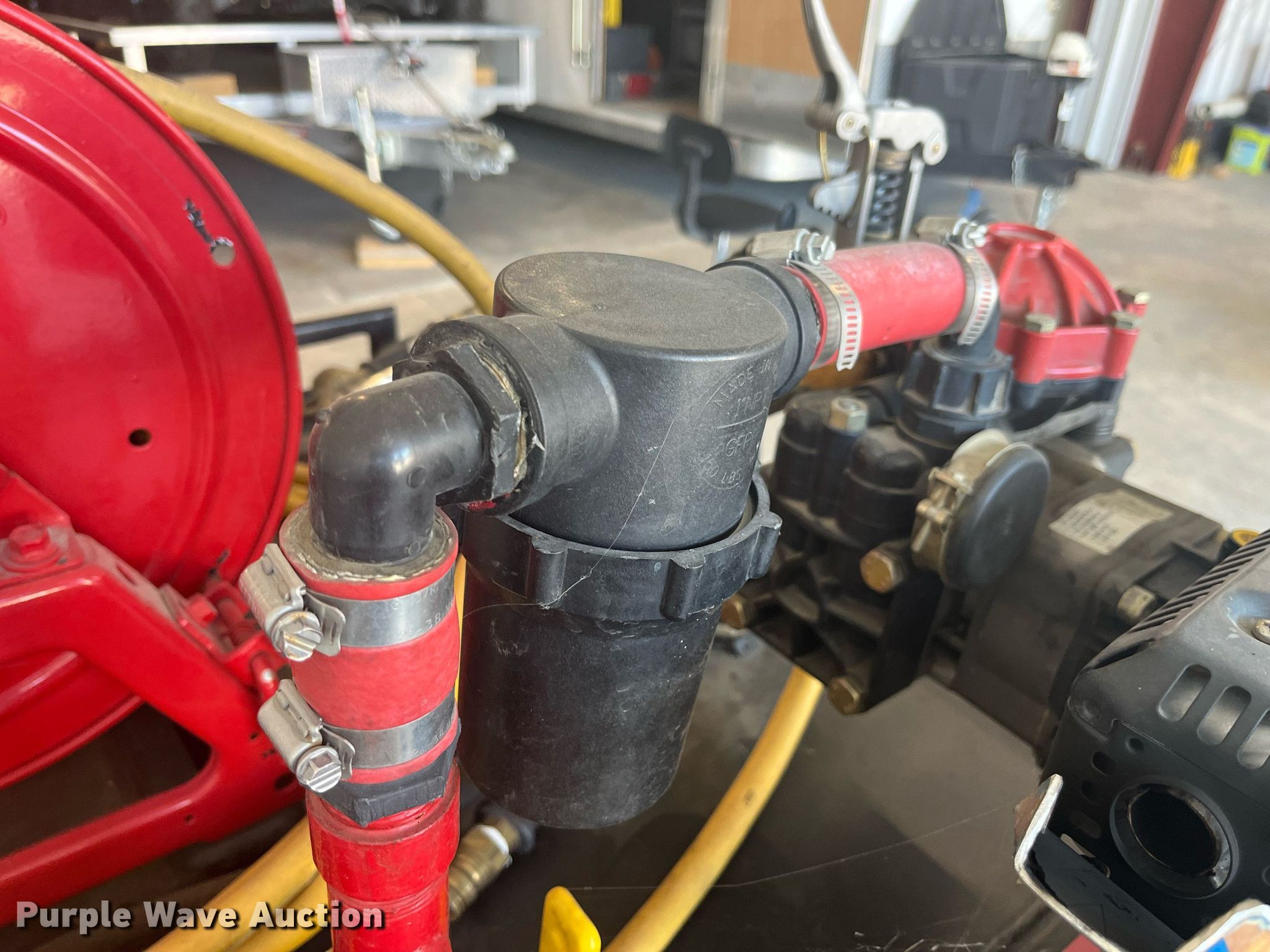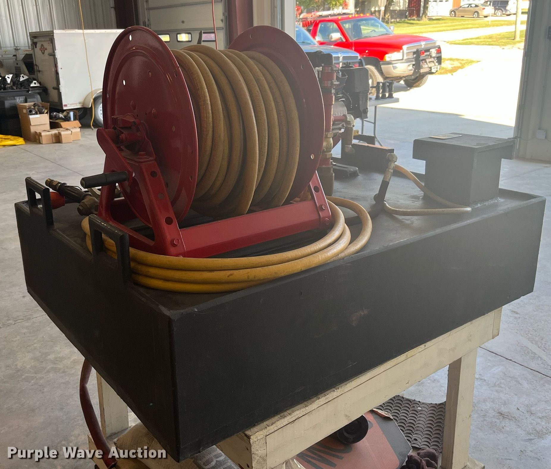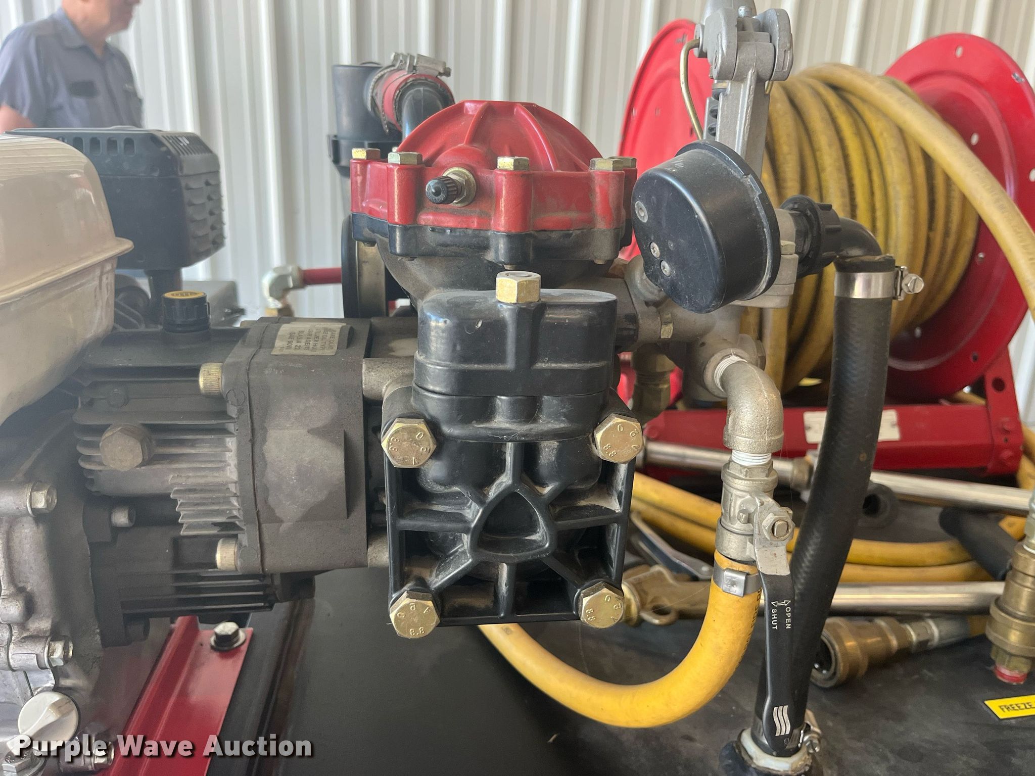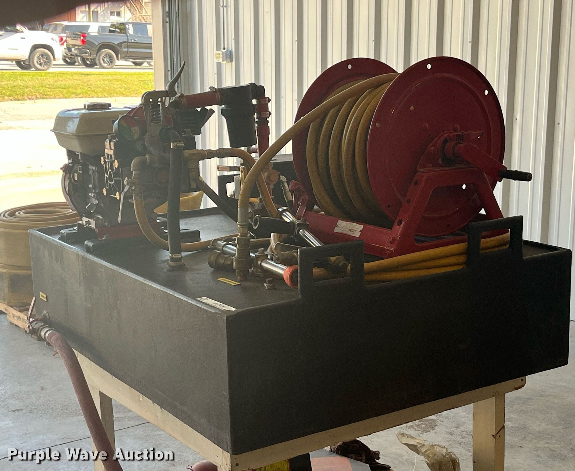 Brush fire skid unit. Serial: MAR2228. Engine Honda GX160, Displacement: 163 cc, Cylinders: 1, Fuel type: Gas. Features Steel tank Capacity: 90 gallons, Hypro D30GRGI pump, Hannay 1520-17-18 hose reel, 1/2" diameter hose, (2) spray nozzles. City of Cameron, MO. 101 West 2nd. Cameron, MO 64429