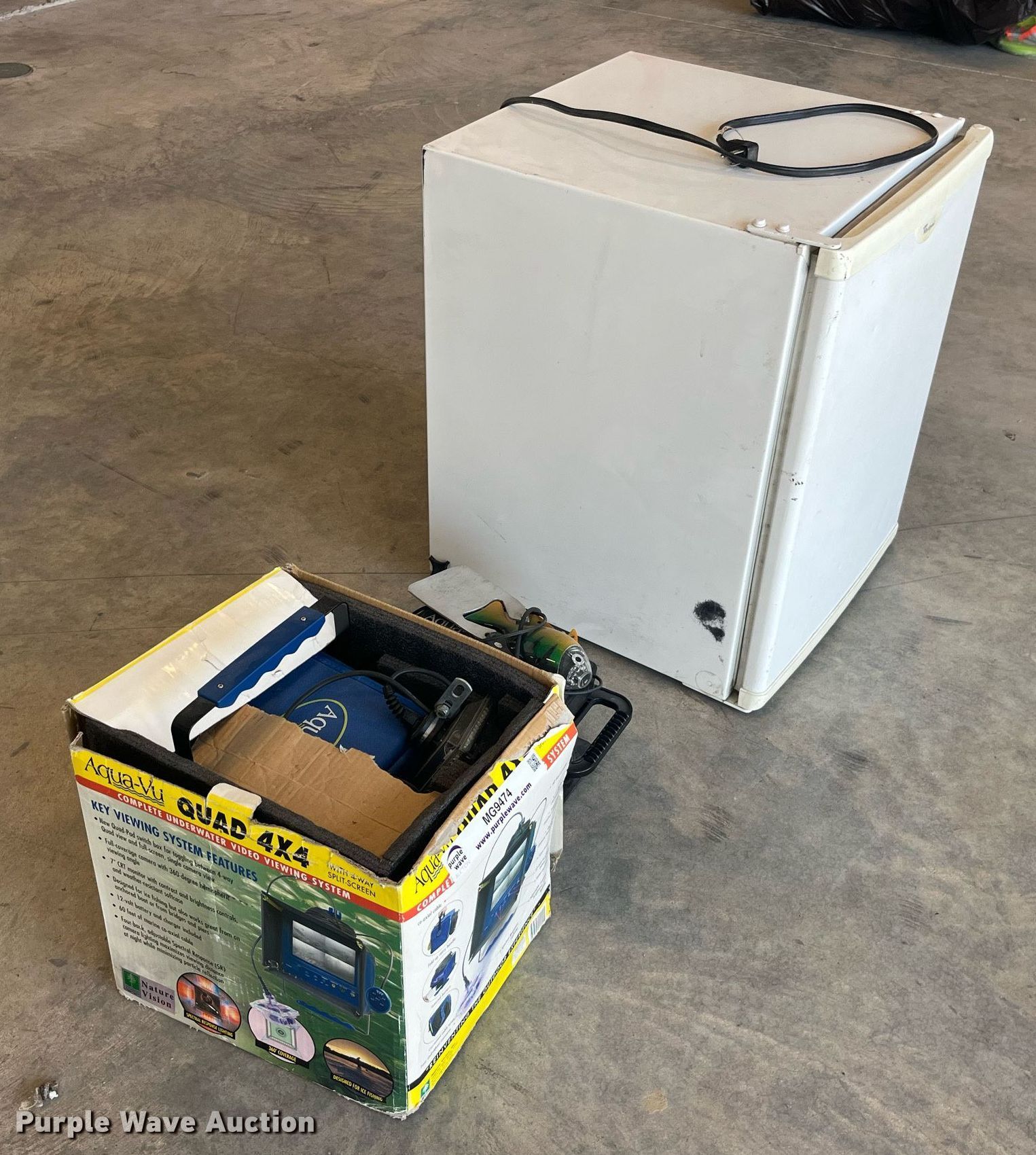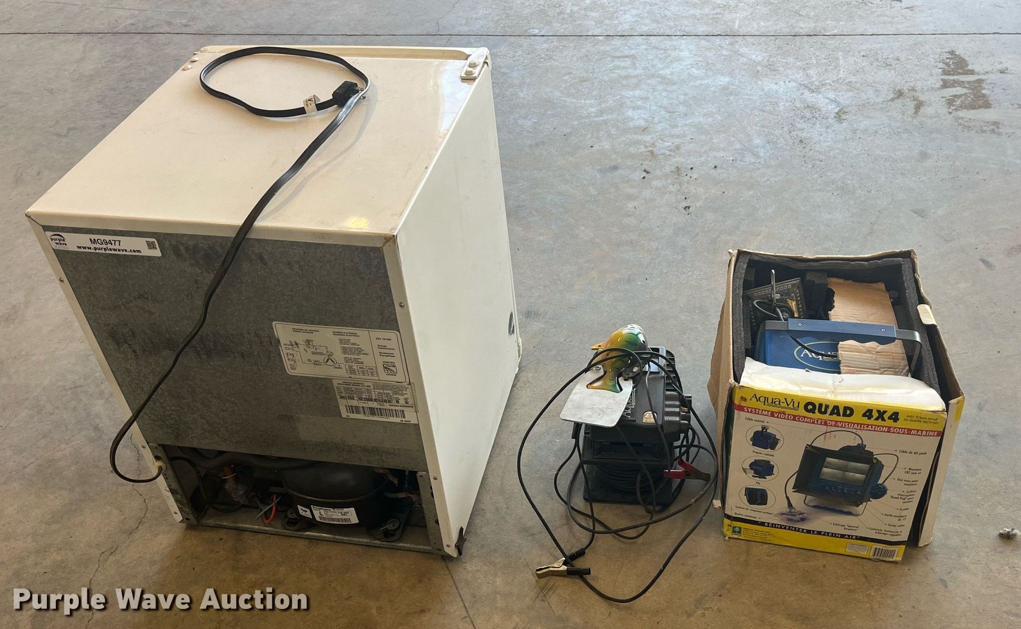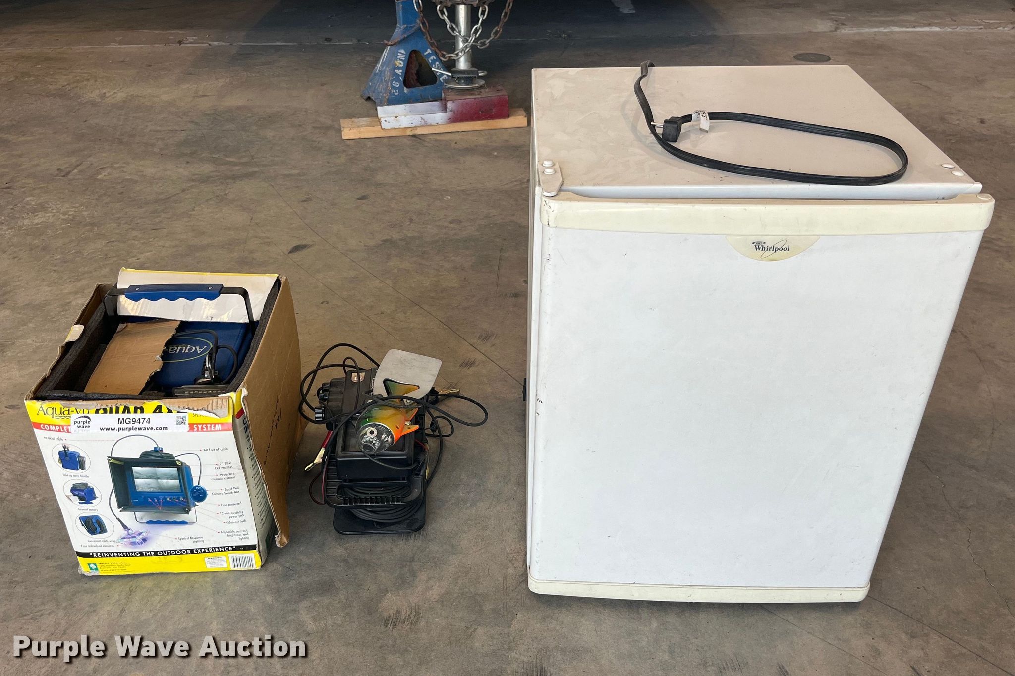 Purple Wave is selling a used Sporting Goods in Missouri. This item is a Sporting goods with the following: Aqua-Vu fish finder, Monitor, Volts: 12, Aqua-Vu Quad 4x4 fish finder, 7" monitor, Whirlpool EL03CCXJW mini refrigerator, Capacity: 2.8 cu.ft., Volts: 115