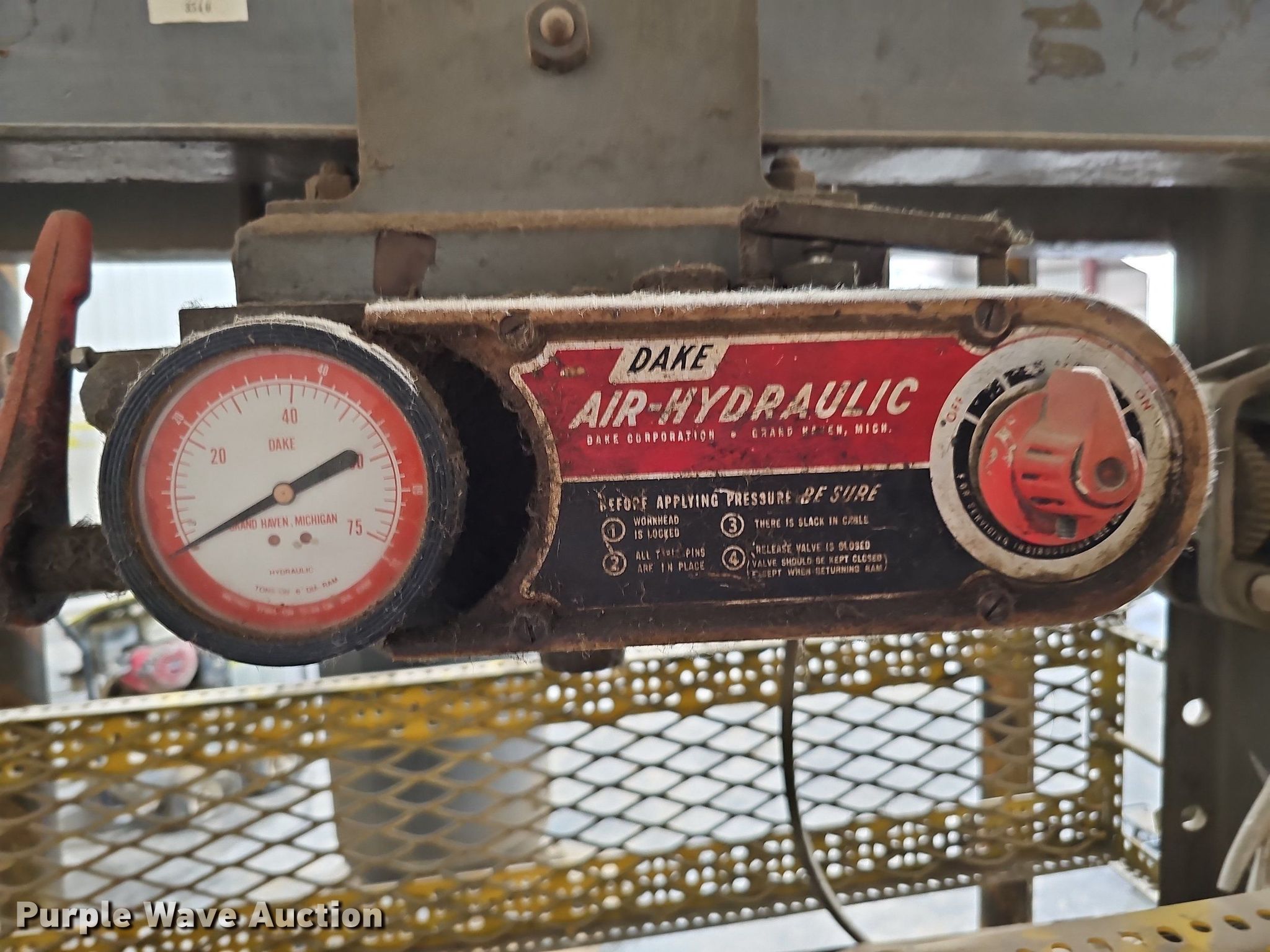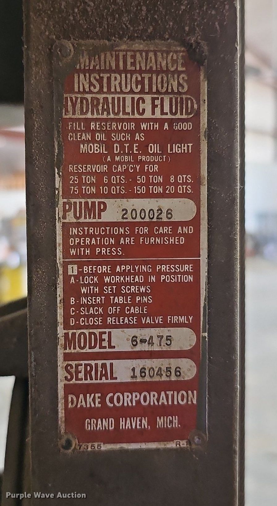 Purple Wave is selling a used Tools in Missouri. This item is a Dake 6-475 hydraulic press with the following: Serial: 160456, 54"L x 24"W x 78"H, Unknown operating condition