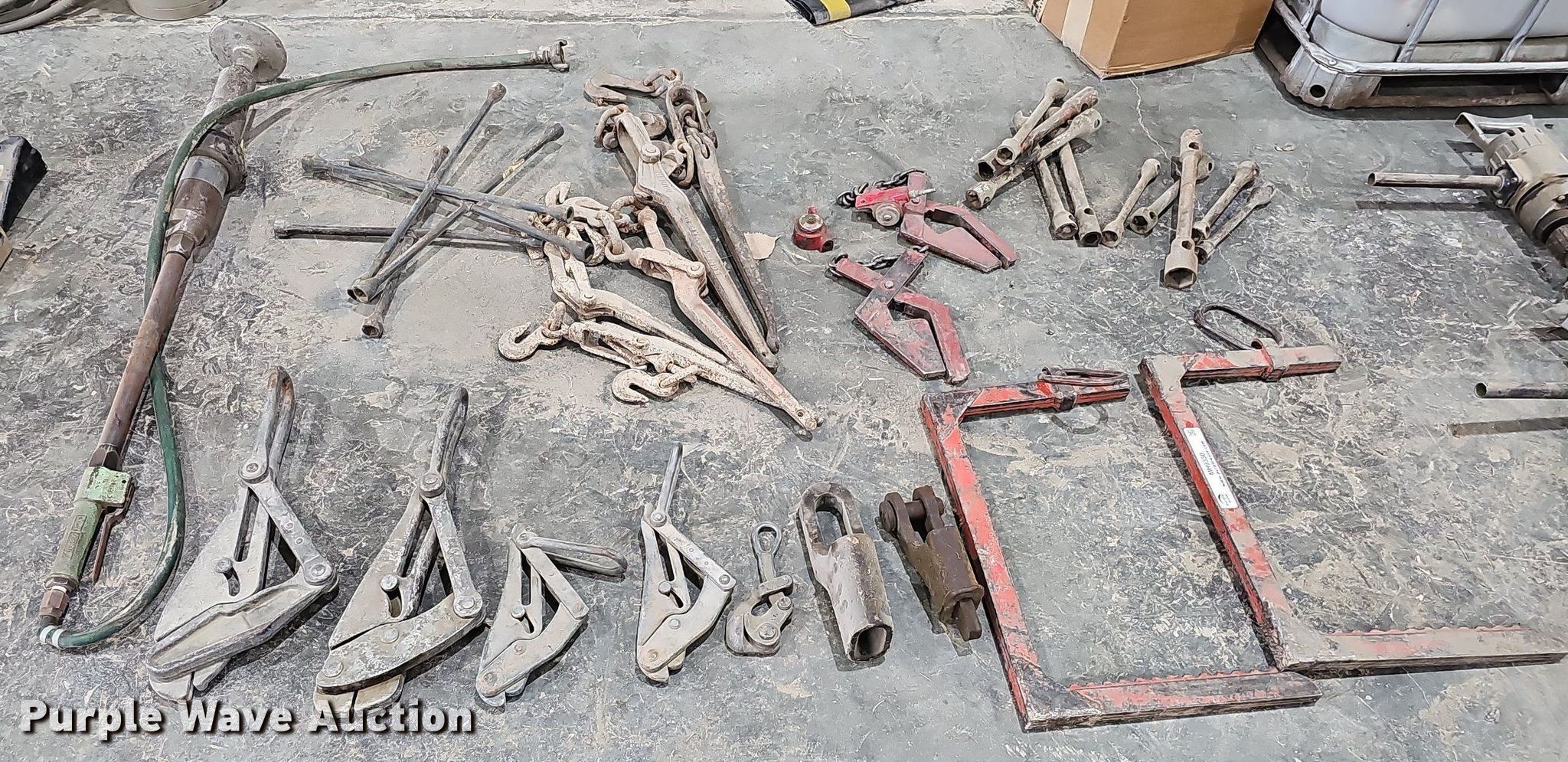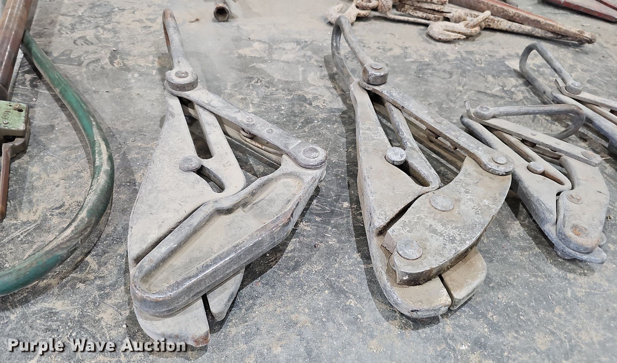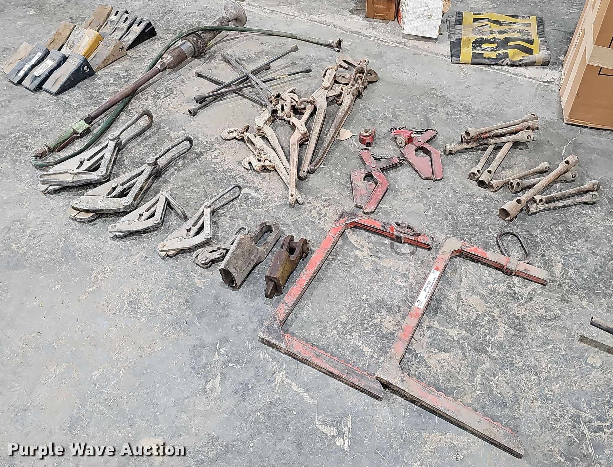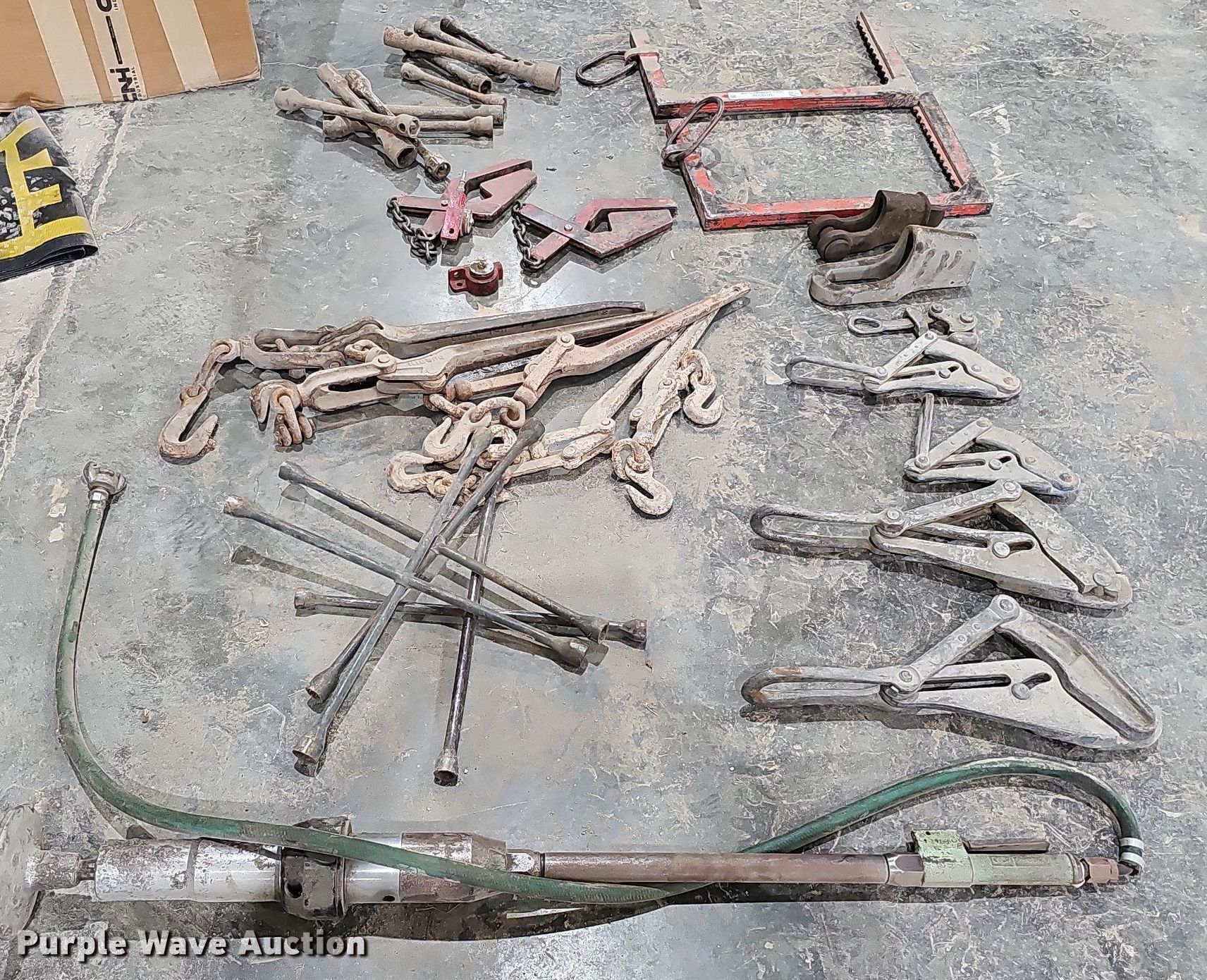 Purple Wave is selling a used Tools in Missouri. This item is a Tools with the following: (2) 22"L C pipe carriers, (10) two way wrenches, (3) four way wrenches, (5) chain boomers, (5) clamp jaws 8.5" to 20"L, MF-15 48"L air jack