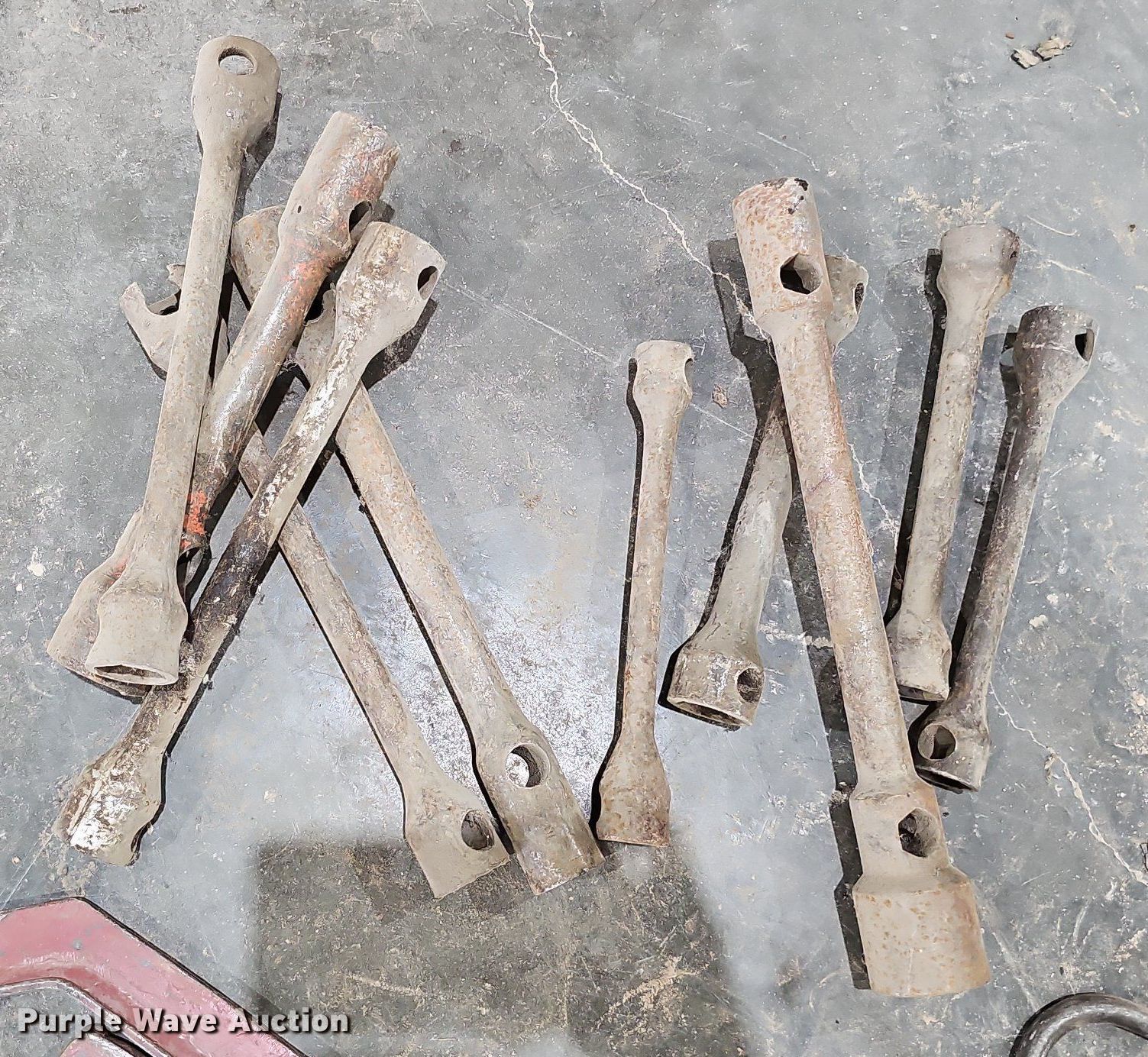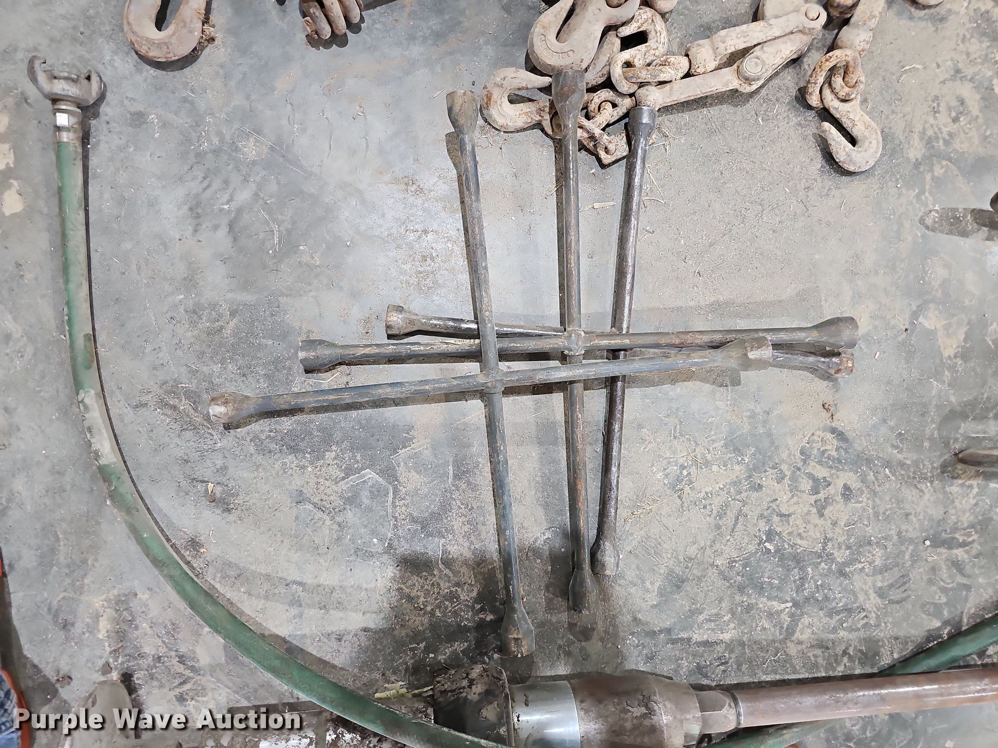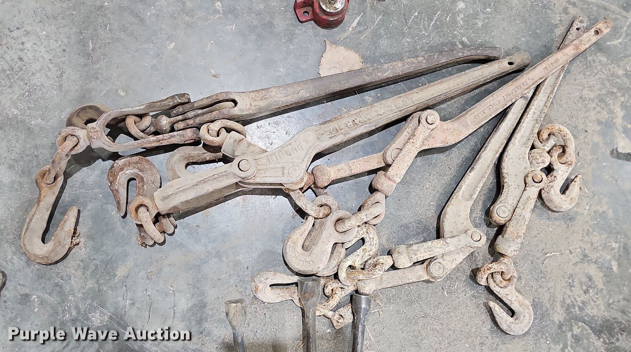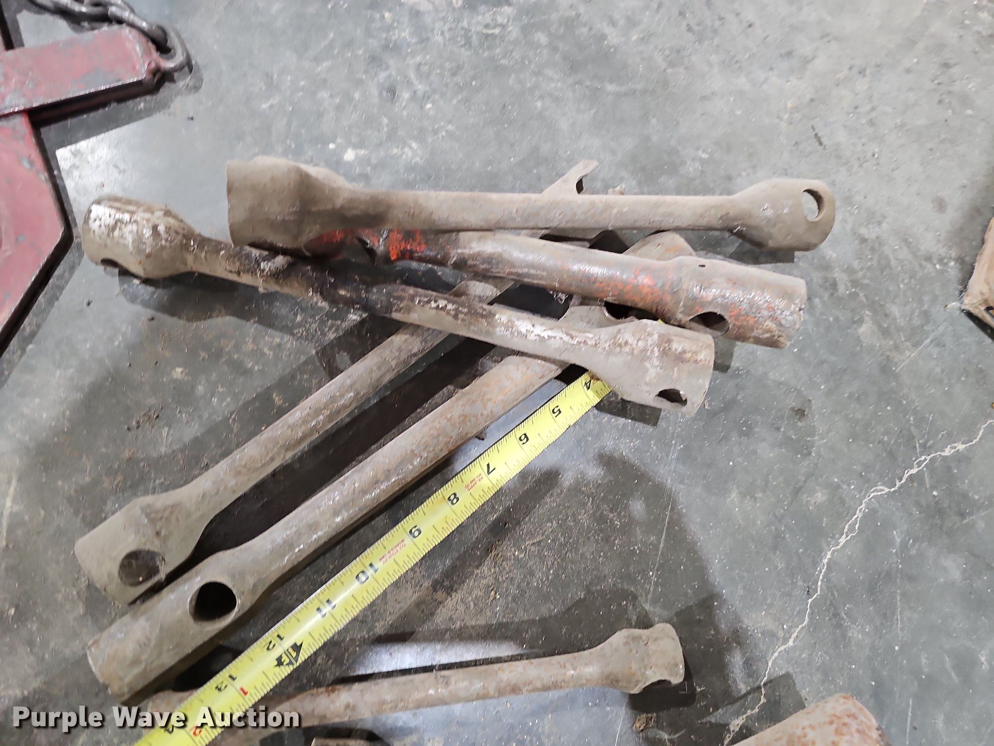 Purple Wave is selling a used Tools in Missouri. This item is a Tools with the following: (2) 22"L C pipe carriers, (10) two way wrenches, (3) four way wrenches, (5) chain boomers, (5) clamp jaws 8.5" to 20"L, MF-15 48"L air jack