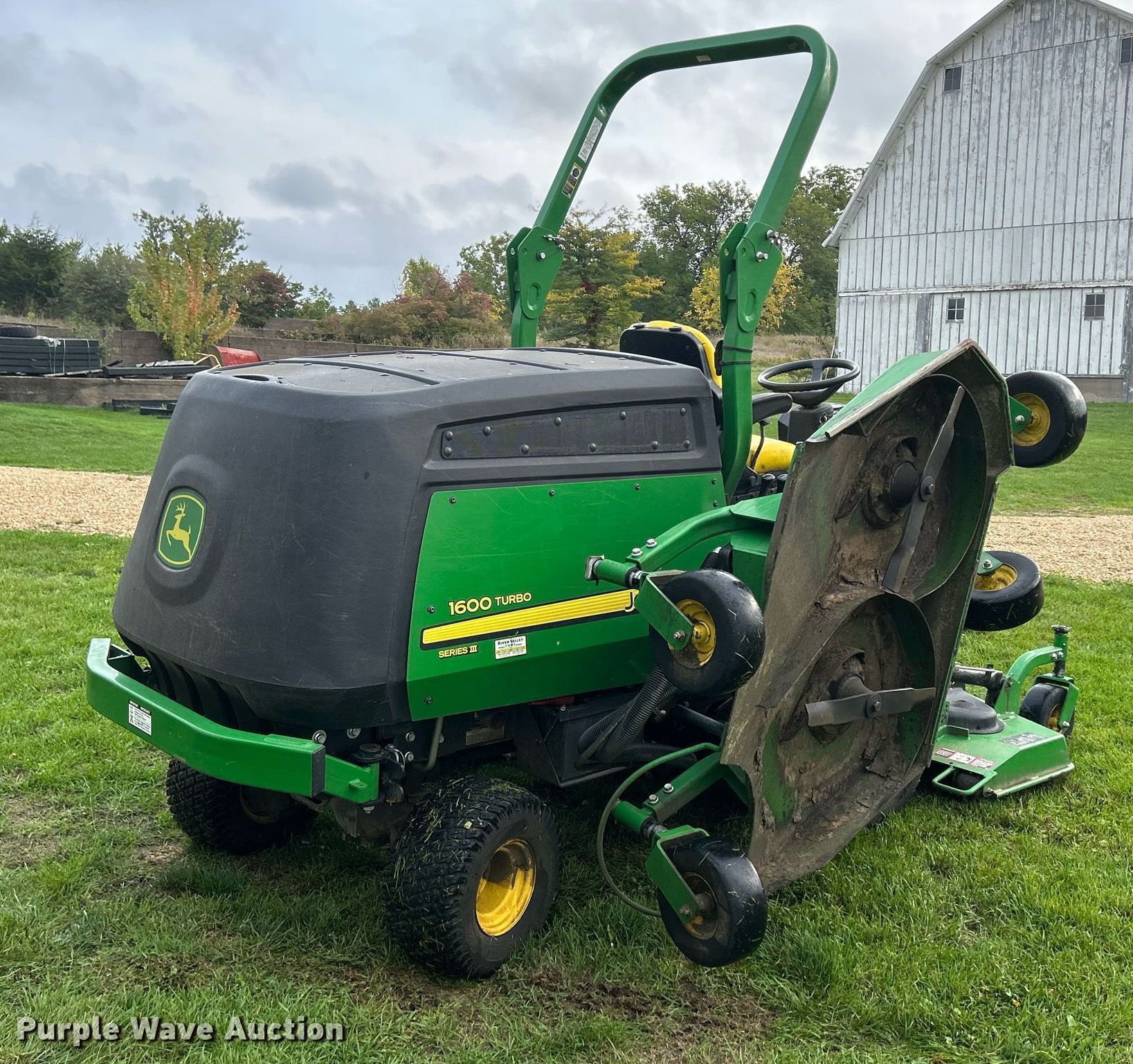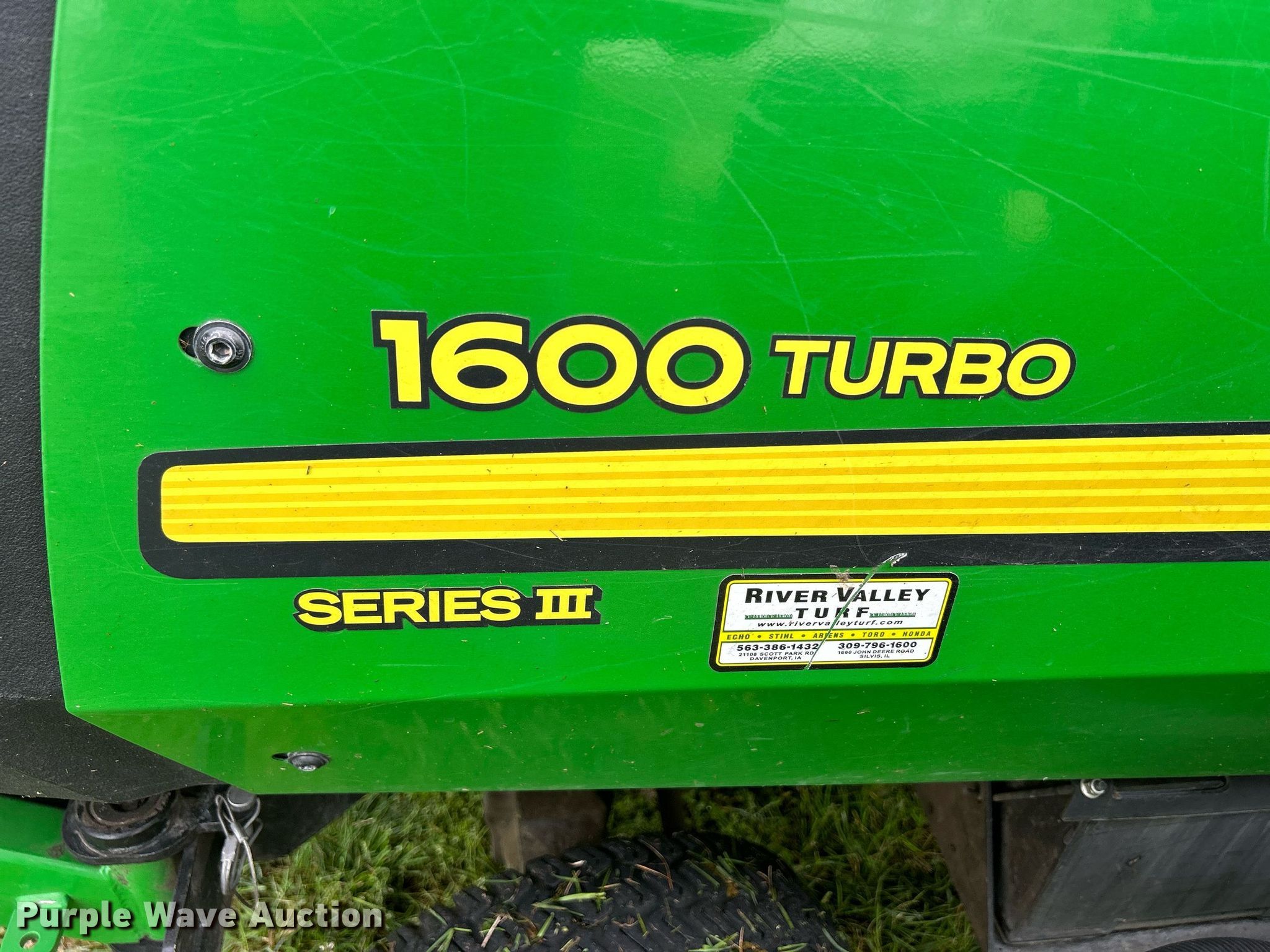 Purple Wave is selling a used Commercial Turf Mower in Iowa. This item is a John Deere 1600 Turbo Series III lawn mower with the following: Hours: 1,387 on meter, Cutting width: 120", Serial: 1TC1600TLLH650023